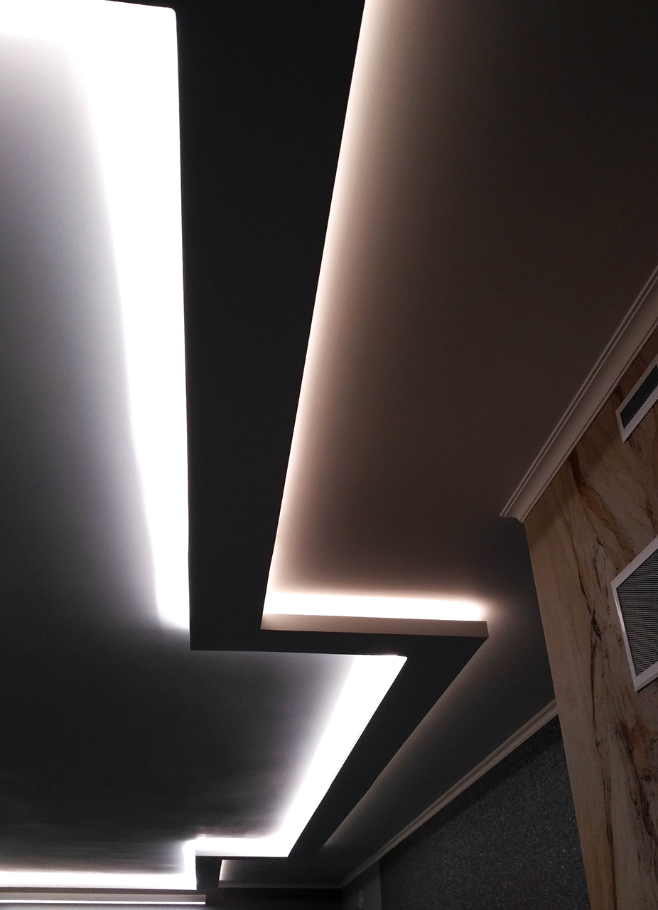 Светодиодная лента Arlight установлена в ниши гипсокартонной конструкции, там же расположены и скрытые от глаз источники питания, к которым при этом сохранён удобный доступ. Последний пункт важен, т.к. срок службы светодиодной ленты гораздо дольше и есть вероятность необходимости замены блоков питания через несколько лет.
