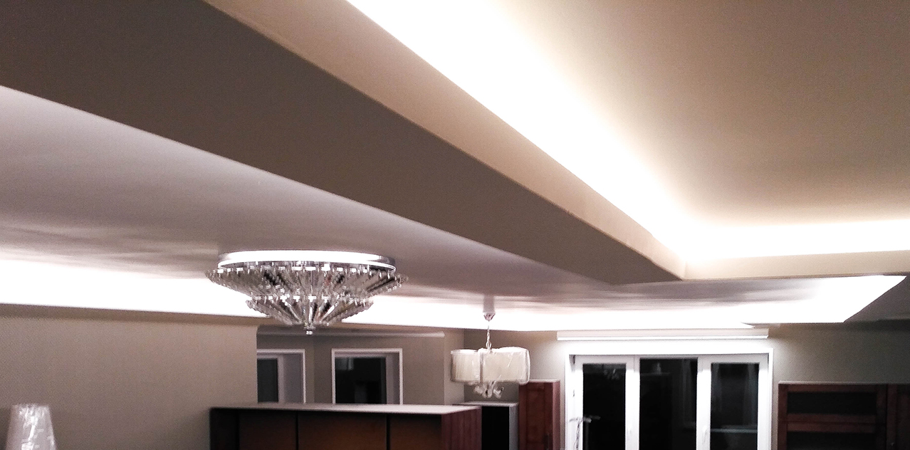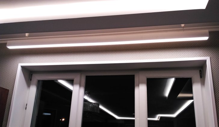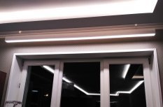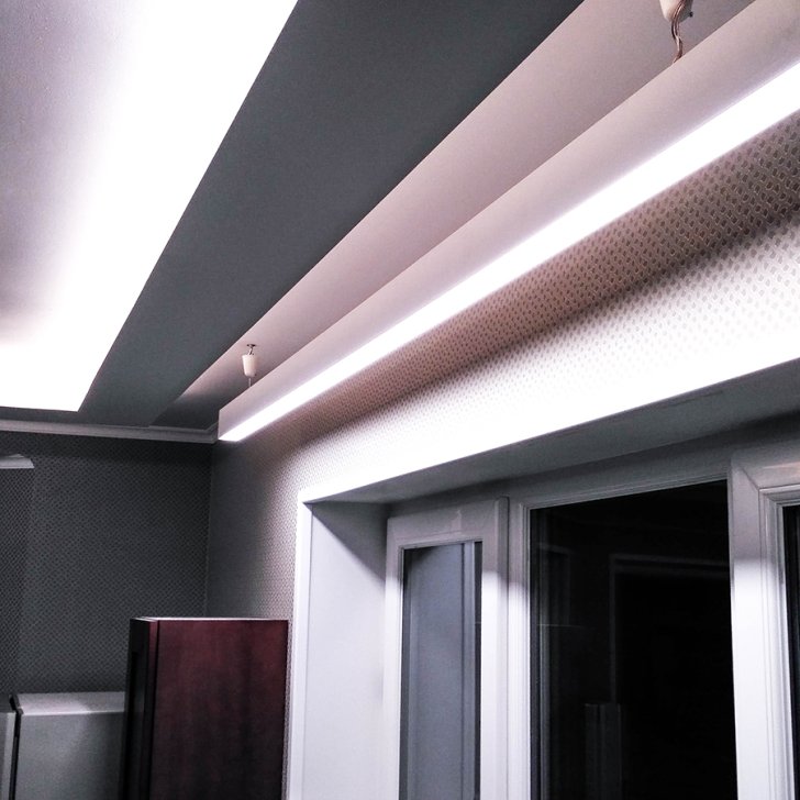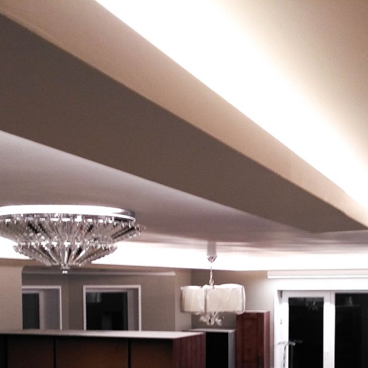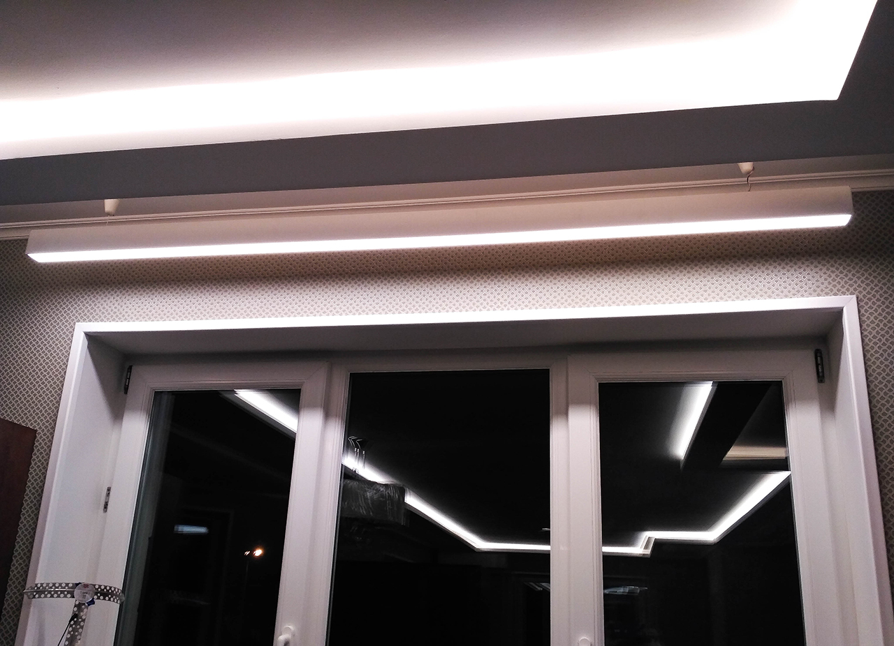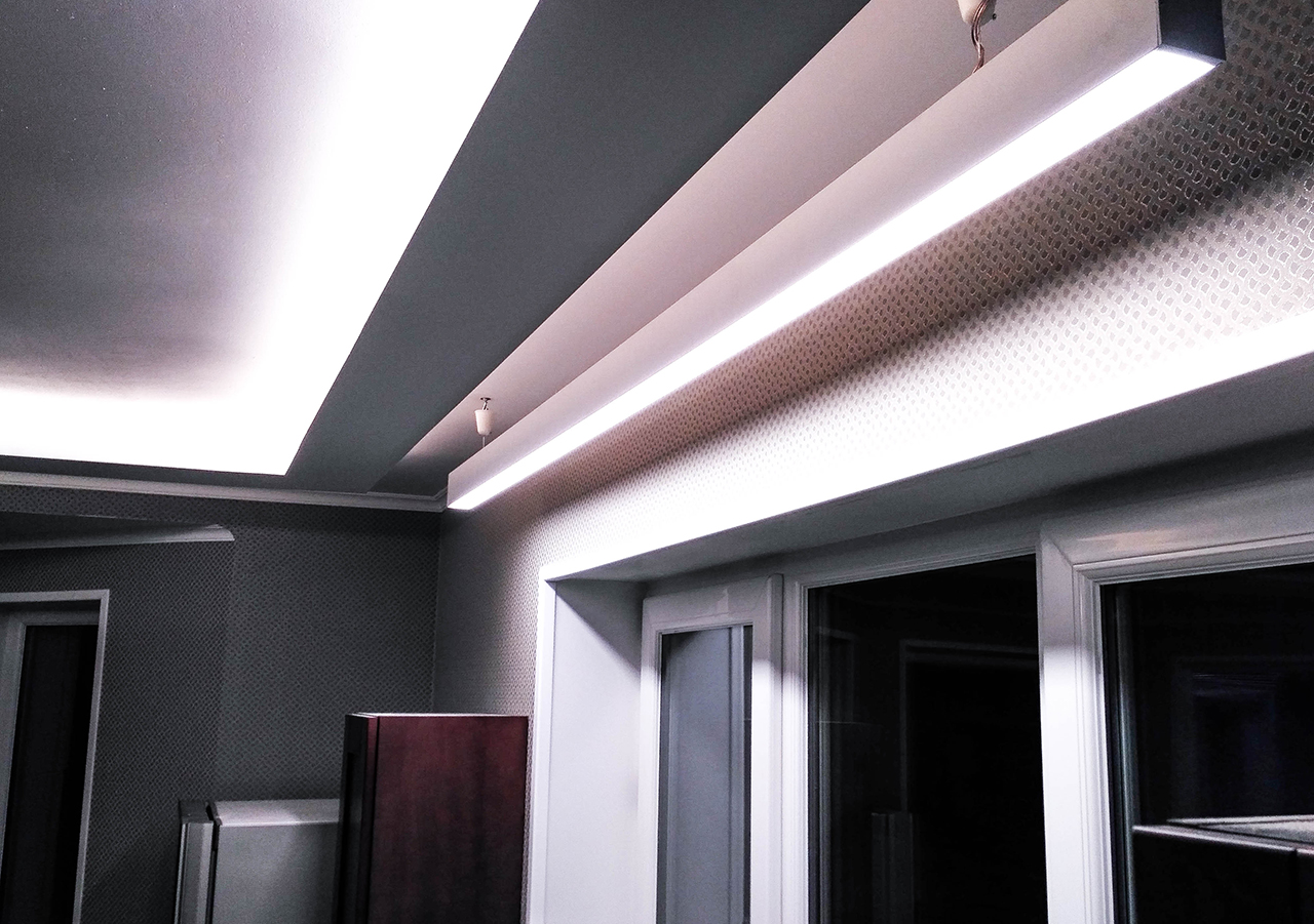 На кухне в качестве дополнительного освещения был установлен линейный подвесной светильник, выполненный на базе алюминиевого профиля. Т.к. к нему было подведено напряжение 220 В, а светодиодная лента в светильнике нуждалась в 24 В, был выбран профиль, в котором предусмотрен отсек для блока питания.