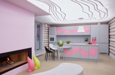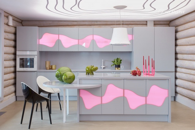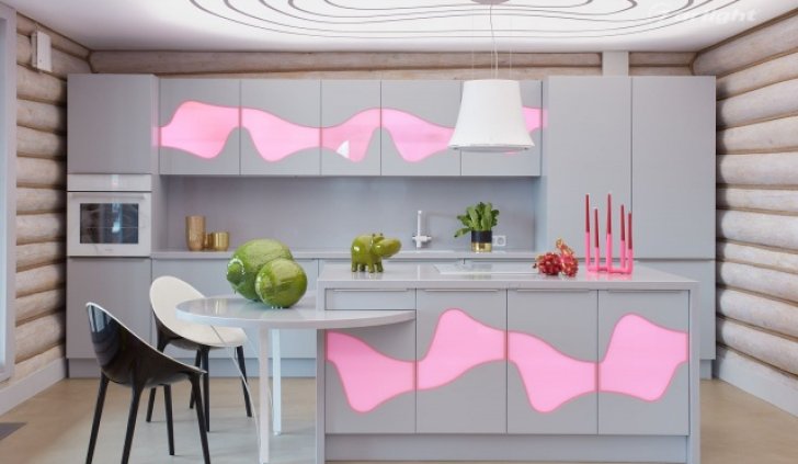 Также светодиодная подсветка установлена внутри кухонных шкафов, что при наличии полупрозрачных цветных участков, превращает их в оригинальные светильники розового цвета.