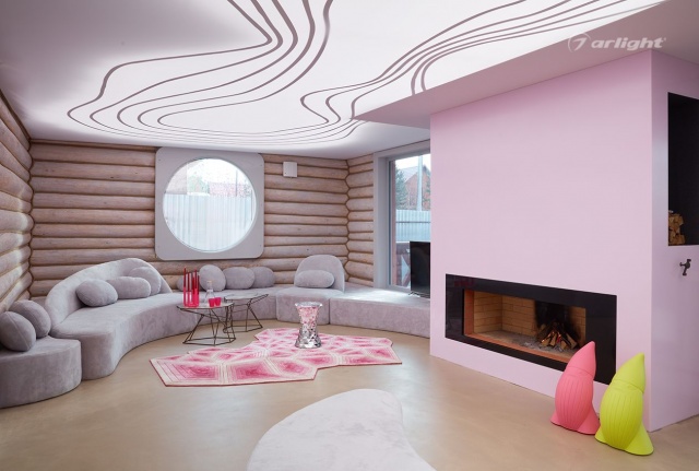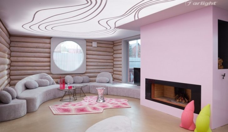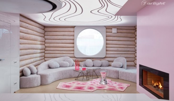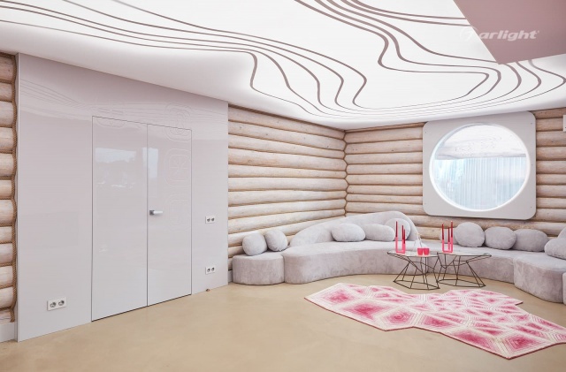 Одним из акцентов интерьера является потолок, который также выполняет роль основного освещения. На нём нанесён рисунок из линий, который частично повторяет светодиодная лента, наклеенная за полотном потолка. Грамотный светотехнический расчёт позволяет реализовать фантазию дизайнера, где внутренняя часть потолка равномерно засвечена, но при этом остаются затемнёнными углы.