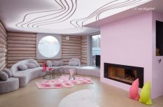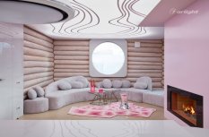 В рамках телепередачи "Дачный ответ" был реализован довольно смелый и креативный проект кухни-гостиной. Стены, выполненные из сруба, дизайнеры сочетают с футуристическими формами мебели яркими и неожиданными цветами.