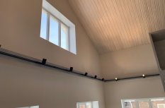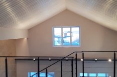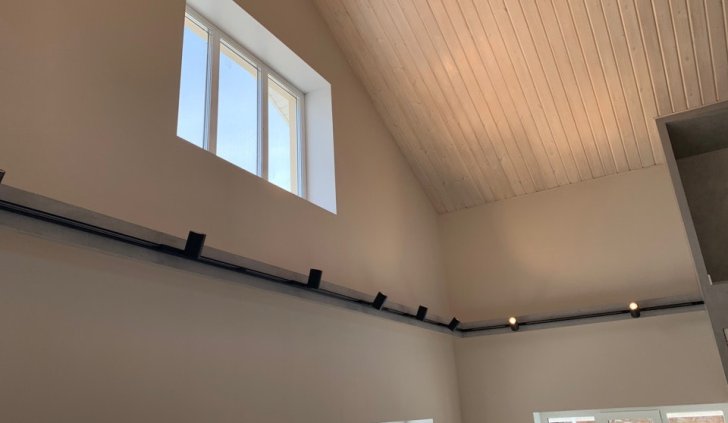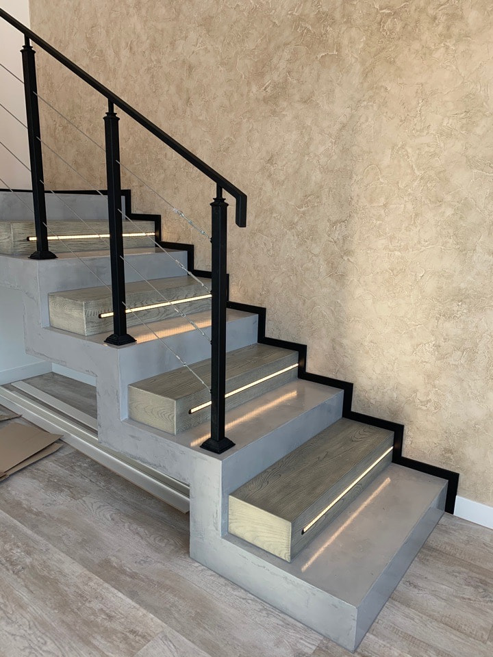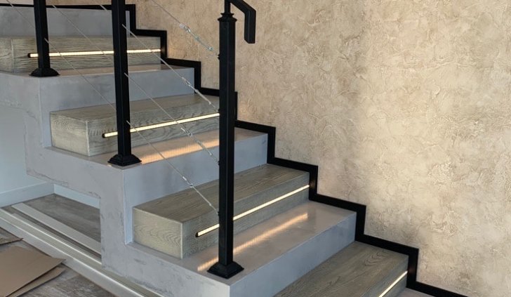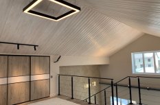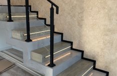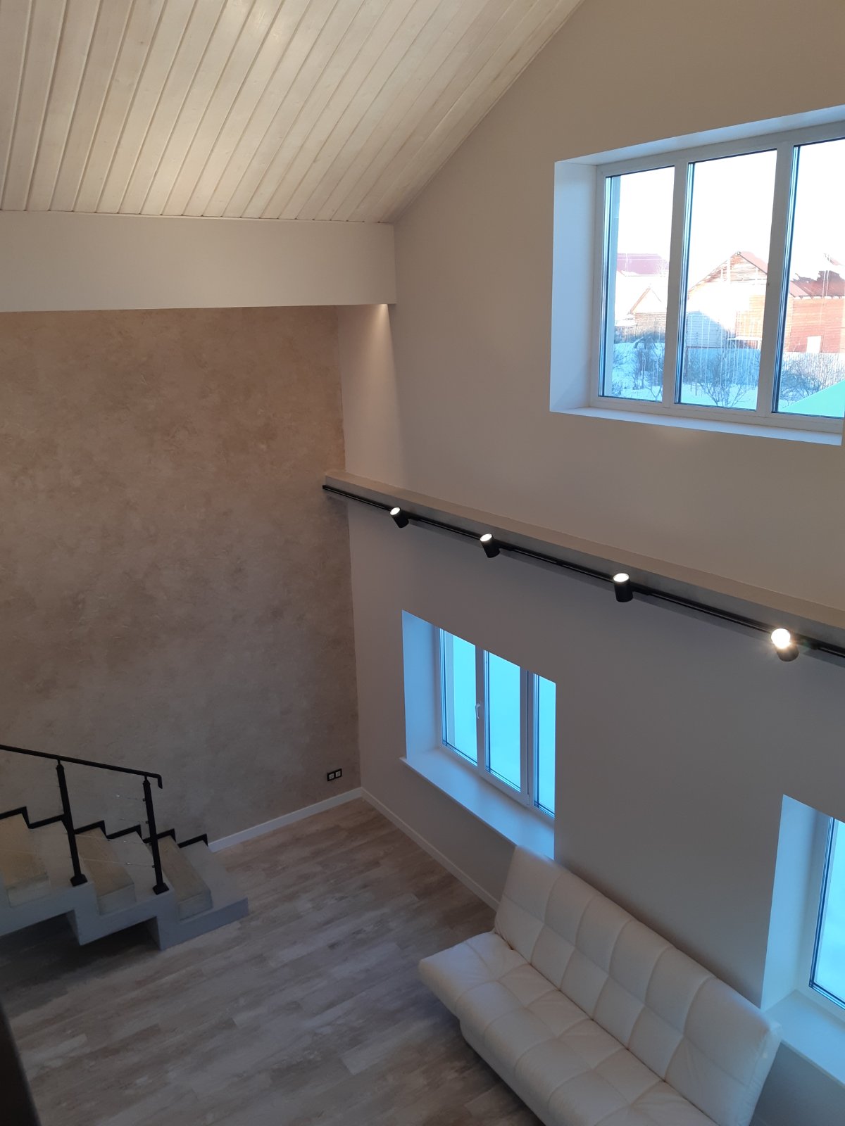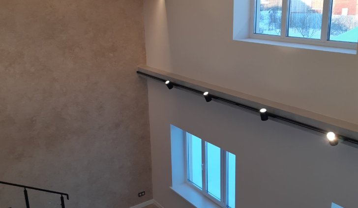 На одной из стен разместили профильный светильник с регулируемым углом излучения света, что позволило создать интересные световые акценты в интерьере. В спальне был установлен светильник с теплым мягким свечением, которое способствует созданию уютной атмосферы и комфортной обстановки. Для подсветки ступеней лестницы был использован узкий профиль и светодиодная лента, что позволило создать эффектную декоративную подсветку и обеспечить безопасность при перемещении по лестнице.