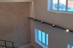 На одной из стен разместили профильный светильник с регулируемым углом излучения света, что позволило создать интересные световые акценты в интерьере. В спальне был установлен светильник с теплым мягким свечением, которое способствует созданию уютной атмосферы и комфортной обстановки. Для подсветки ступеней лестницы был использован узкий профиль и светодиодная лента, что позволило создать эффектную декоративную подсветку и обеспечить безопасность при перемещении по лестнице.
