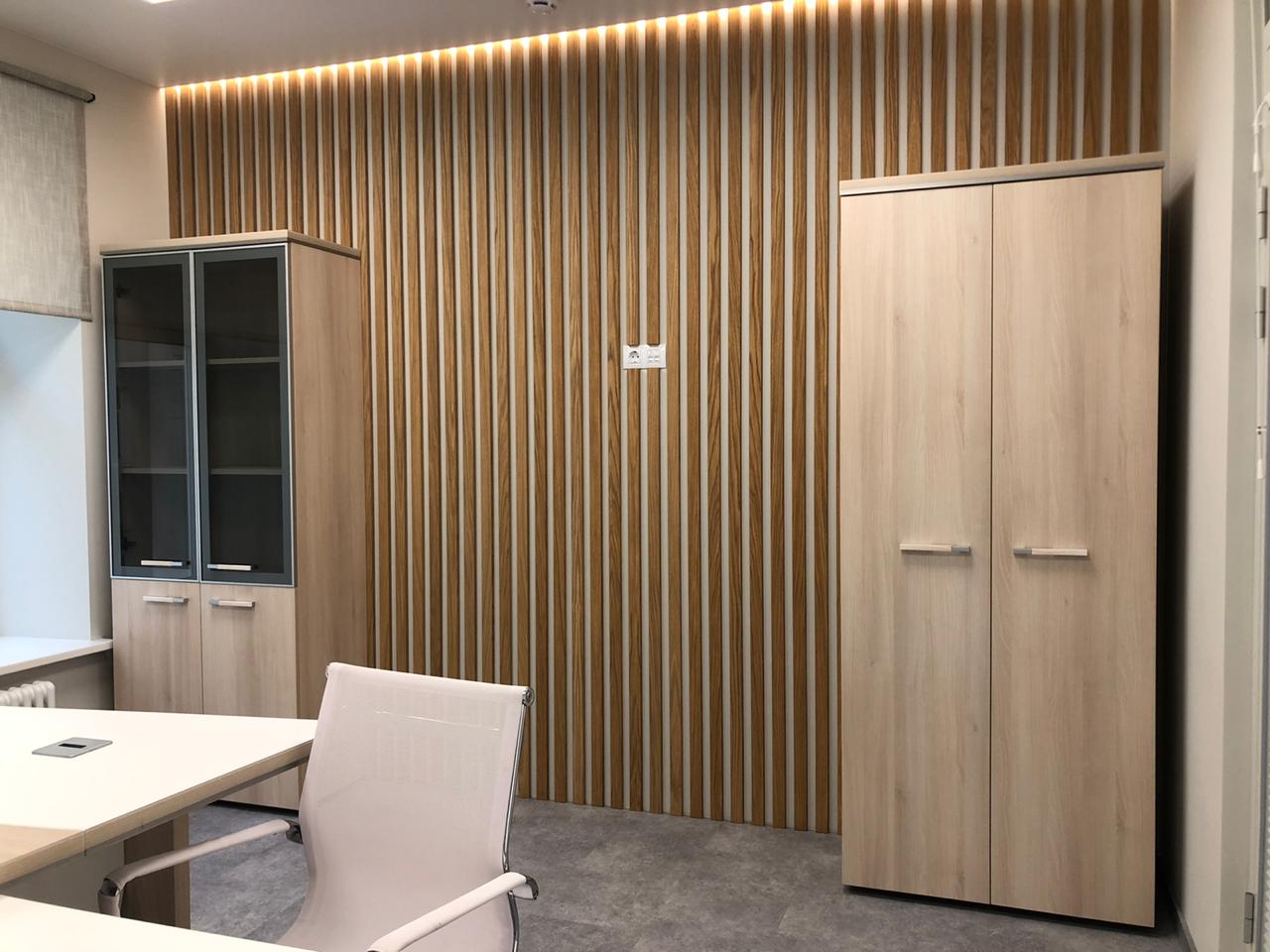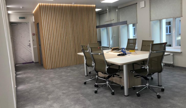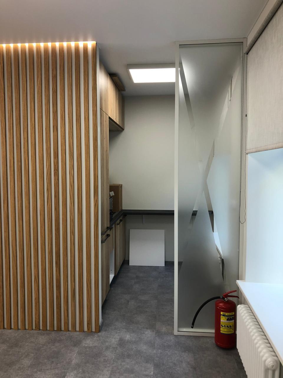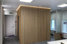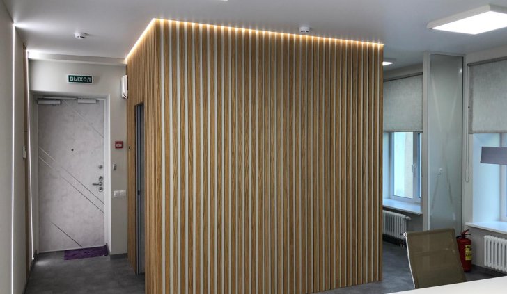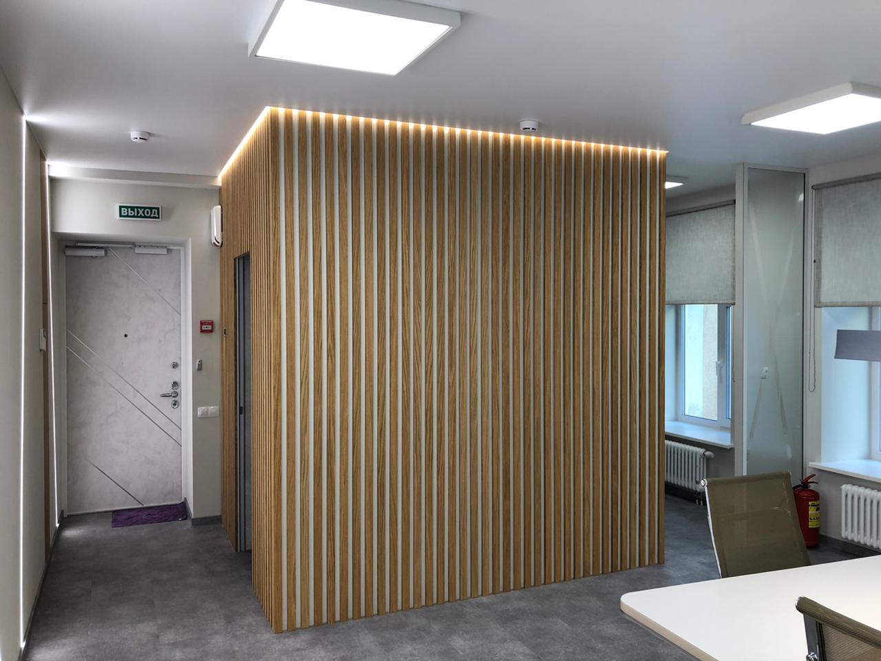 Блок санузла и кухни, задекорированный деревянными рейками, дополняет скрытая светодиодная подсветка тёплого оттенка. Такой же приём декоративного освещения в сочетании с рейками используется на одной из стен бэк-офиса. Основным освещением там также, как и переговорной, выступают квадратные накладные панели.