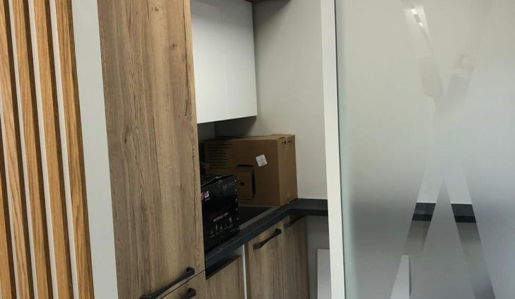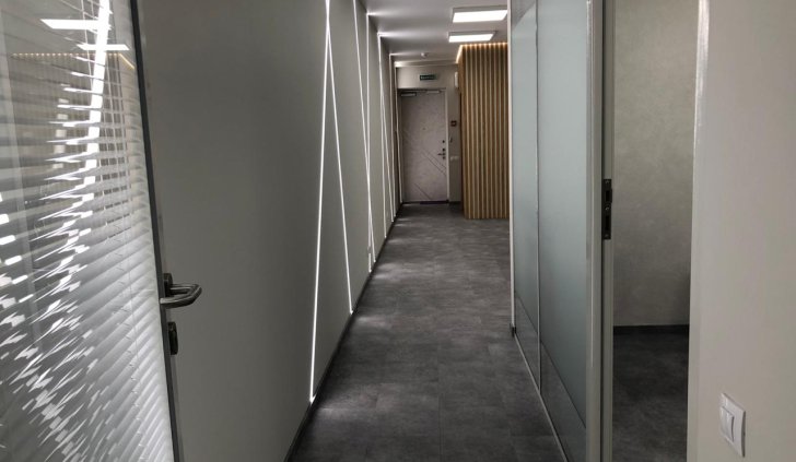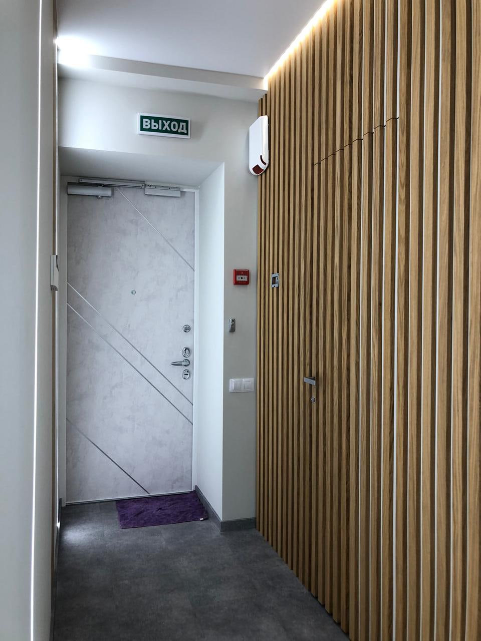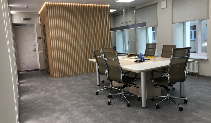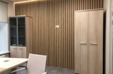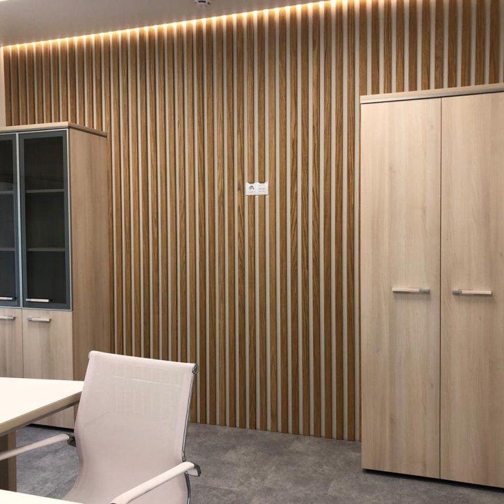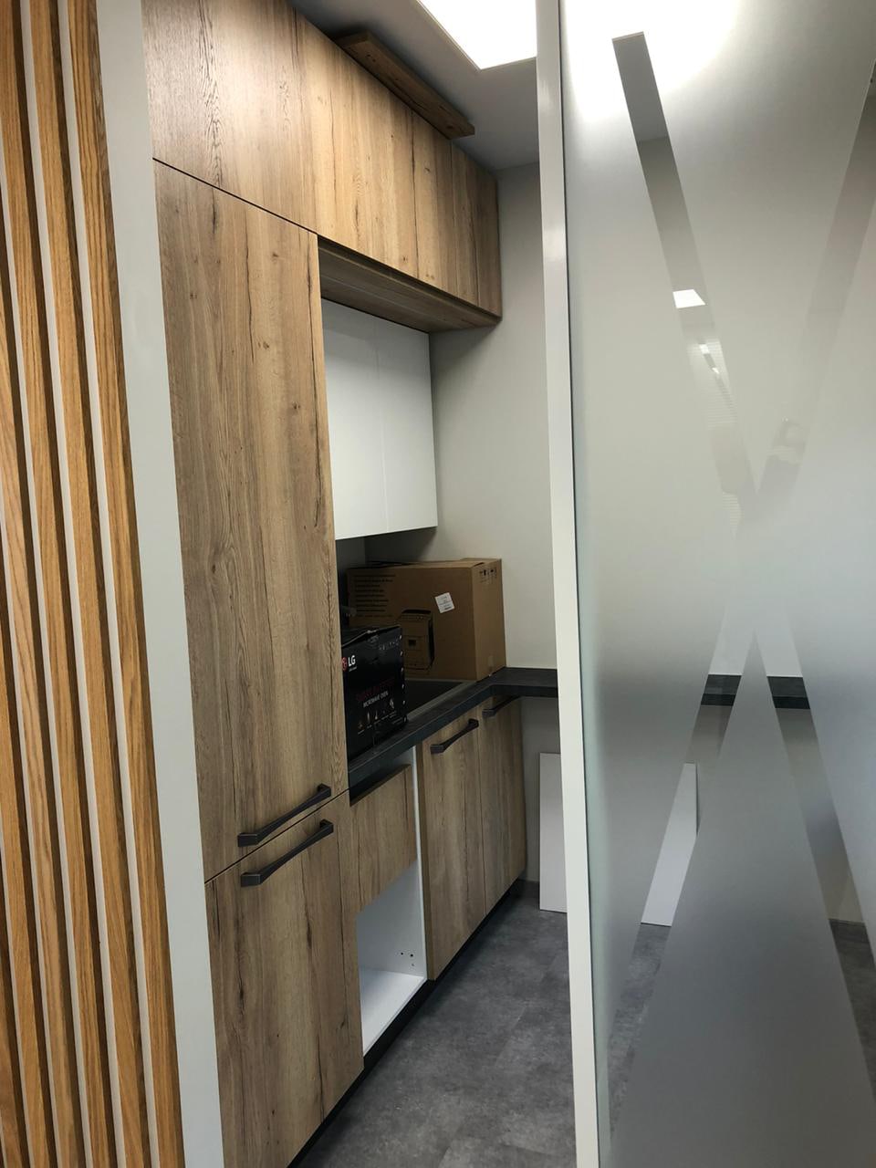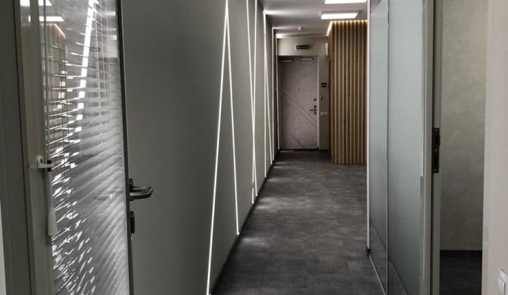 Блок санузла и кухни, задекорированный деревянными рейками, дополняет скрытая светодиодная подсветка тёплого оттенка. Такой же приём декоративного освещения в сочетании с рейками используется на одной из стен бэк-офиса. Основным освещением там также, как и переговорной, выступают квадратные накладные панели.
