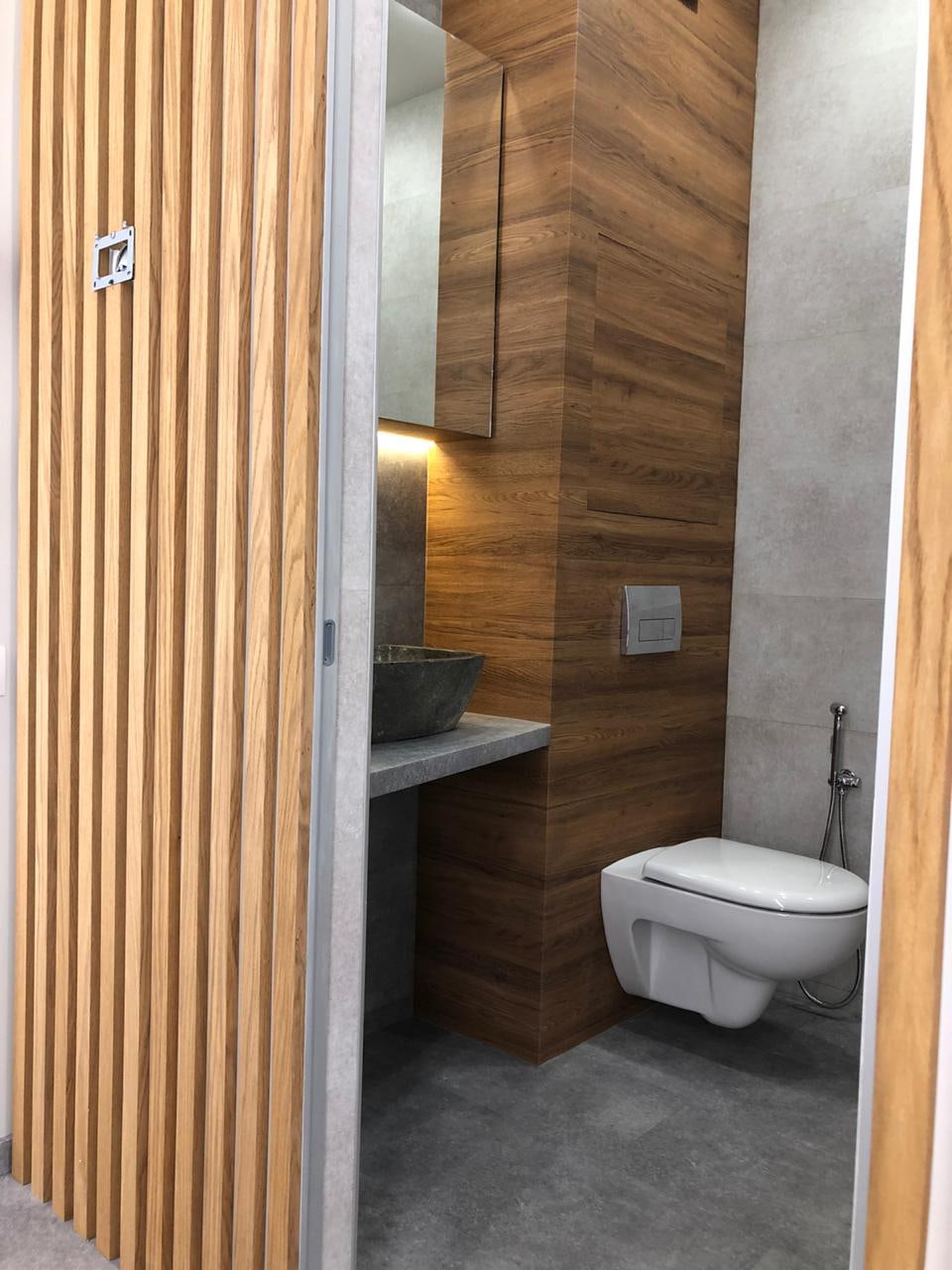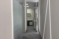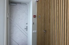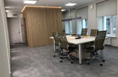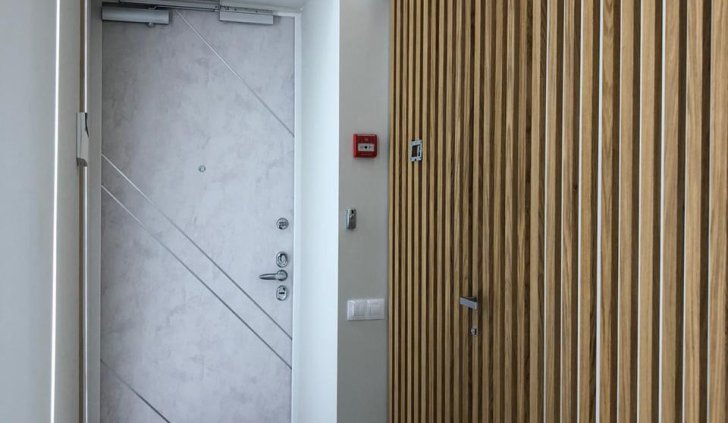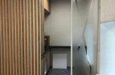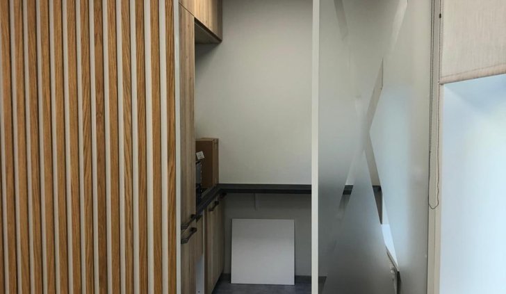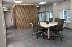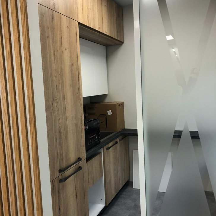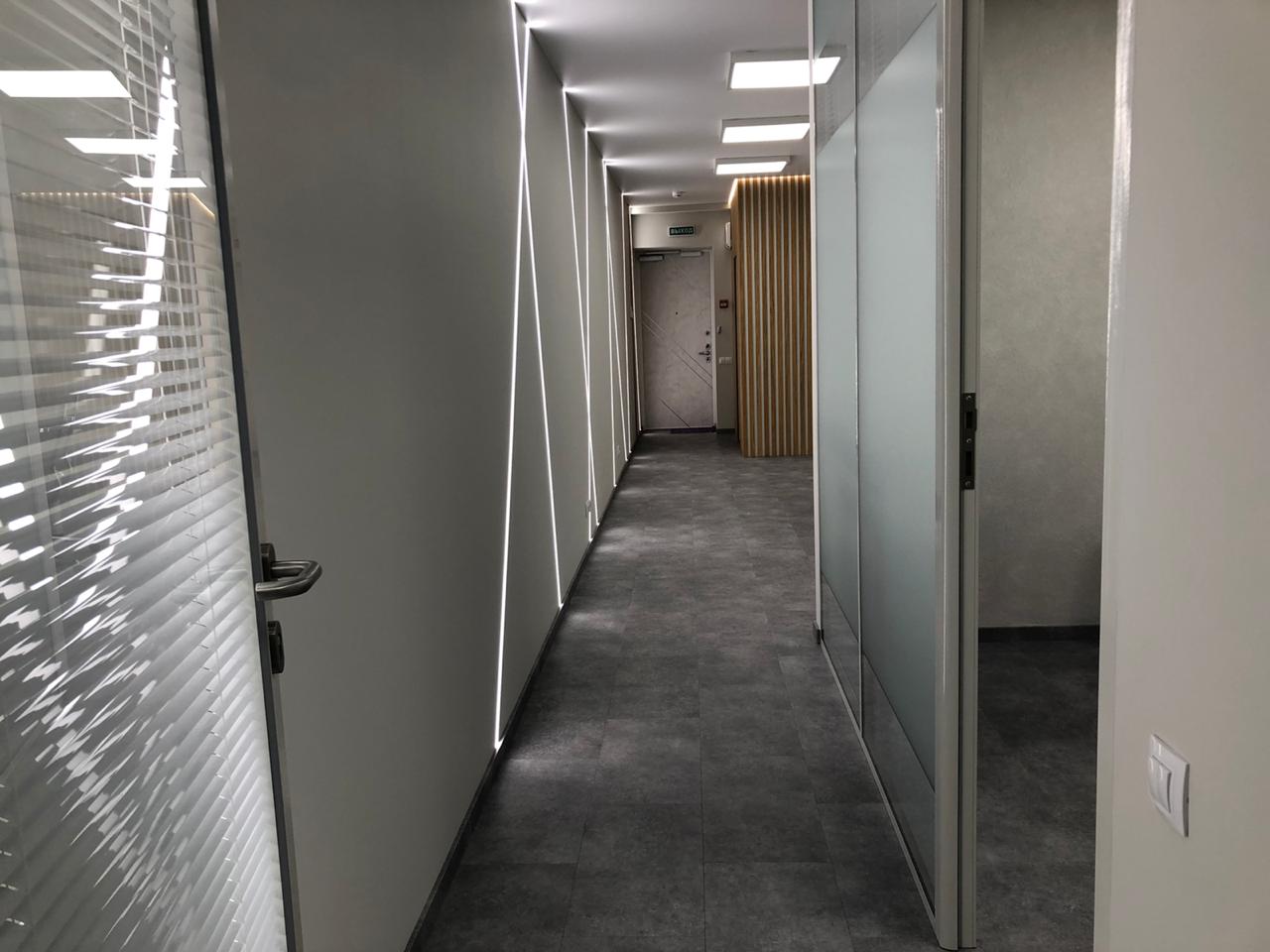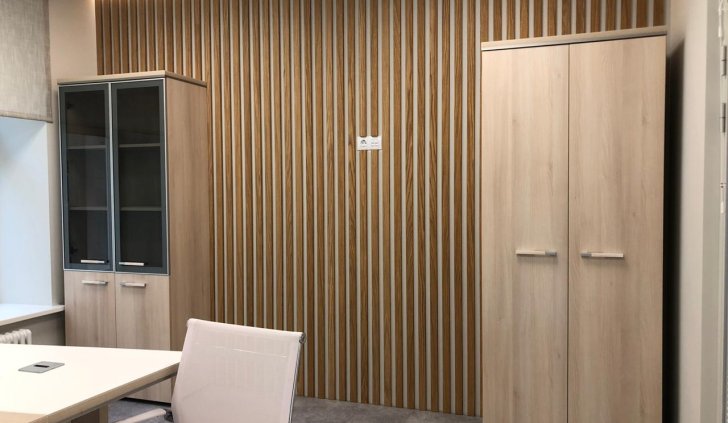 Блок санузла и кухни, задекорированный деревянными рейками, дополняет скрытая светодиодная подсветка тёплого оттенка. Такой же приём декоративного освещения в сочетании с рейками используется на одной из стен бэк-офиса. Основным освещением там также, как и переговорной, выступают квадратные накладные панели.
