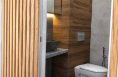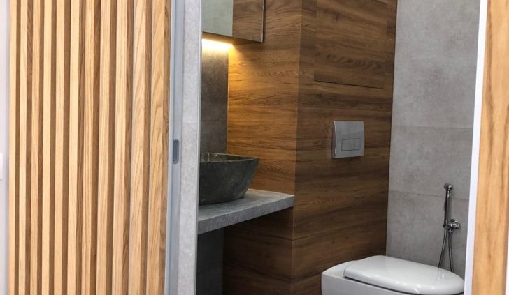 В санузле помимо основного освещения интерьер дополняет линейная подсветка над раковиной. Её тёплый свет создаёт в помещении приятную атмосферу.