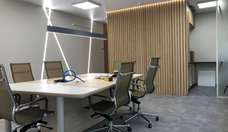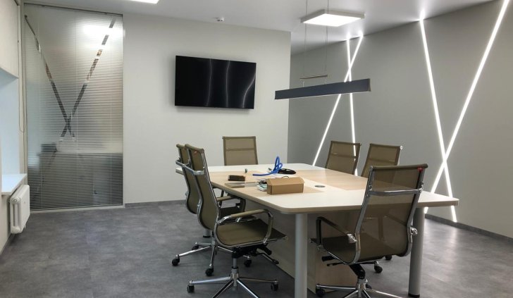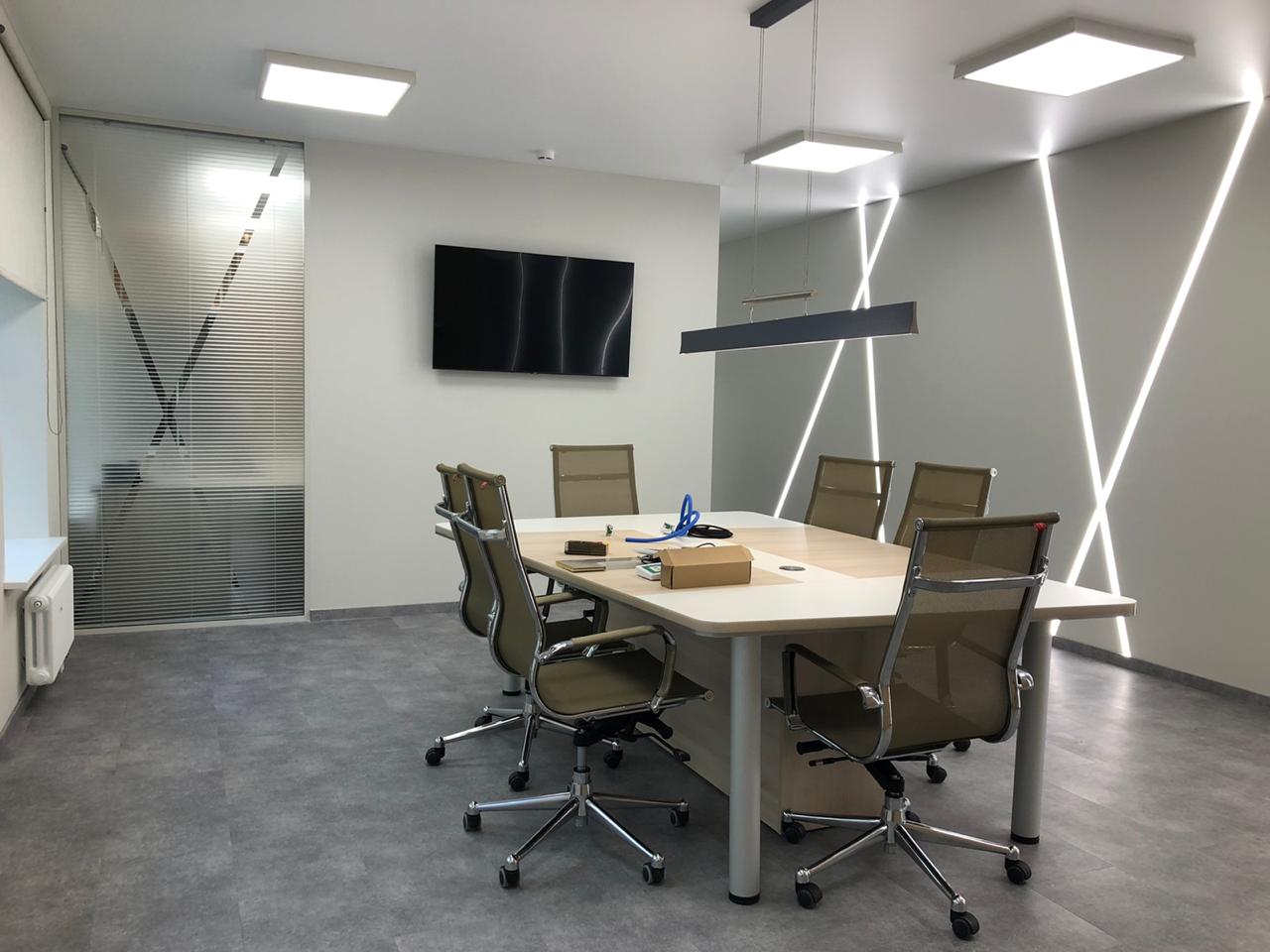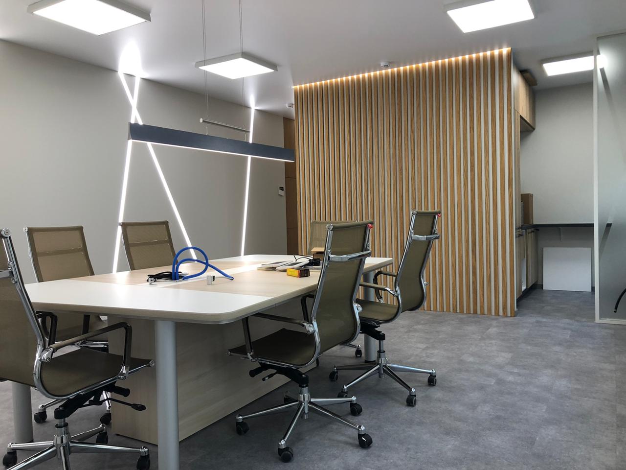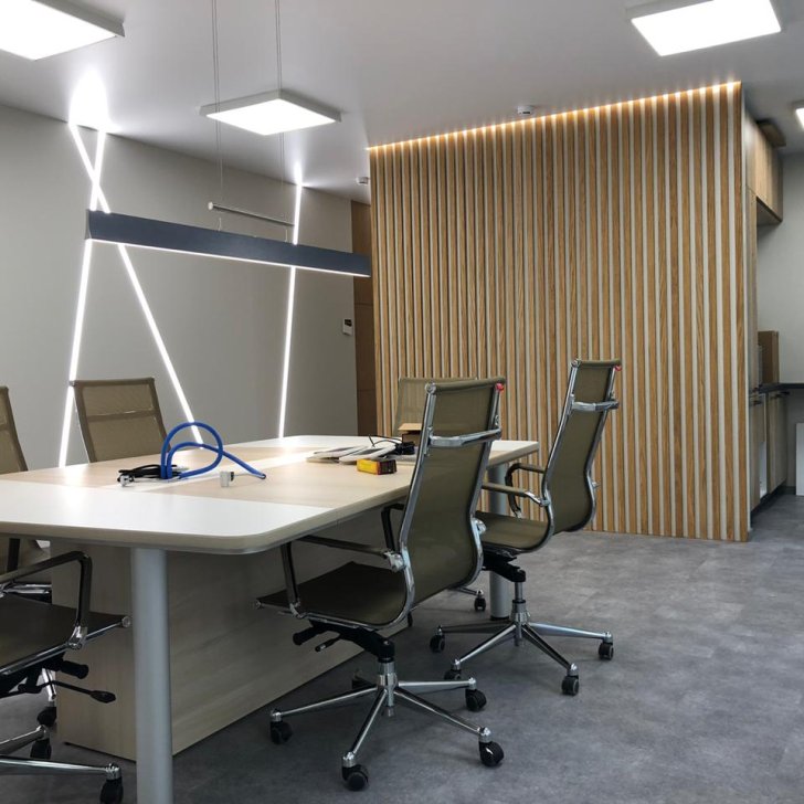 Роль основного освещения выполняют квадратные накладные панели 60х60 см, симметрично расположенные на потолке. Стол для переговоров дополнительно освещён подвесным линейным светильником, корпус которого окрашен в чёрный матовый цвет.