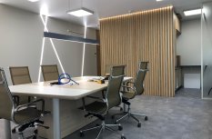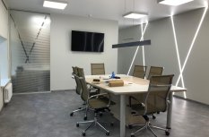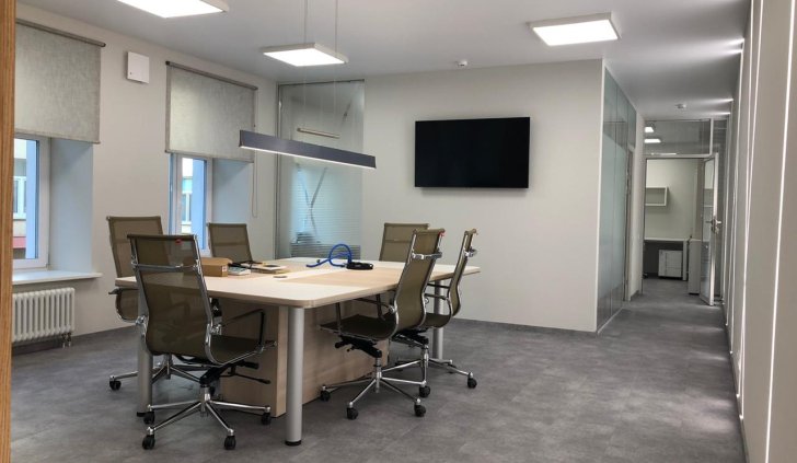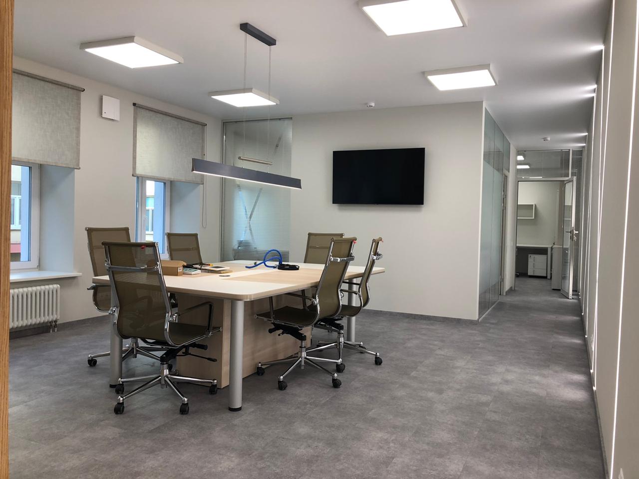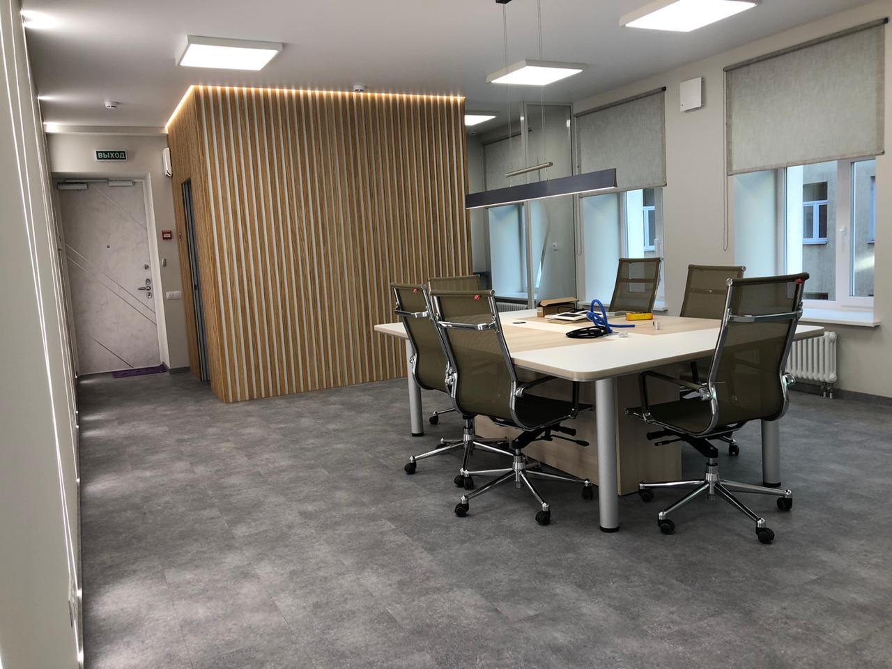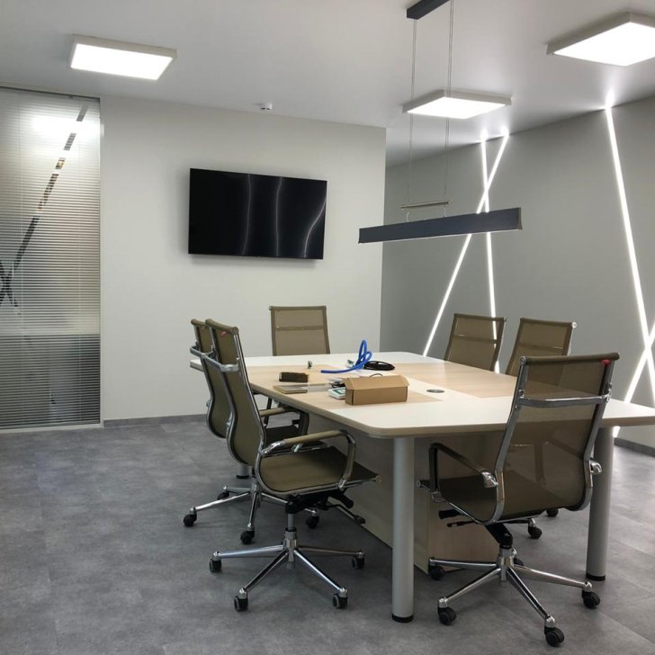 Роль основного освещения выполняют квадратные накладные панели 60х60 см, симметрично расположенные на потолке. Стол для переговоров дополнительно освещён подвесным линейным светильником, корпус которого окрашен в чёрный матовый цвет.