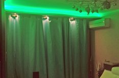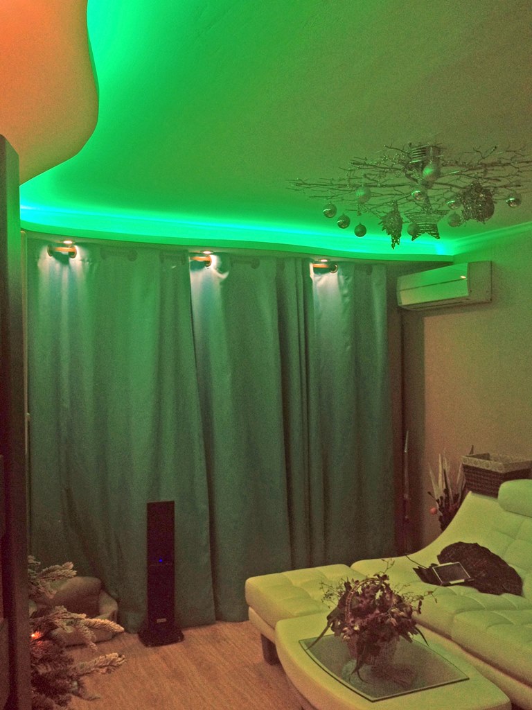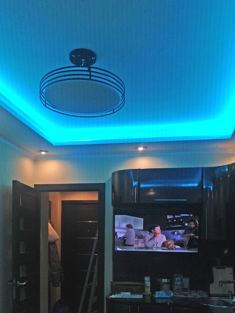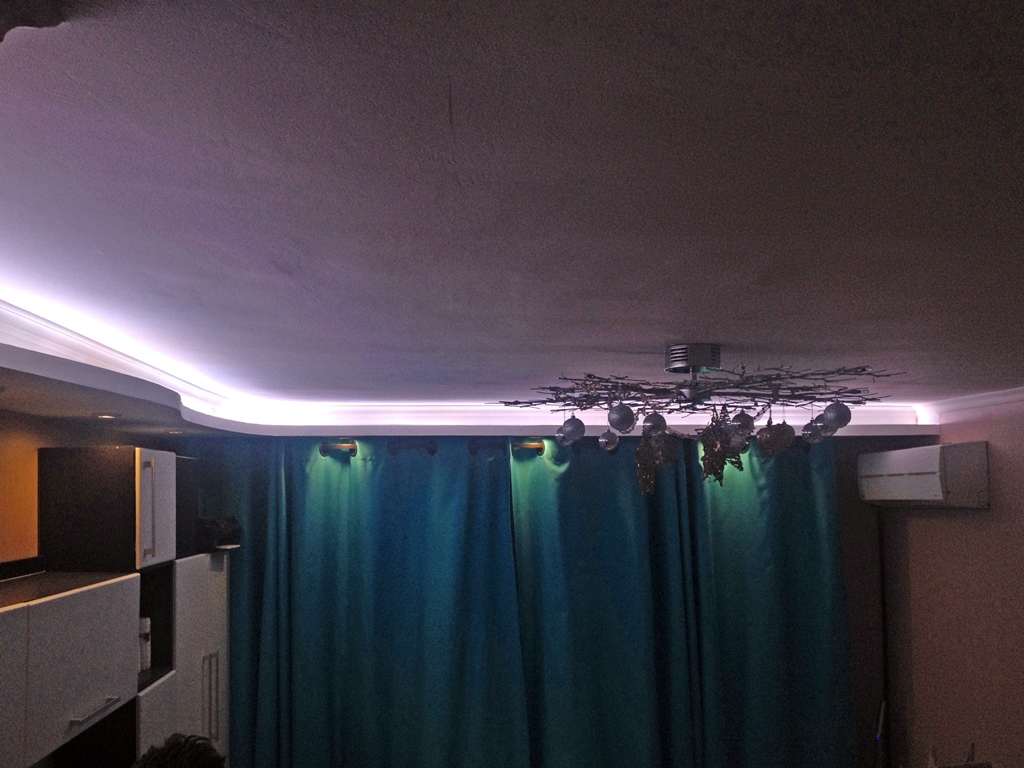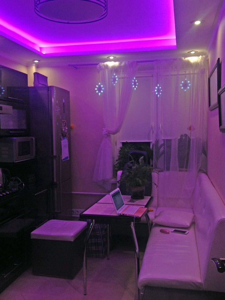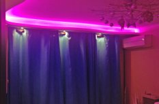 Декоративная закарнизная подсветка в квартире добавит новые нотки в интерьер. Применение многоцветной светодиодной ленты Arlight и RGB контроллера Arlight дает возможность добавить новые краски и подстроить обстановку под настроение.