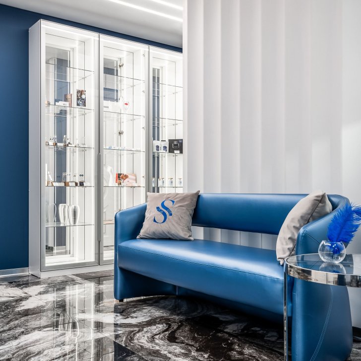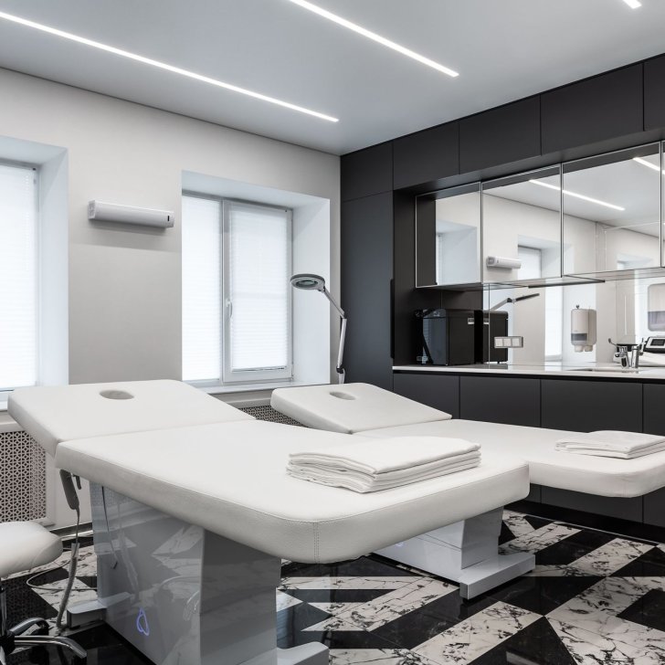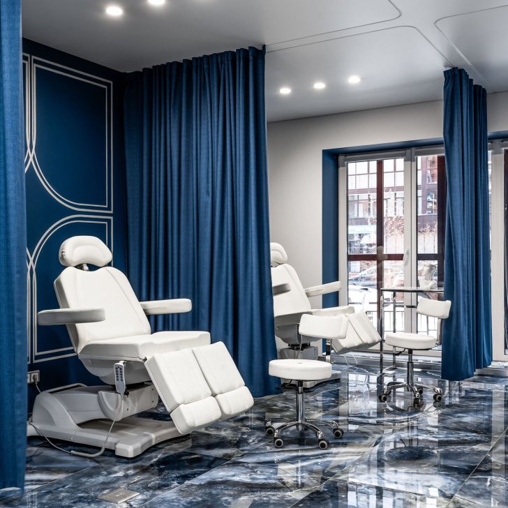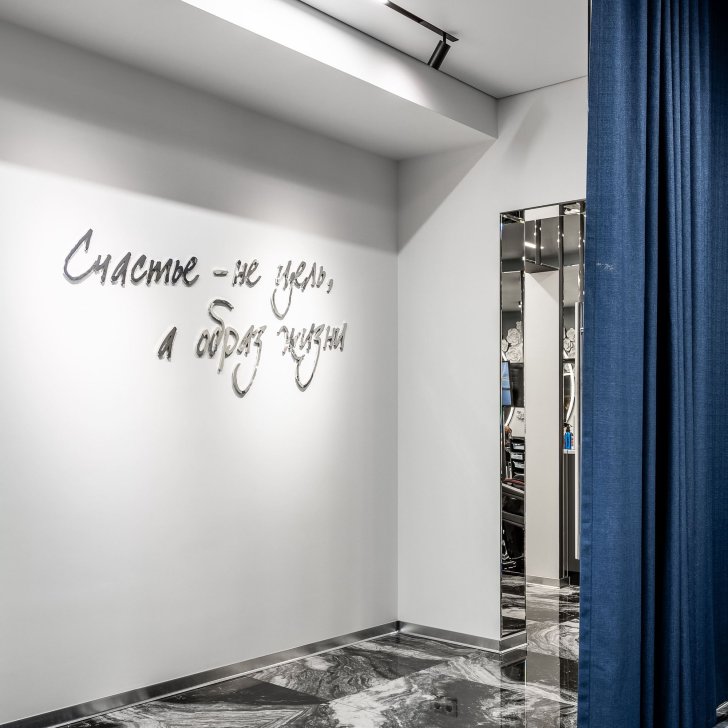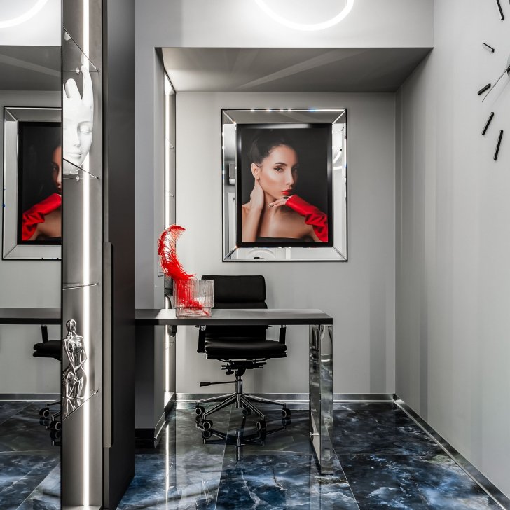 Интерьер салона красоты — в стиле контрастного и дерзкого футуризма с элементами ар-деко — заставит любую женщину почувствовать себя королевой. Роскошные панели и керамогранит, множество зеркал, водопады переливающегося стекла, оригинальная фотозона для клиенток — все эти элементы интерьера сливаются в единое синергическое пространство в том числе благодаря свету.