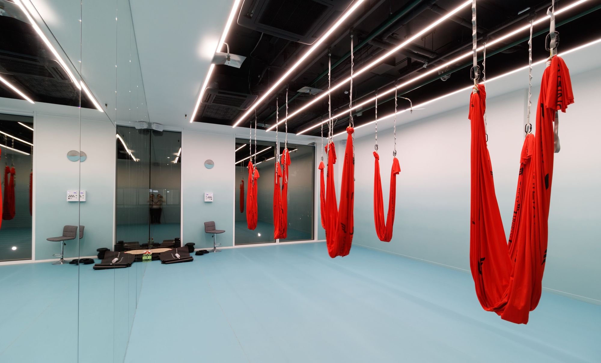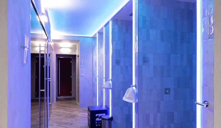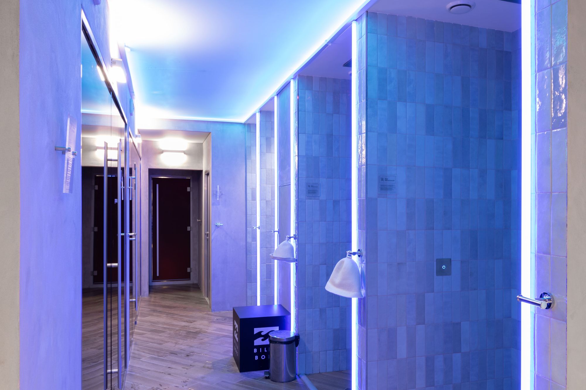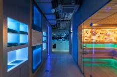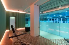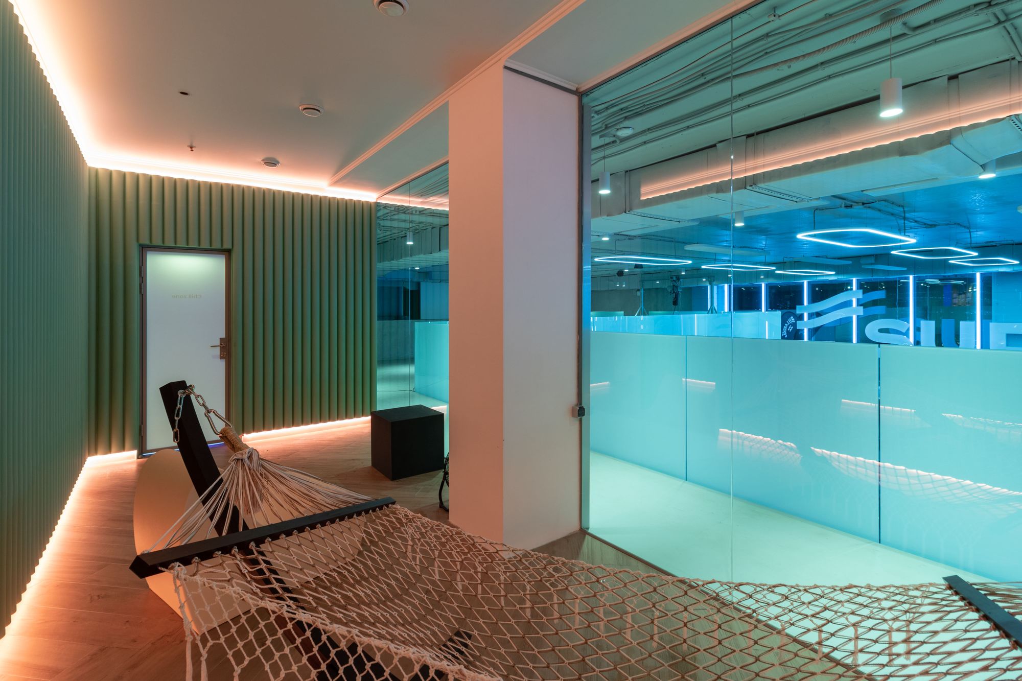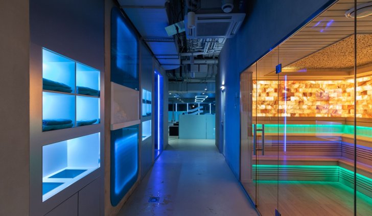 Управление освещением группами, автоматическая смена сцен в течение дня и общее управление источниками света осуществляются через планшет администратора. В офисном помещении, фитнес-зале и зоне отдыха установлено более спокойное и нейтральное освещение с использованием лент белого свечения.