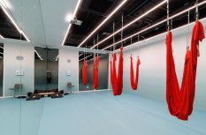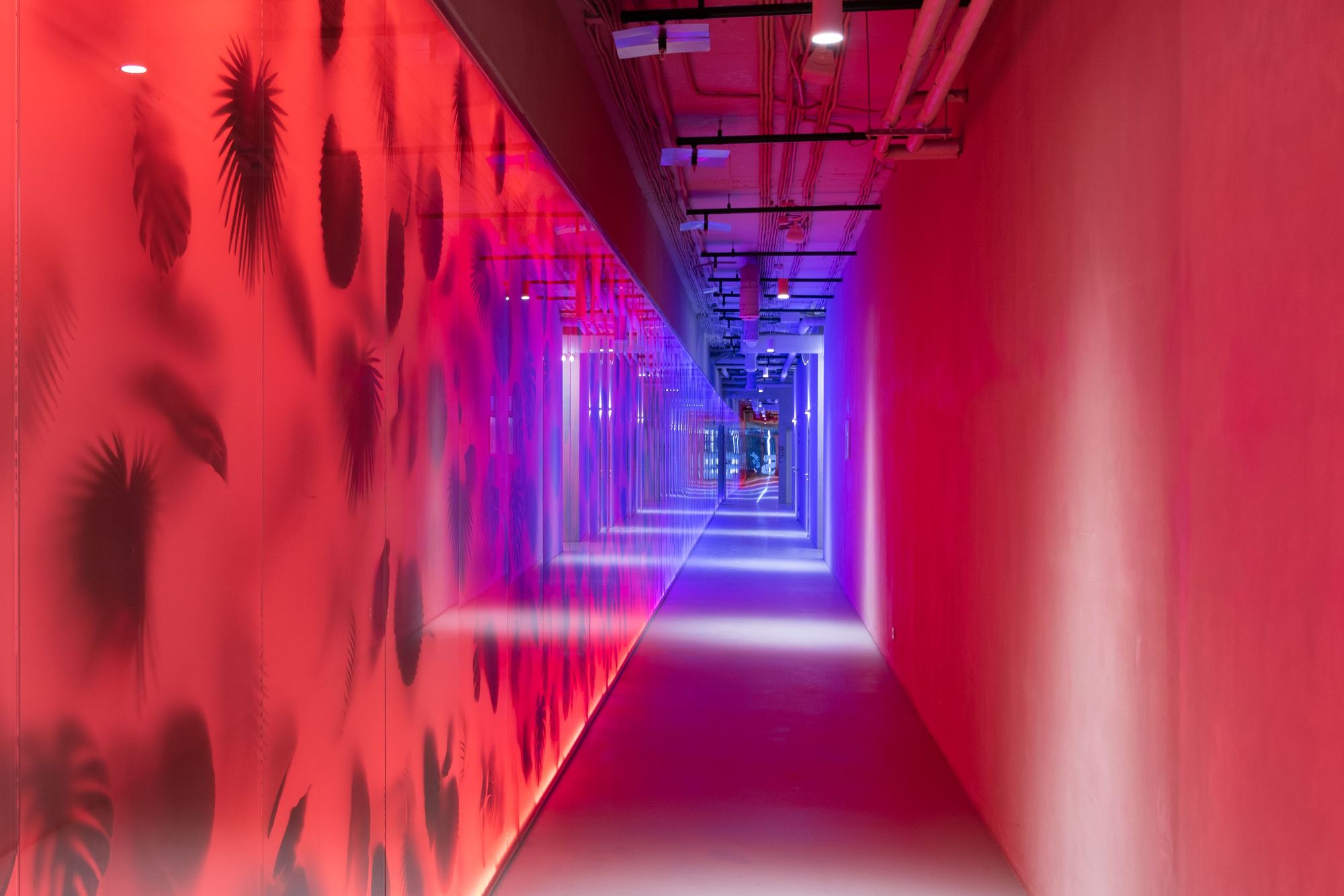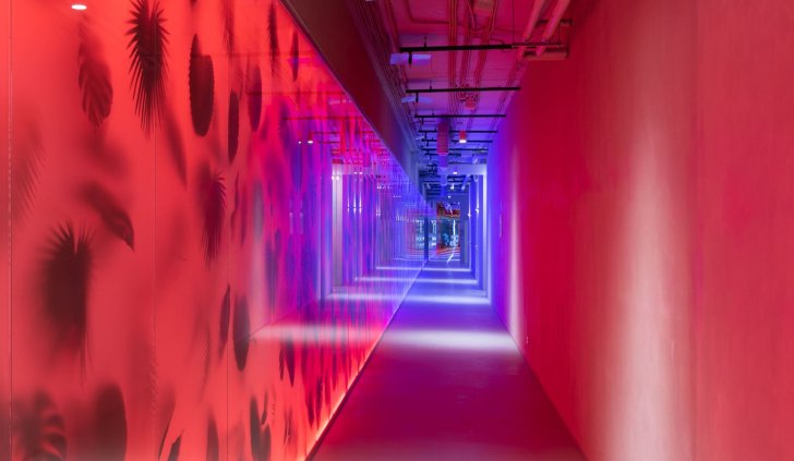 Подвесные светильники из дугового профиля управляются по протоколам DALI и DMX512, что позволяет реализовать динамическое освещение под фоновую музыку. В зоне проходных помещений предусмотрены датчики движения, а также предоставлено аварийное освещение.