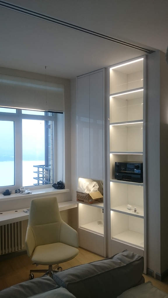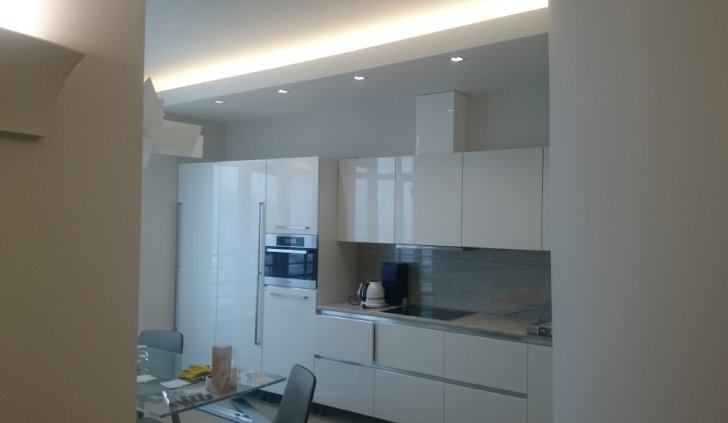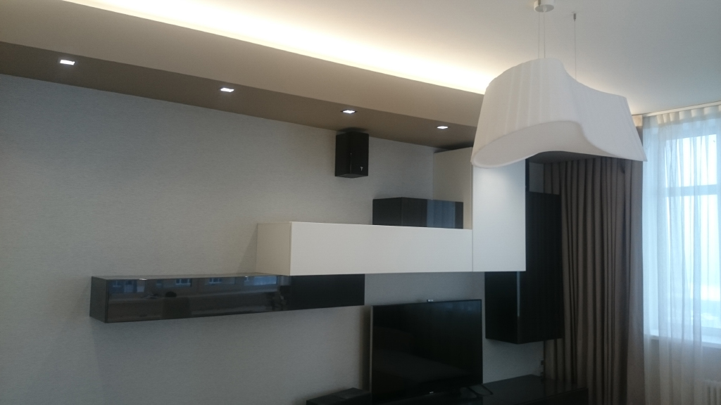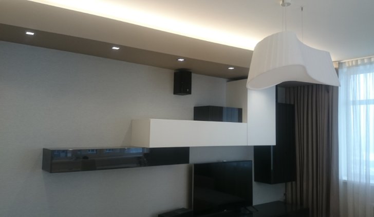 К декоративной части светодиодной подсветки относится подсветка потолков: во всех помещениях квартиры были сделаны многоуровневые потолки, в их нишах размещена светодиодная лента Arlight. Для этого был выбран дневной белый цвет свечения, благодаря чему подсветка может служить для мягкого фонового освещения, когда основной свет не требуется.