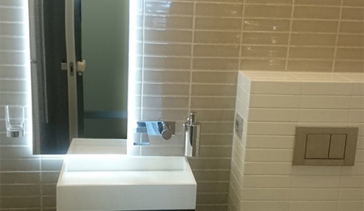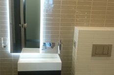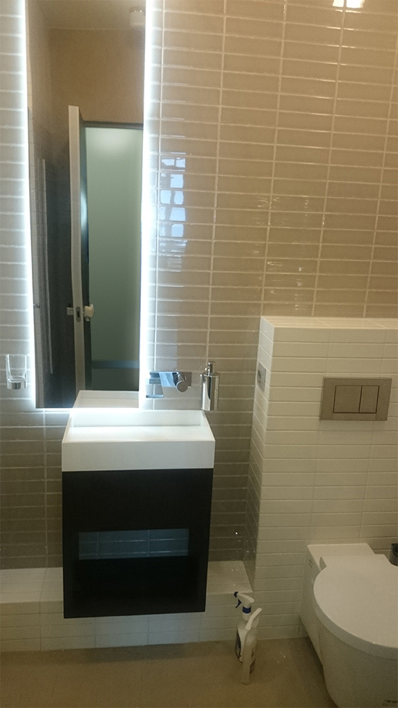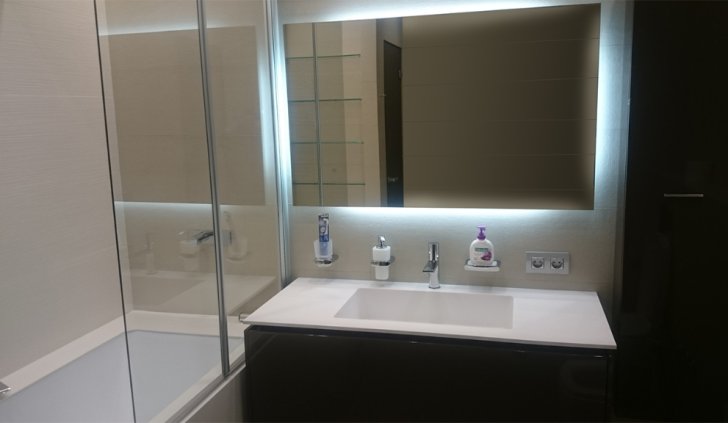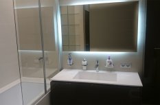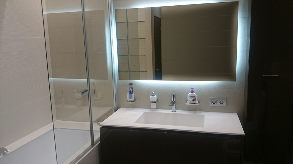 В ванной комнате была установлена подсветка зеркал. Светодиодная лента была приклеена с обратной стороны зеркала, поэтому оно обрело светящийся контур, не бьющий по глазам.