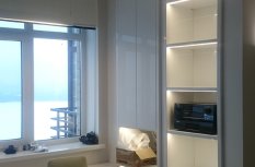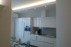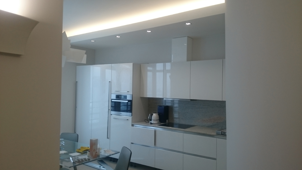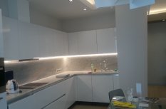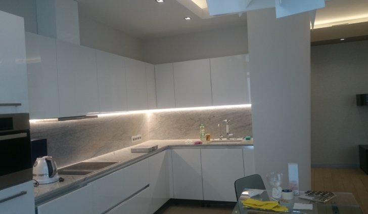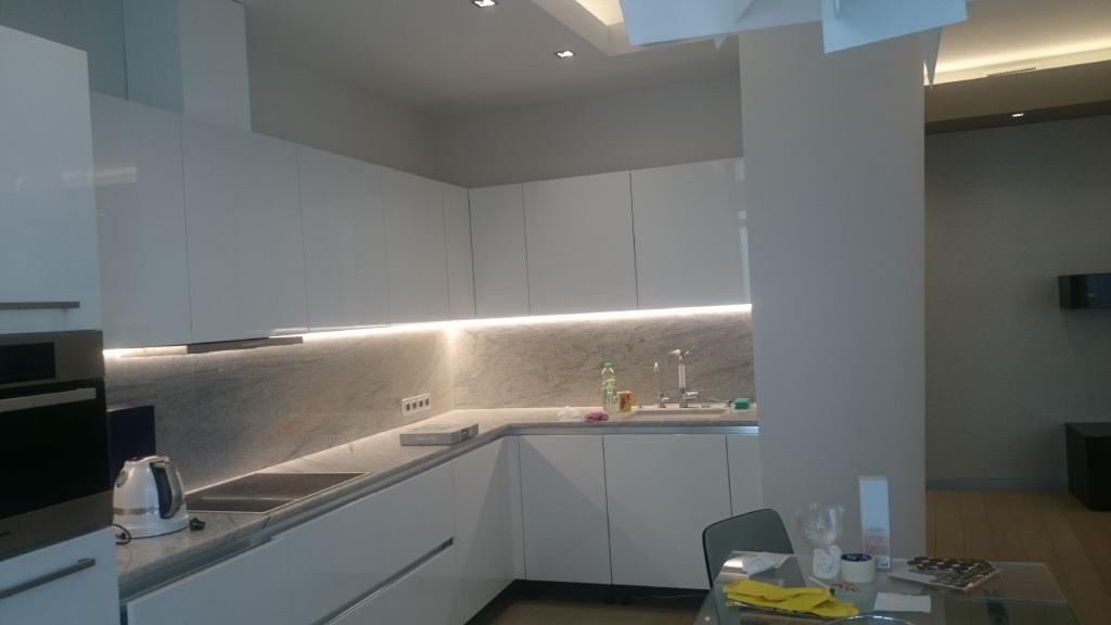 Функциональная подсветка в этой квартире представлена сразу несколькими типами. Подсветка на кухне - её важная часть. Подсветка под навесными шкафами кухни сделана для освещения рабочей зоны, т.е. её столешницы. Для это светодиодный профиль установлен в угол между стеной и навесным шкафом, в нём приклеивается светодиодная лента, которая затем закрывается матовым экраном, рассеивающим свет. Включить свет можно бесконтактным способом - достаточно поднести руку к зоне действия датчика.