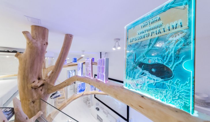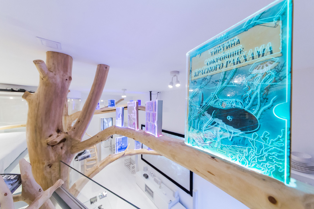 В основном для подсветки использованы светодиодные ленты синих оттенков свечения. Стол-стойка, а точнее, его основание было подсвечено со всех четырех сторон. На ветвях деревьев расположились боксы для книг. Они сделаны из прозрачного оргстекла и на их поверхность нанесена гравировка контуров рисунков на обложках. Каждый из боксов был подсвечен светодиодными лентами разных цветов.