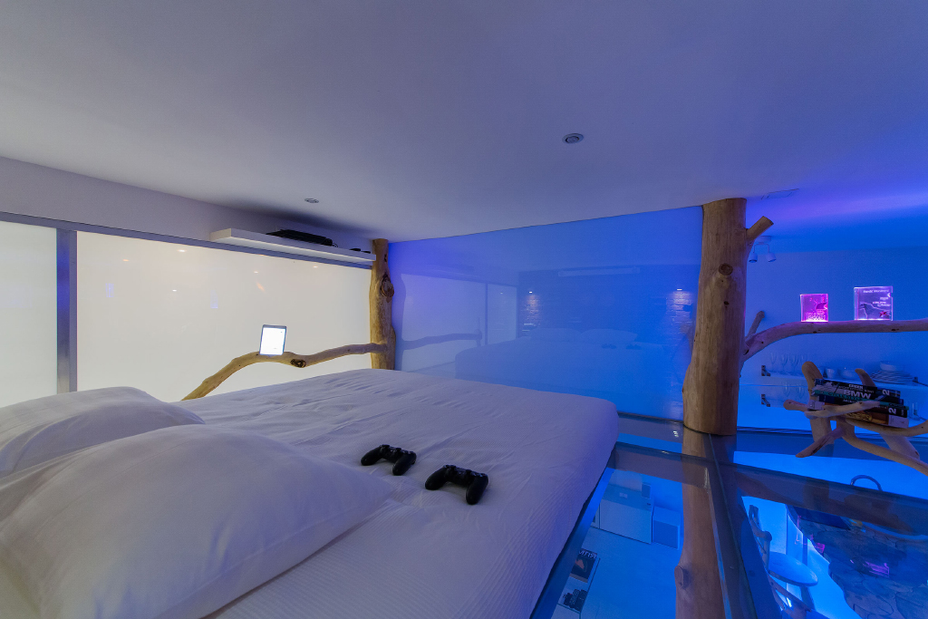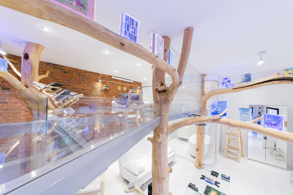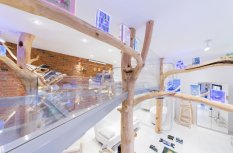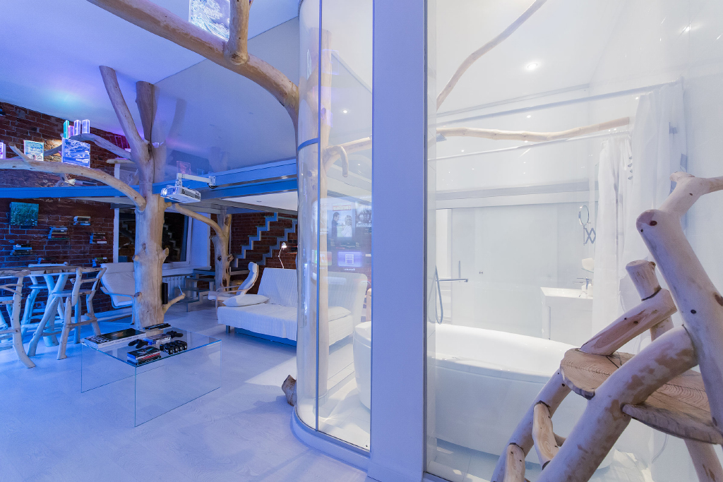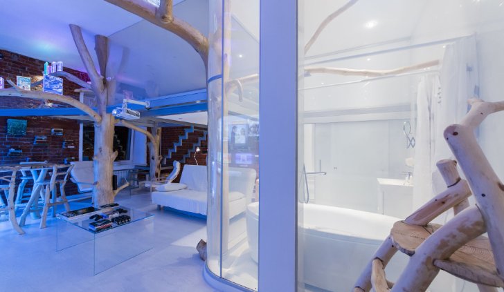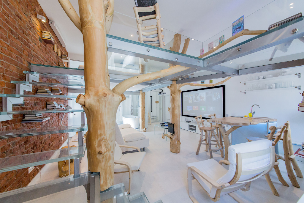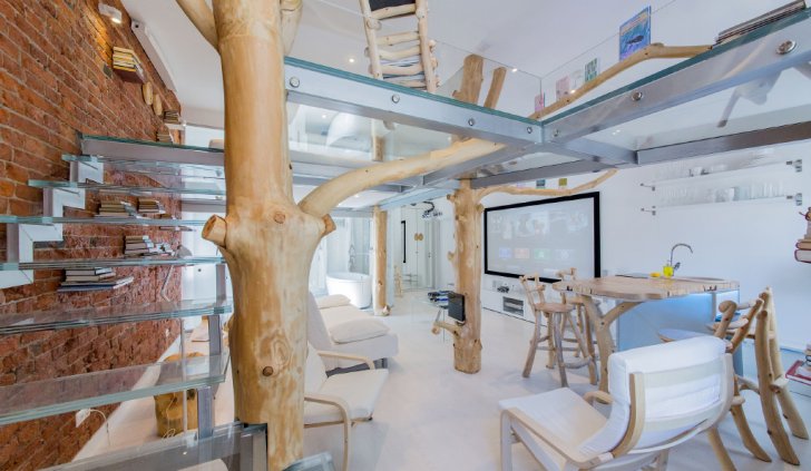 Сталь, стекло в этой студии сочетаются с деревом. Причем дерево используется не только в мебели: стульях, креслах обеденной стойки. Деревья и их ветви - это центральный декоративный элемент в этой квартире. При этом в стволах деревьев скрыты опоры второго уровня студии. Получился в каком-то роде домик на дереве.