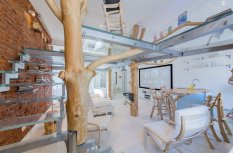 Сталь, стекло в этой студии сочетаются с деревом. Причем дерево используется не только в мебели: стульях, креслах обеденной стойки. Деревья и их ветви - это центральный декоративный элемент в этой квартире. При этом в стволах деревьев скрыты опоры второго уровня студии. Получился в каком-то роде домик на дереве.