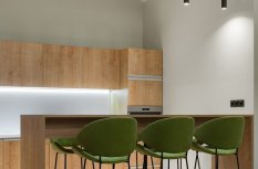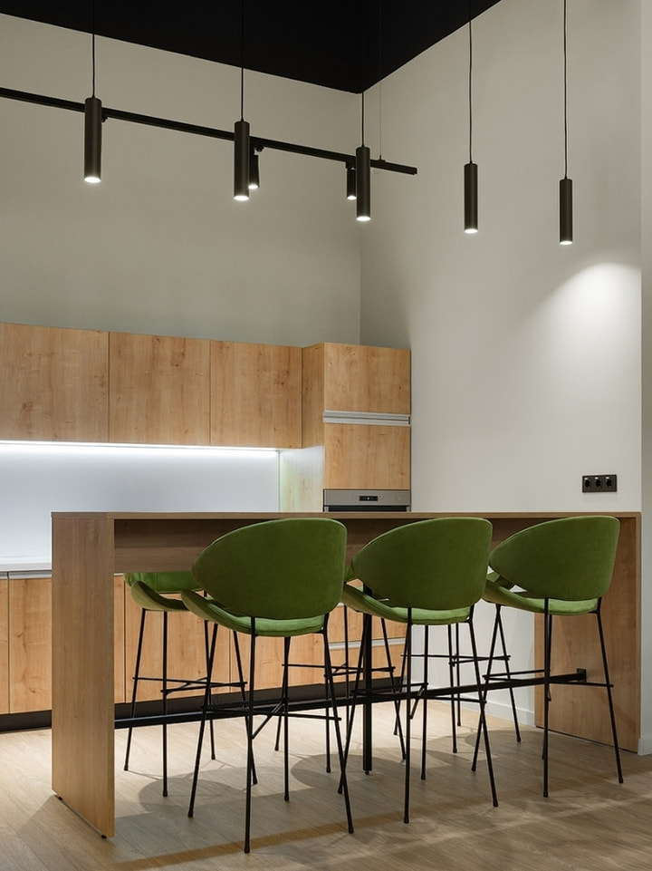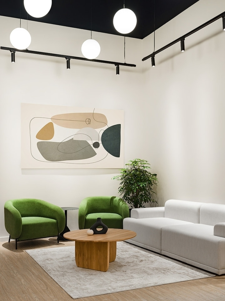 Трековая система, выполненная в черном цвете, эффектно смотрится на светло-зеленых и белых стенах, придавая интерьеру завершенный вид. Высокий индекс цветопередачи светильников (CRI>90) гарантирует яркость и насыщенность всех цветов и оттенков в помещении.