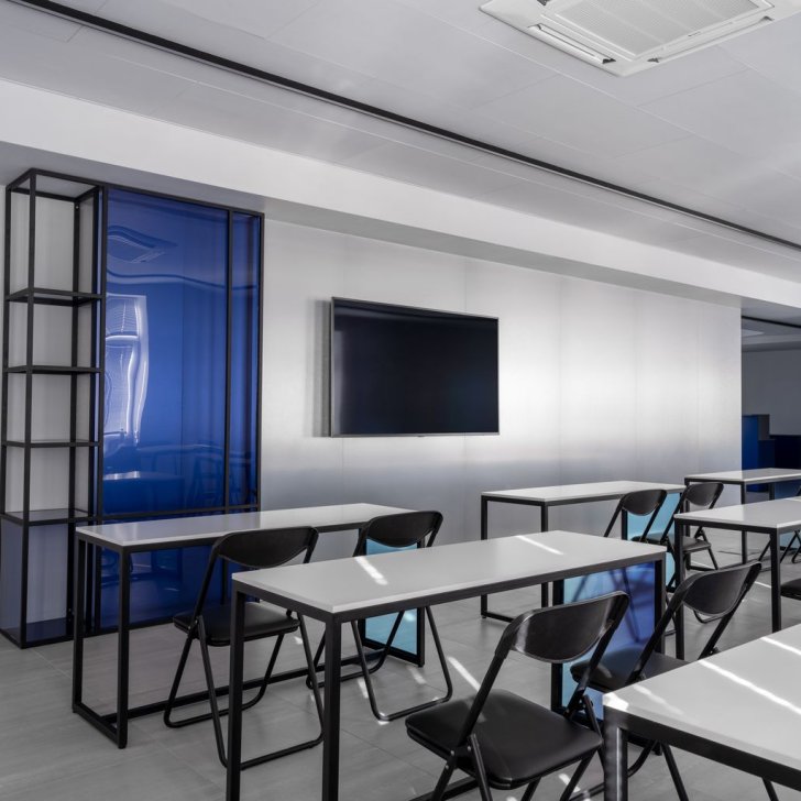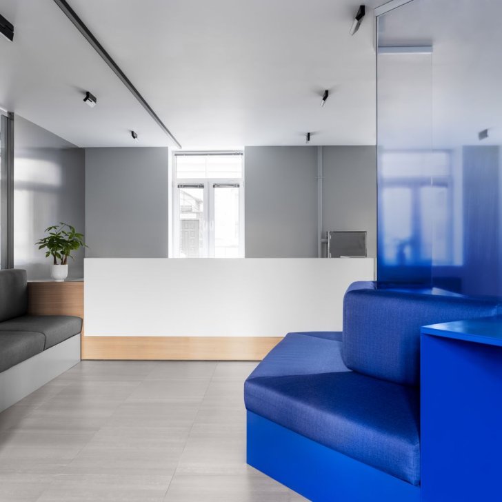 Декорирование стоматологической клиники с шестью этажами выполнено в палитре главным образом серого и белого цветов, приправленных контрастными акцентами ультрамаринового оттенка. Очаровательно яркие синие диваны, подлокотники, экраны для батарей, сиденья и другие интерьерные элементы без промедления обращают на себя внимание, создавая уникальную, но гармоничную атмосферу. Даже чугунная лестница начала ХХ века, случайно обнаруженная в процессе клинических ремонтных работ, была восстановлена и окрашена в традиционный оттенок стоматологического центра.