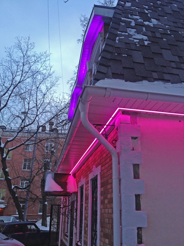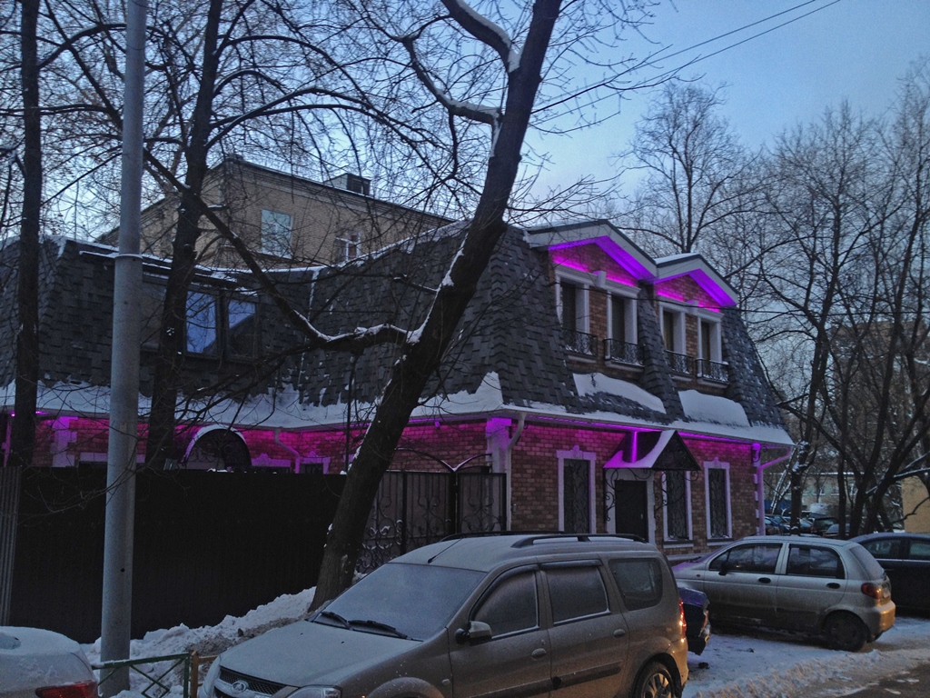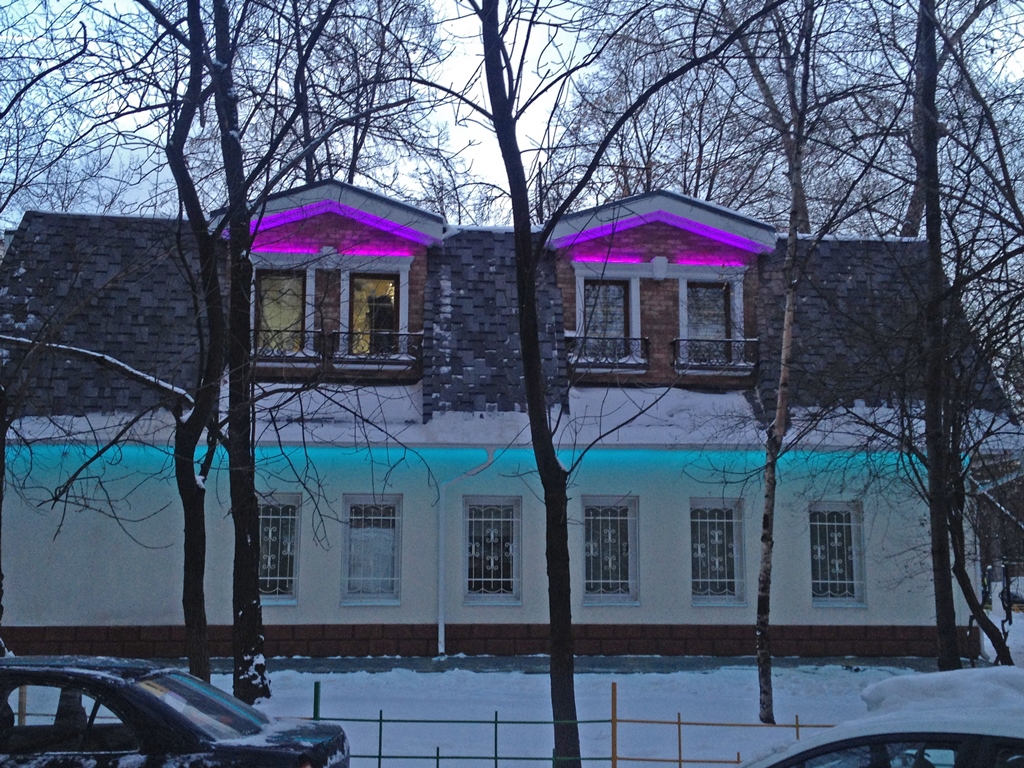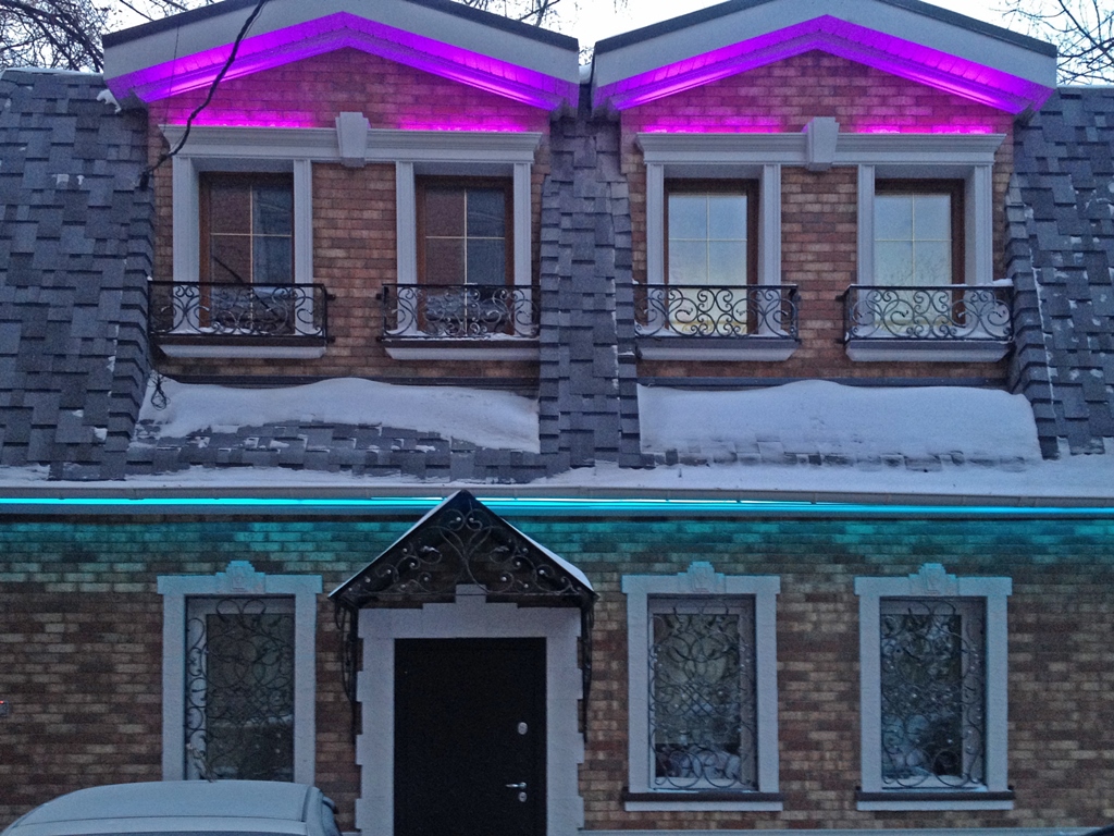 Все чаще и чаще проходя по улицам городов можно встретить освещенные фасады как отдельных зданий, так и целых кварталов. Применение светодиодного оборудования для декоративной архитектурной подсветки открыло новые возможности в данном виде освещения за счет низкого энергопотребления, компактности оборудования и широкой цвето-световой гаммы RGB LED технологии. Подсветка была выполнена с применением светодиодного оборудования Arlight.