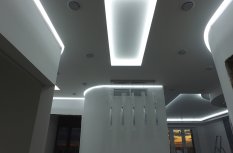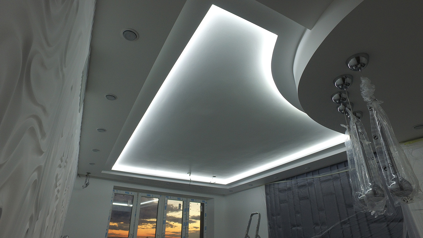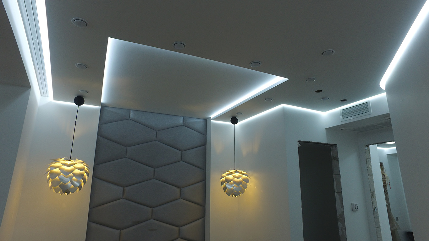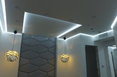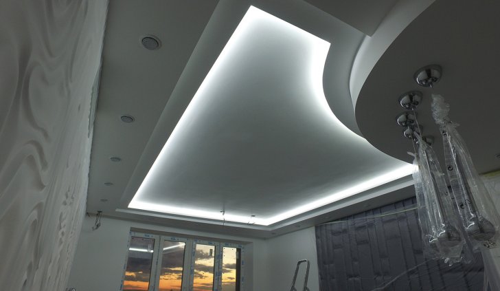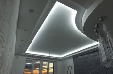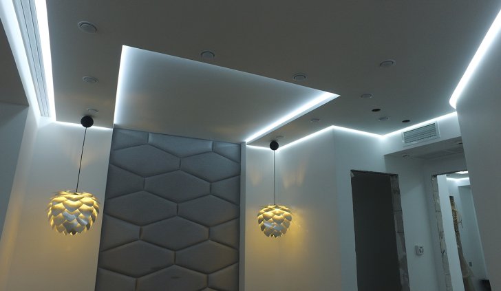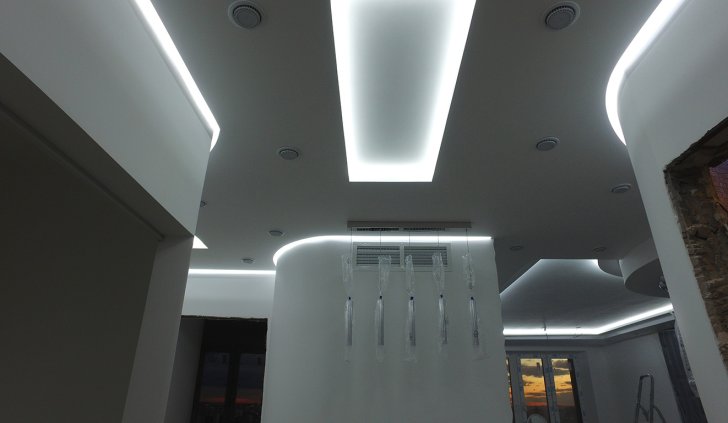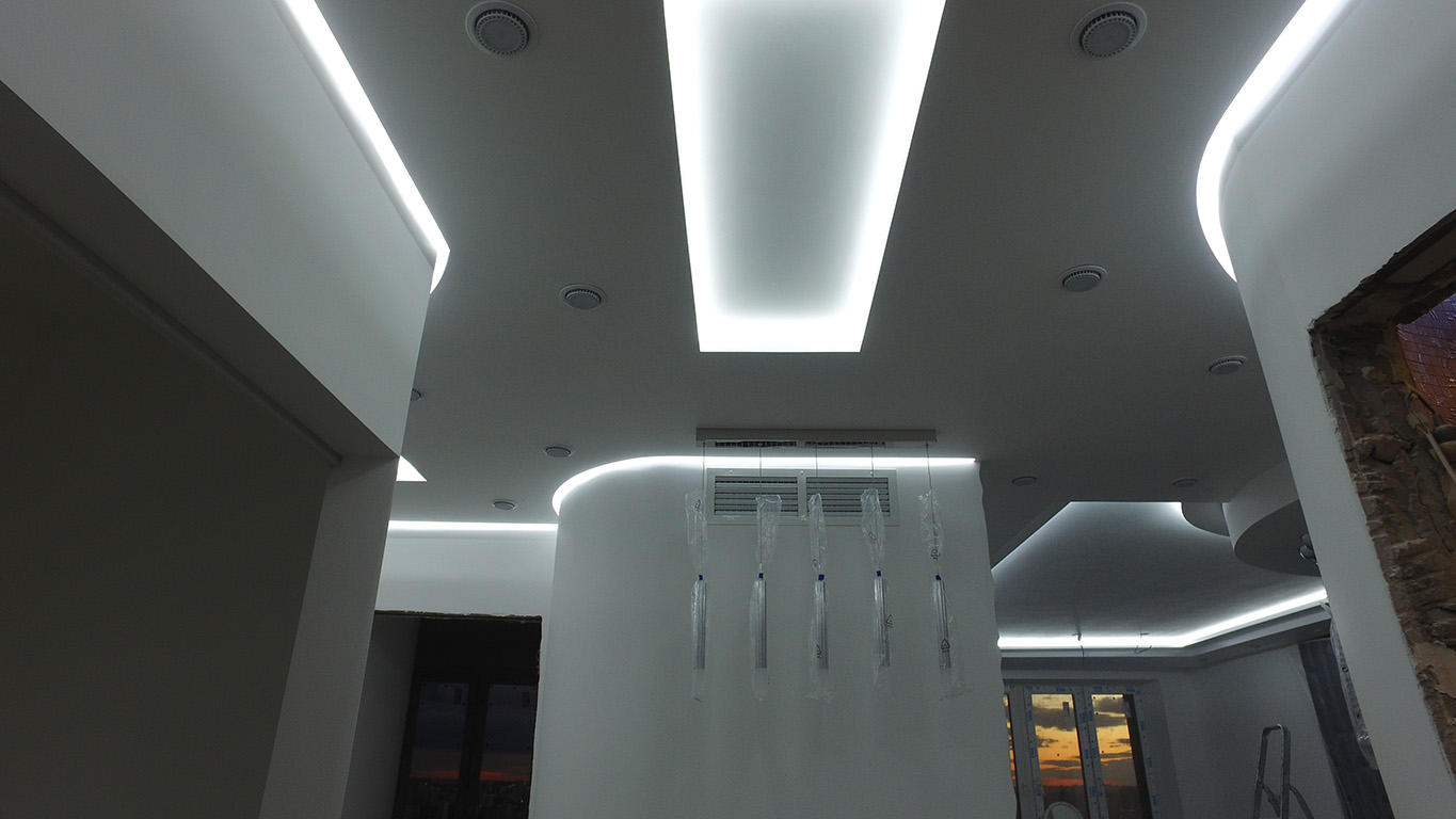 Для реализации проекта была выбрана модель со светодиодами smd 3528 холодного белого свечения, 120 светодиодов на метр. Её яркости может быть достаточно в качестве основного освещения, но при необходимости можно включить светодиодные лампы GX53 точечных светильников. Лента установлена в нишах, которые были предусмотрены при создании гипсокартонных конструкций на потолке