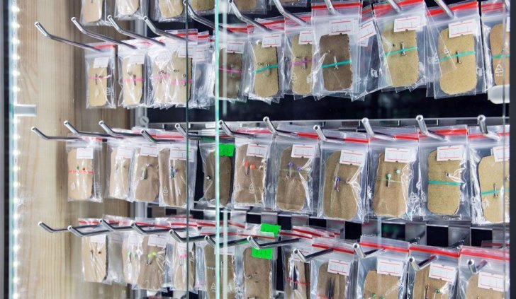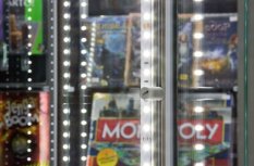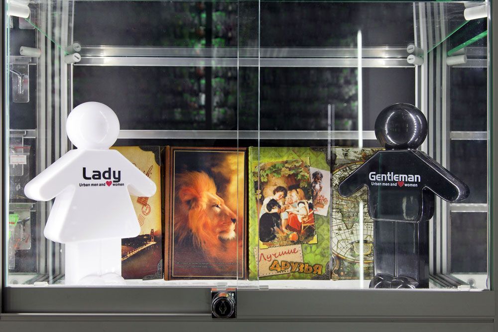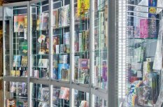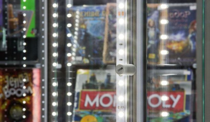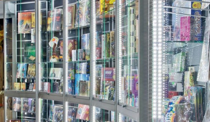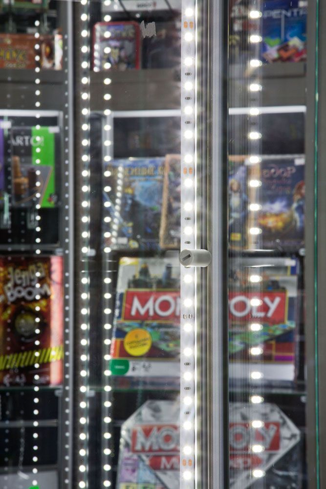 Магазин имеет обширную витрину, сделанную из алюминиевых профилей и стекла. Для освещения множества полок стеллажей была использована светодиодная лента белого цвета свечения. Её отрезки были установлены на вертикальные профили самих стеллажей, их достаточно для отведения тепла от светодиодов, поэтому было решено не использовать дополнительные профили для светодиодных лент.