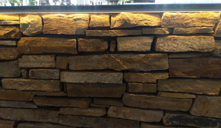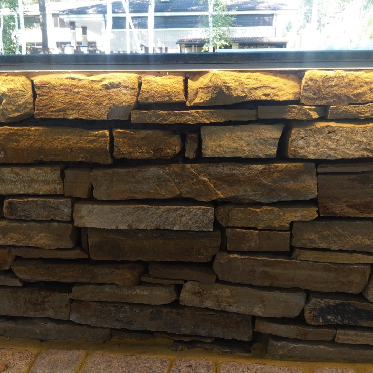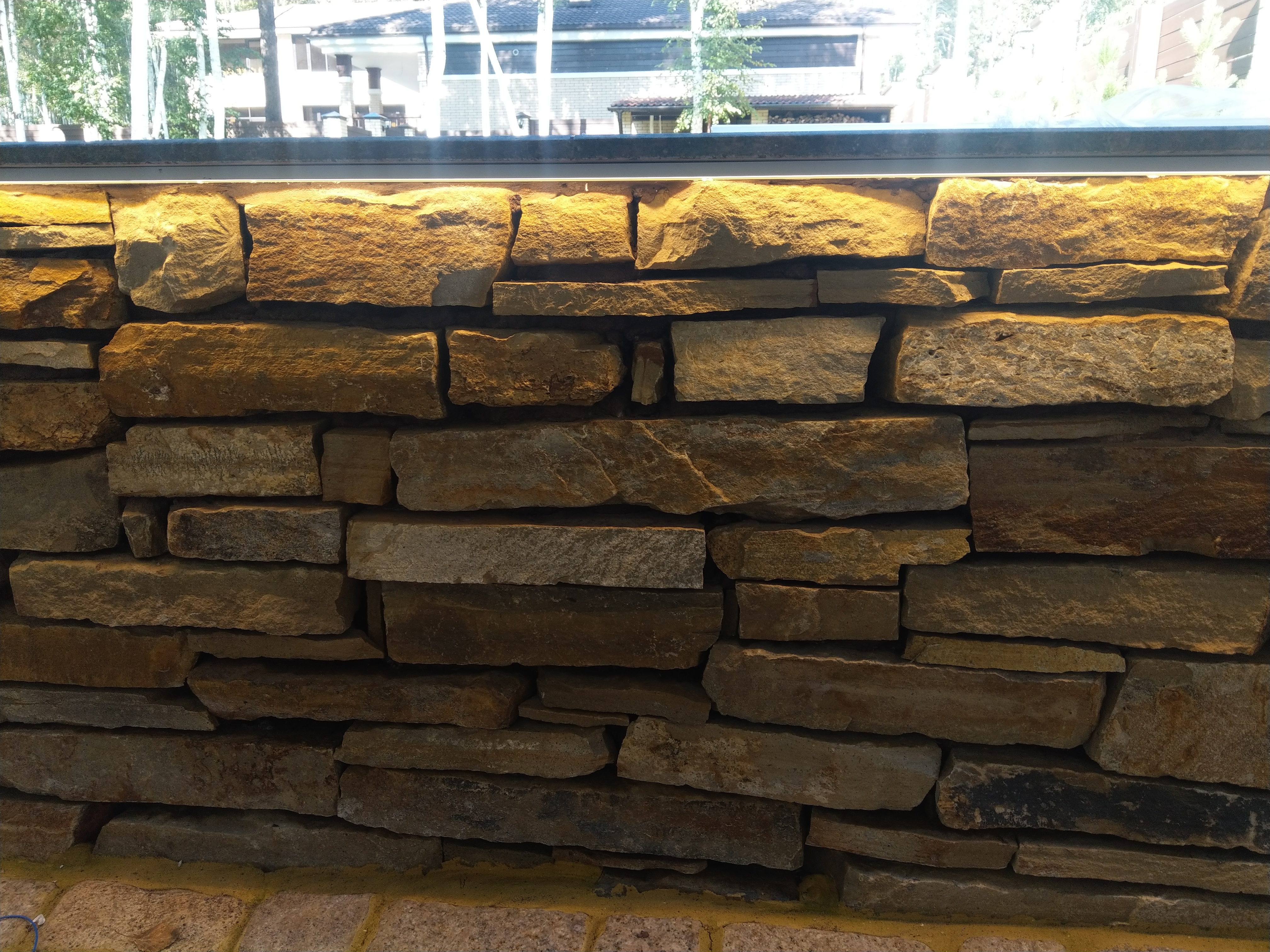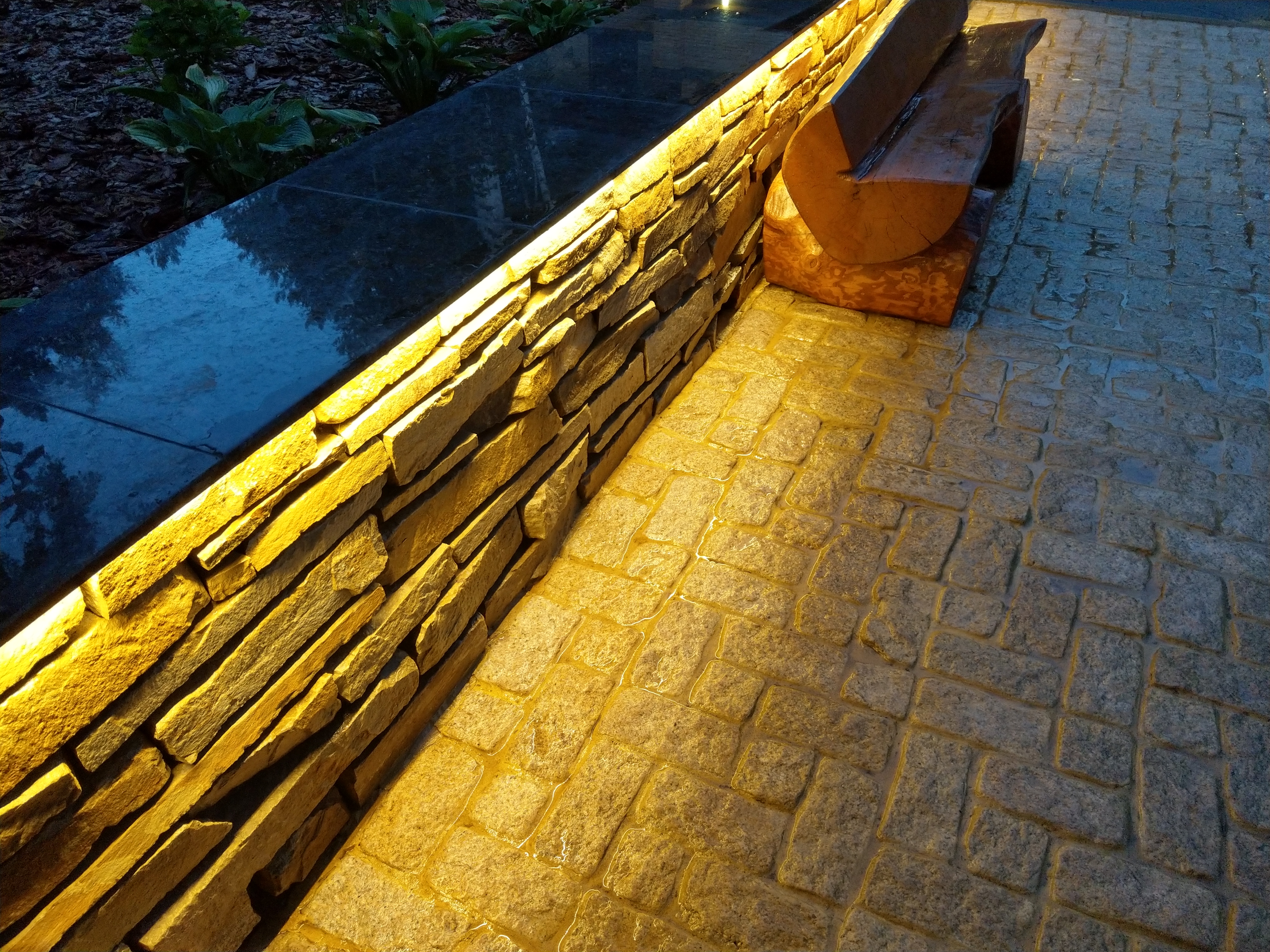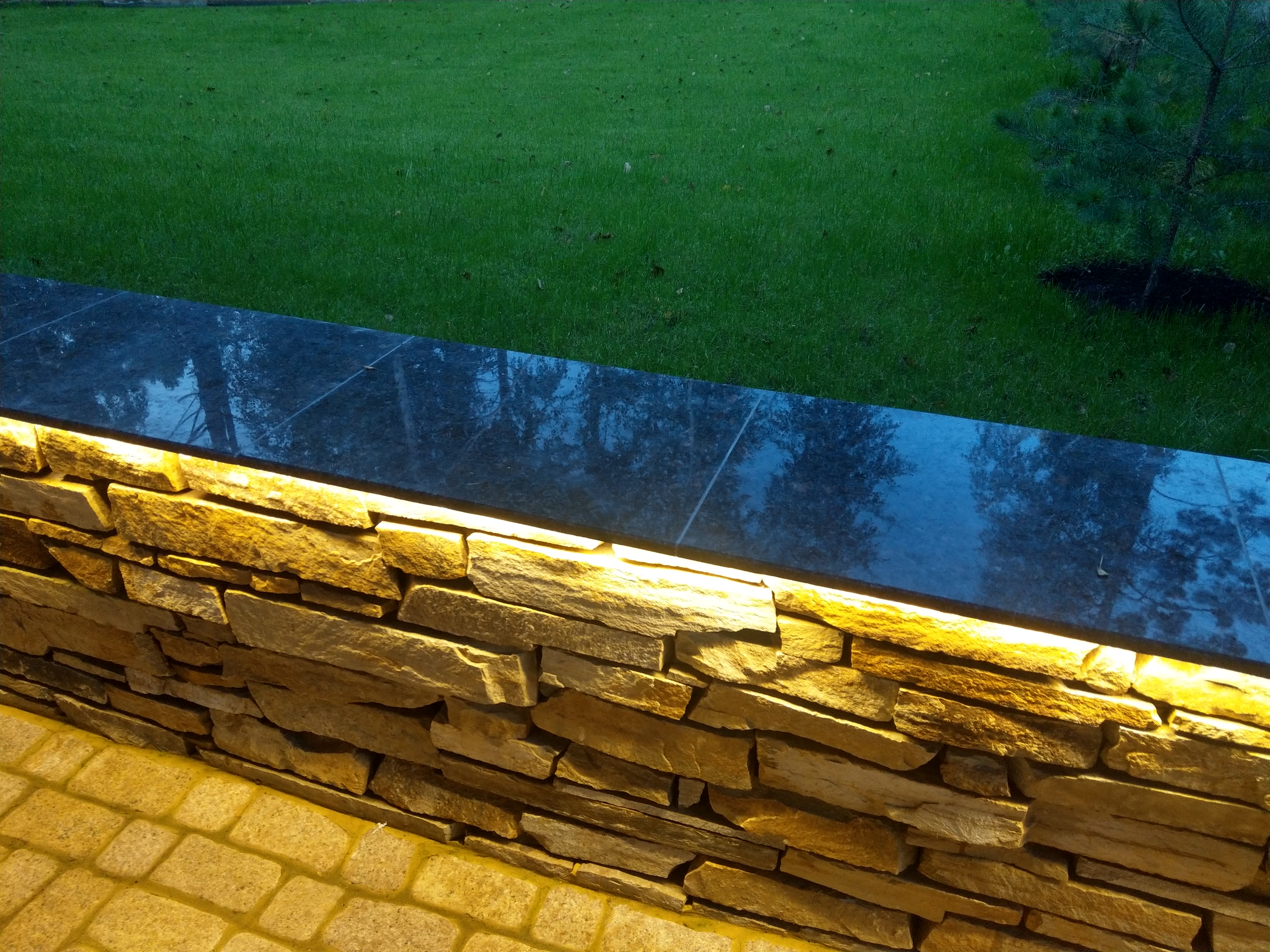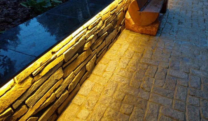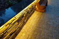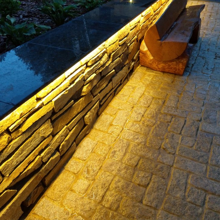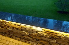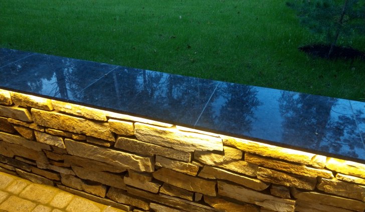 Профиль размещен таким образом, чтобы световой поток от ленты бал направлен вниз, освещая сам бруствер и мостовую. Для подсветки выбрана лента с цветовой температурой 2 700 К. Теплый оттенок свечения подчеркивает природный цвет камня, эффектно проявляет фактуру поверхности, создает по-настоящему уютную, способствующую релаксации, атмосферу.