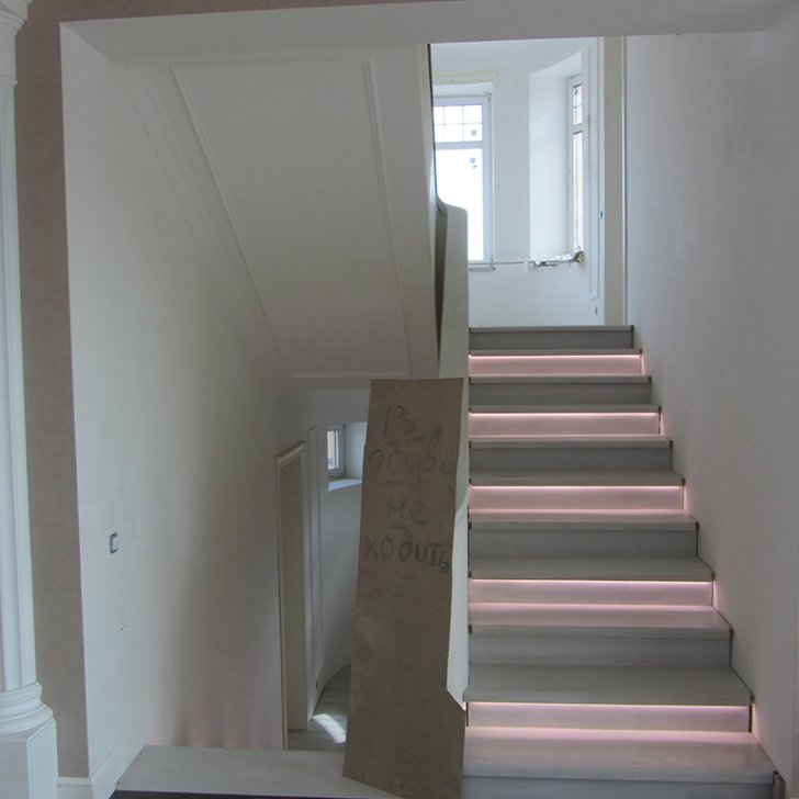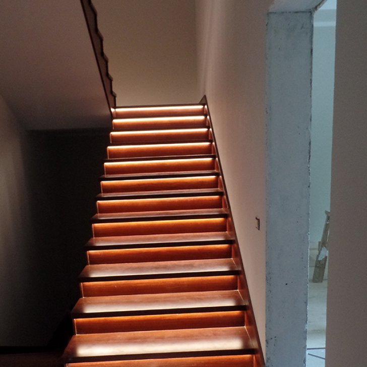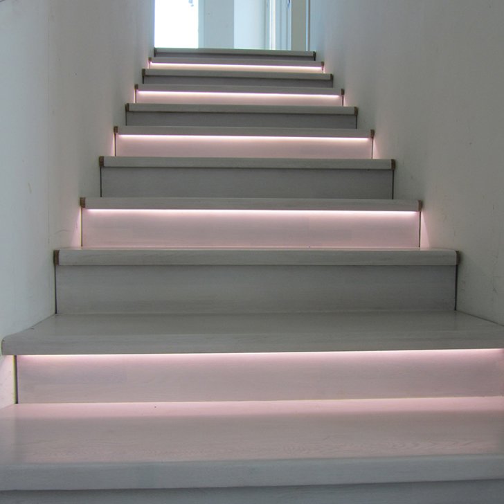 Самый простой и популярный вариант такого освещения используется, когда форма ступени позволяет разместить под её свесом светодиодную ленту. При таком расположении источник освещения не заметен, будет видно только мягкое свечение.