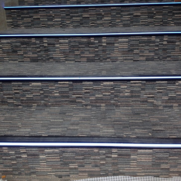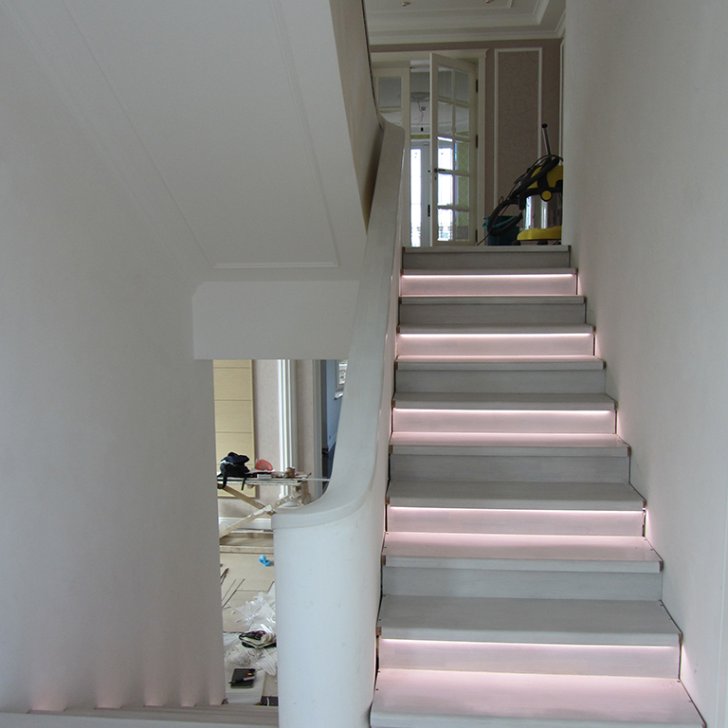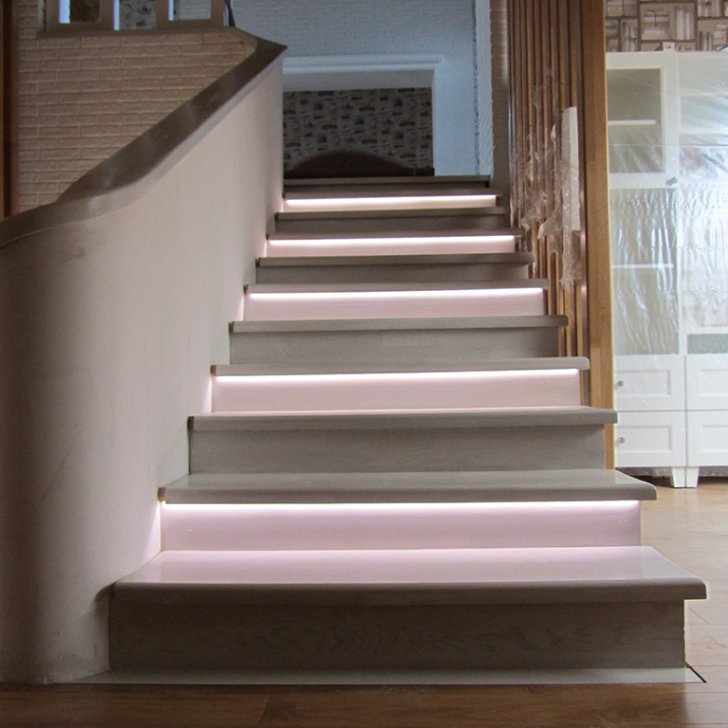 Более надёжный и универсальный вариант – использование специального алюминиевого профиля, который монтируется на угол ступени, а внутри него устанавливается светодиодная лента, которая, в зависимости от модели профиля, закрывается экраном или противоскользящей светопропускающей накладкой.