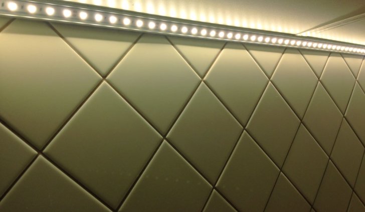Угловой профиль устанавливается под навесными шкафами на верхней границе фартука. В качестве источника освещения используется светодиодная лента. Оттенок свечения выбирается на вкус потребителя, но важно учитывать удобство работы и то, как выглядят продукты питания в том или ином свете. Например, не рекомендуются холодные оттенки.