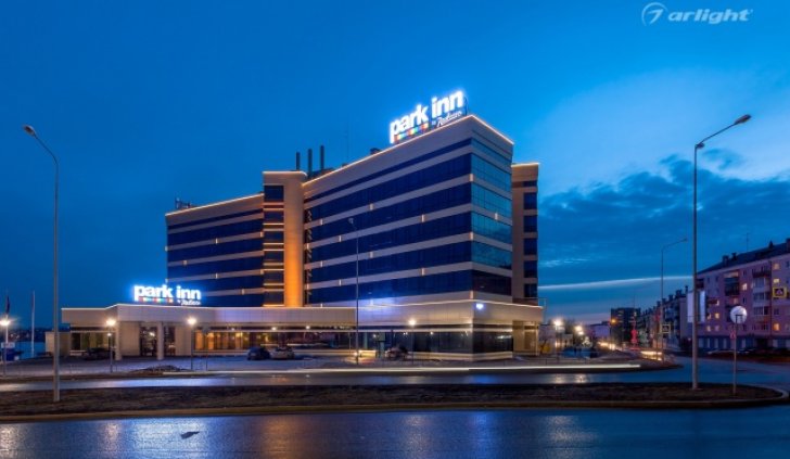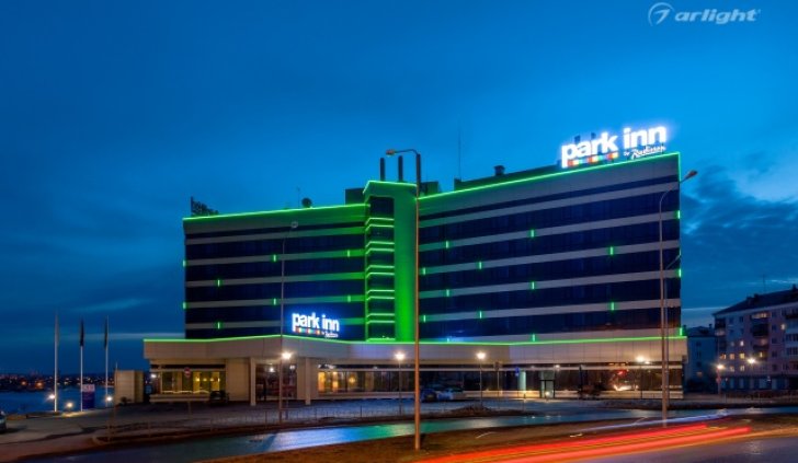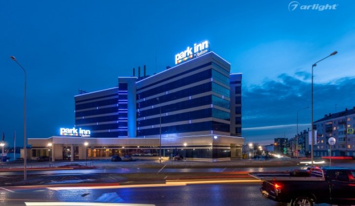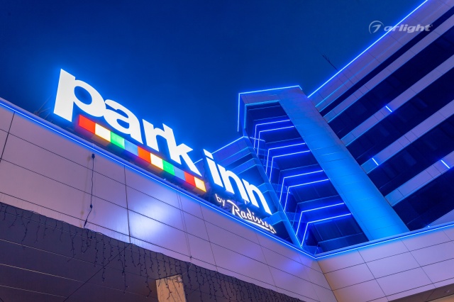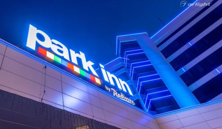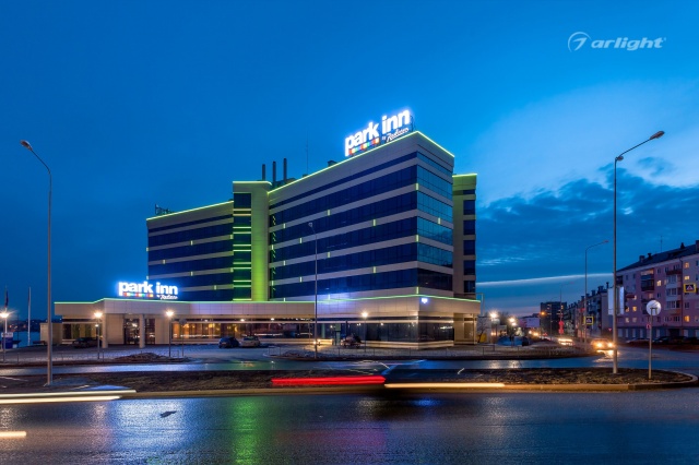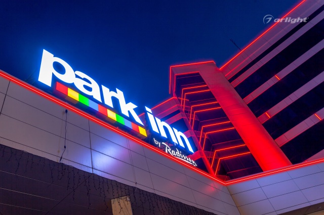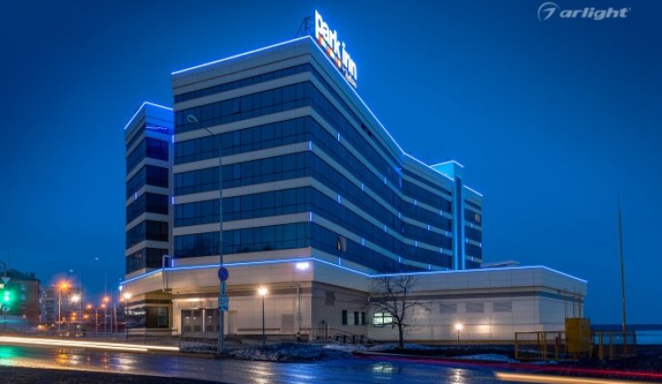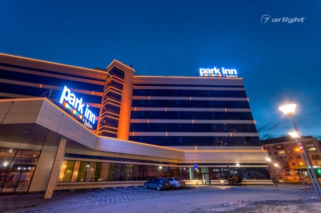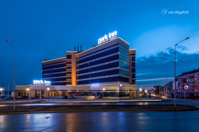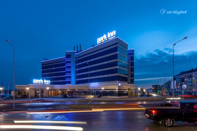 Геометричные формы здания отеля Park Inn в Нижнем Тагиле подчёркнуты контурной подсветкой. Подсветка выполнена из многоцветной светодиодной ленты на базе алюминиевого профиля. Профиль закрыт матовыми экранами, которые создают более мягкий и рассеянный свет.