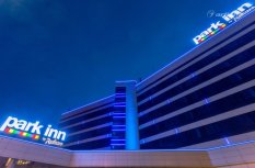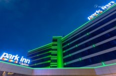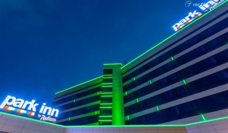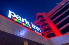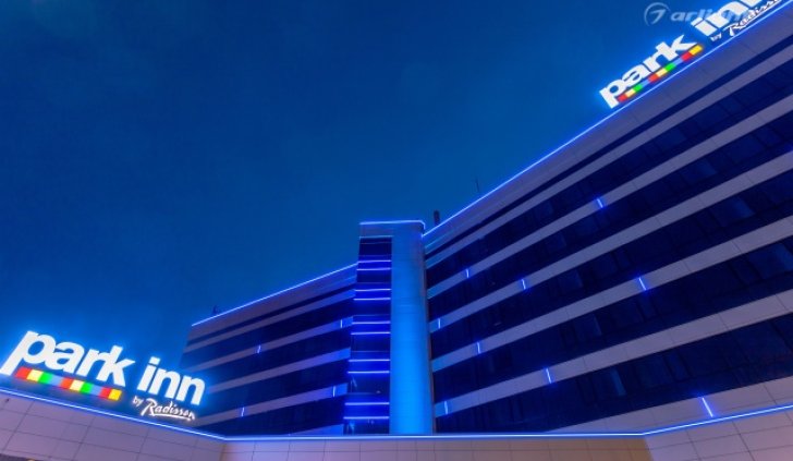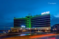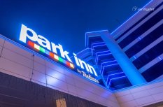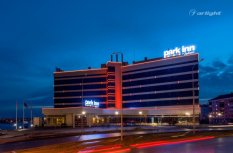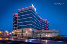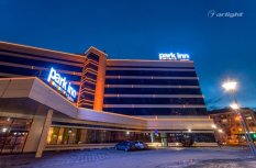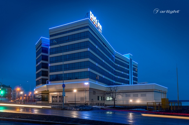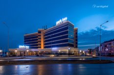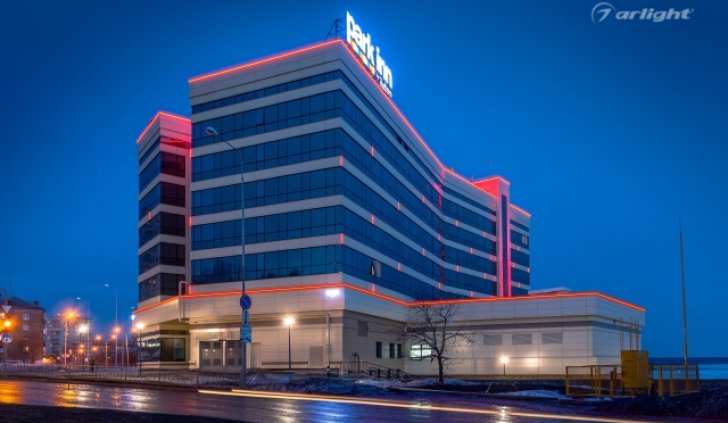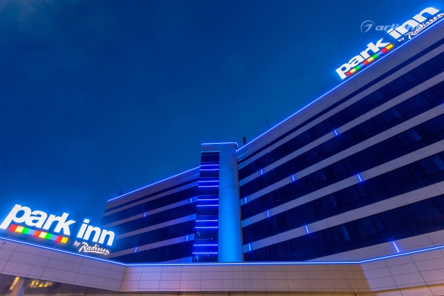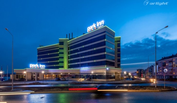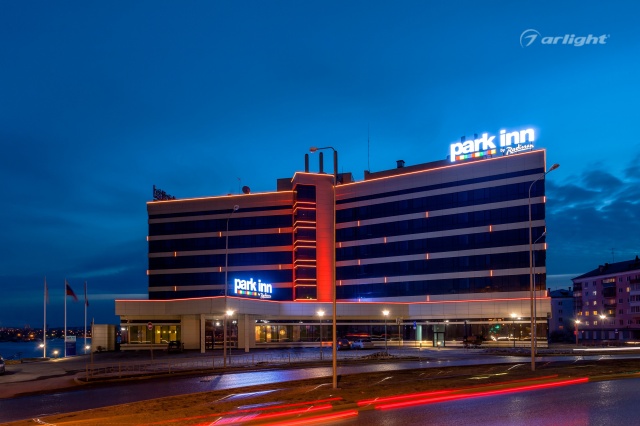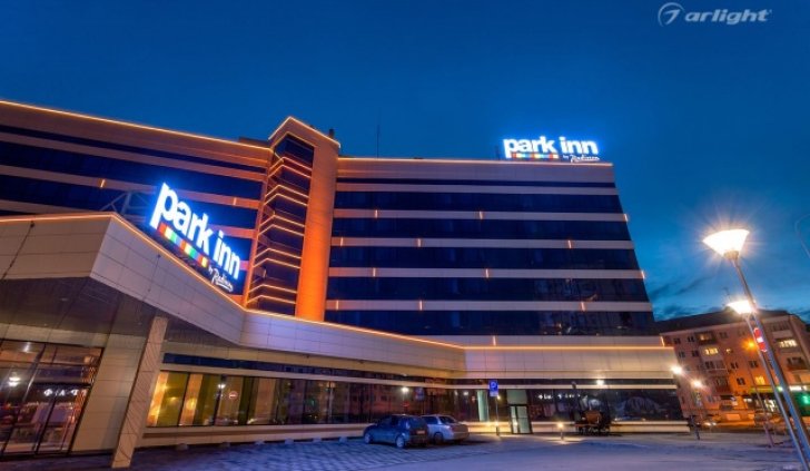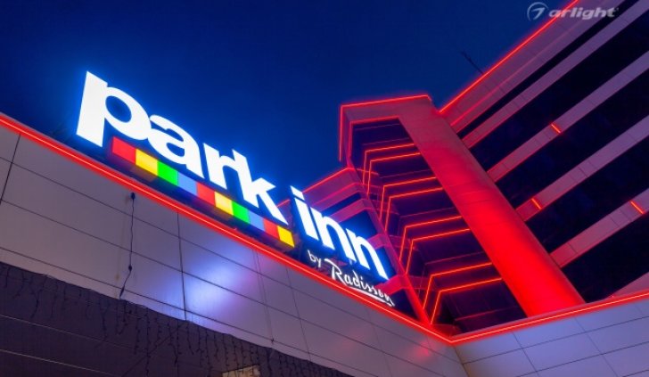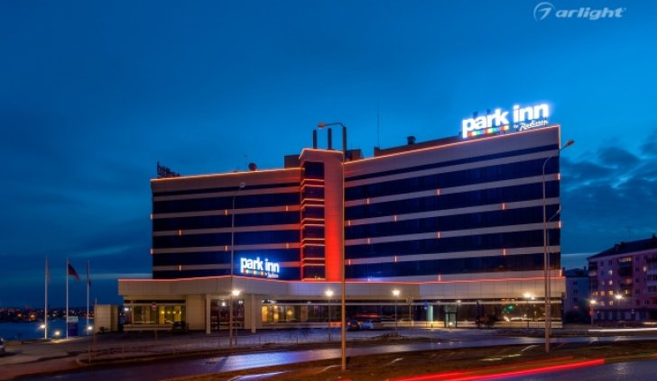 Геометричные формы здания отеля Park Inn в Нижнем Тагиле подчёркнуты контурной подсветкой. Подсветка выполнена из многоцветной светодиодной ленты на базе алюминиевого профиля. Профиль закрыт матовыми экранами, которые создают более мягкий и рассеянный свет.