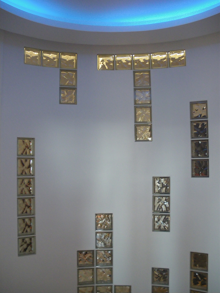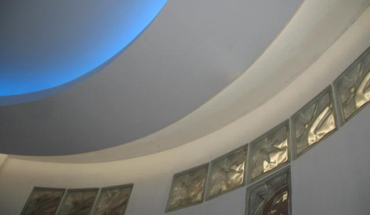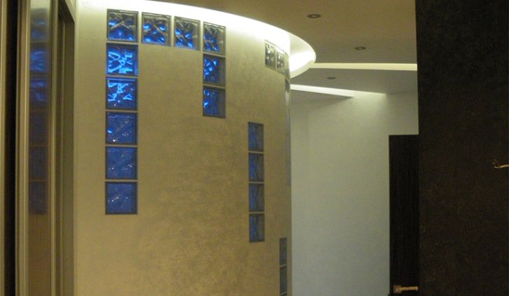В холле потолок выделен нишей в форме круга, для его подсветки была выбрана светодиодная лента RGB, чтобы владельцы квартиры имели возможность менять цвет декоративной подсветки.