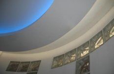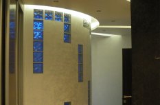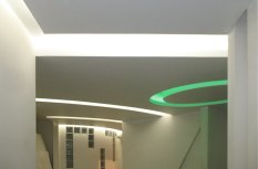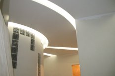 В довольно длинном коридоре потолок из гипсокартона повторяет нестандартную криволинейную форму помещения. В нишах, идущих вдоль стен, была установлена светодиодная лента Arlight дневного белого свечения. Эта подсветка выполняет сразу две функции: декоративную, подчеркивая форму интерьера, и фоновую, для не очень яркого освещения, которое может пригодиться ночью.