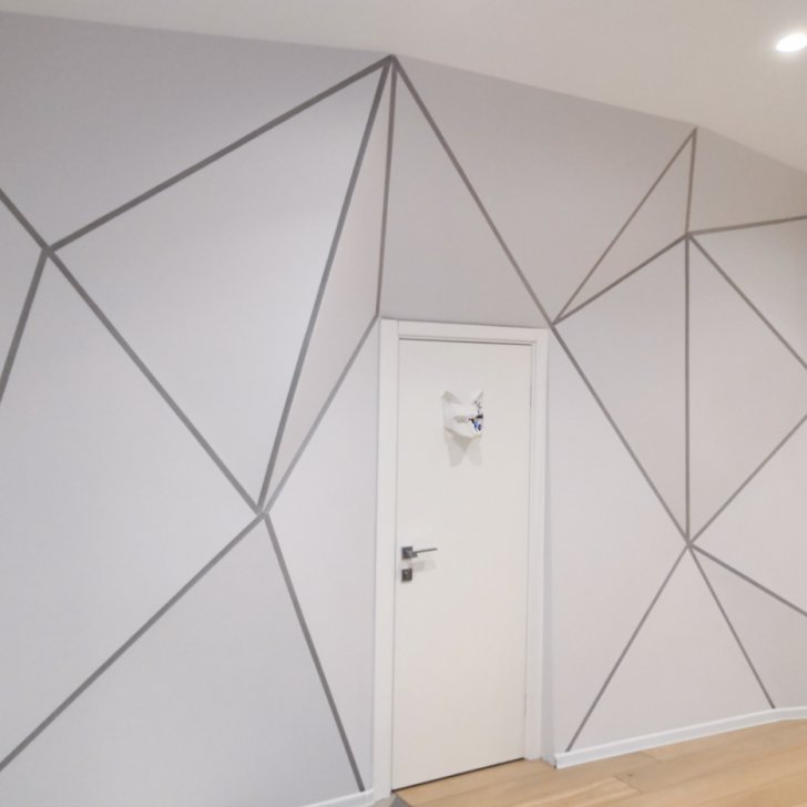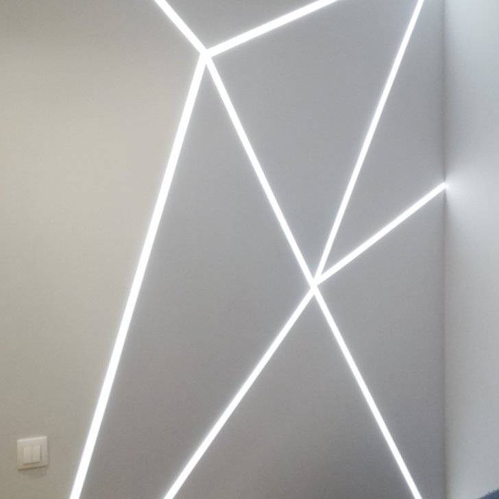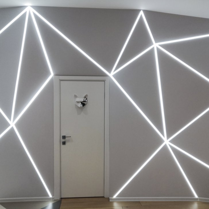 В одном из помещений таунхауса была создана в прямом смысле яркая стена. Объёмная геометрия подчеркивается композицией из встроенных алюминиевых профилей, которые образуют геометрический рисунок световых линии и создают максимально выраженный эффект многогранной стены.