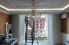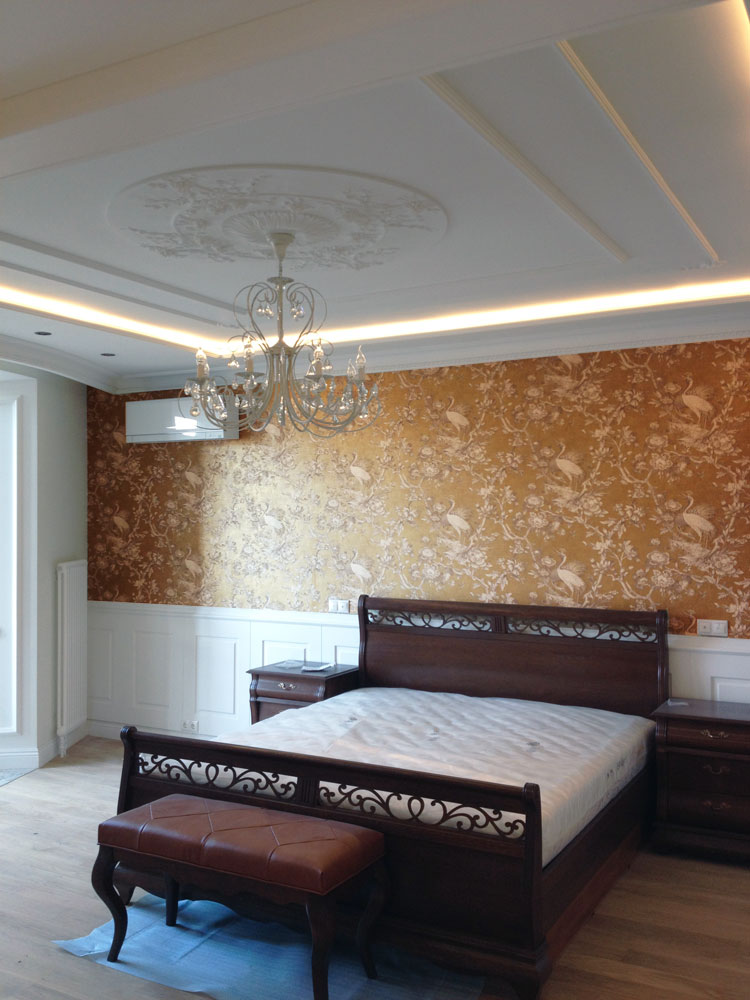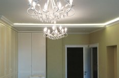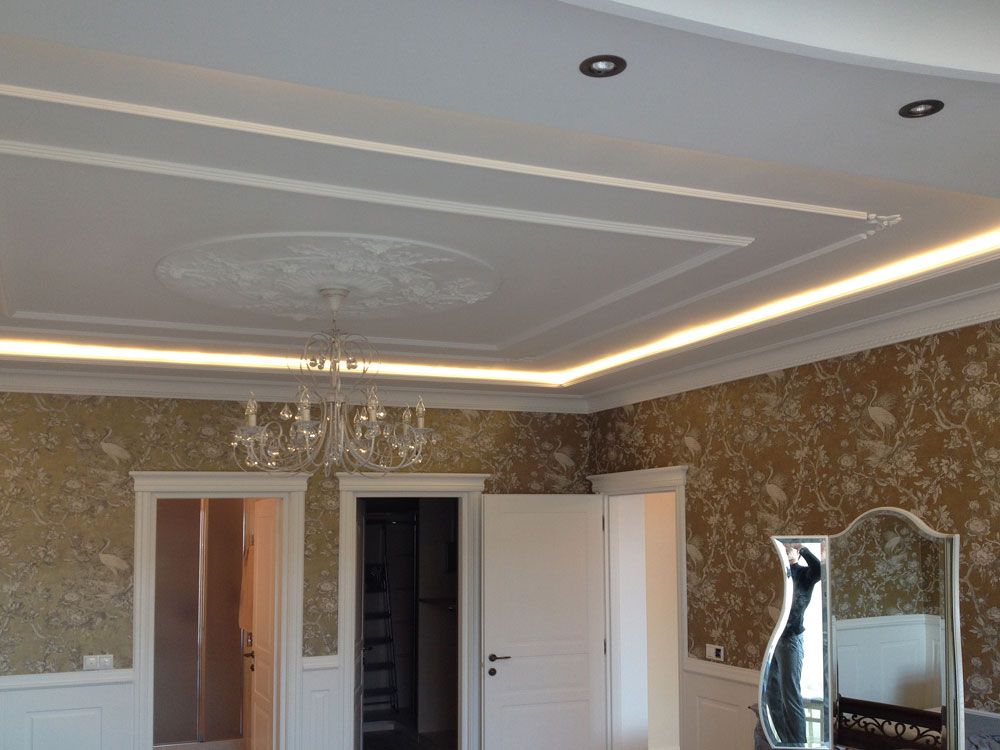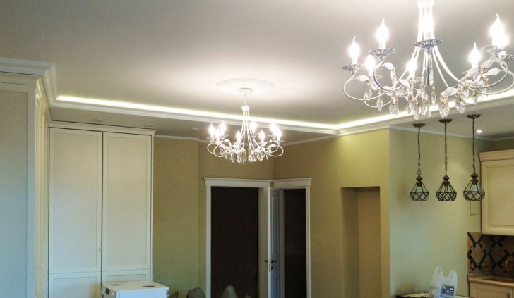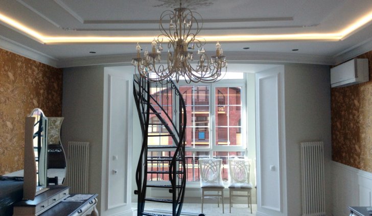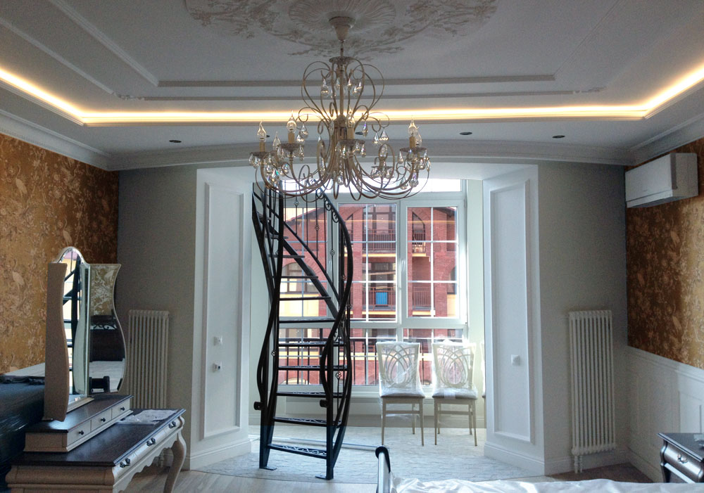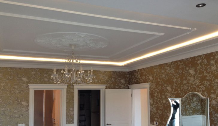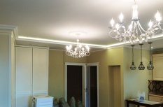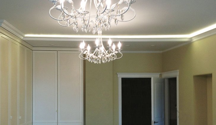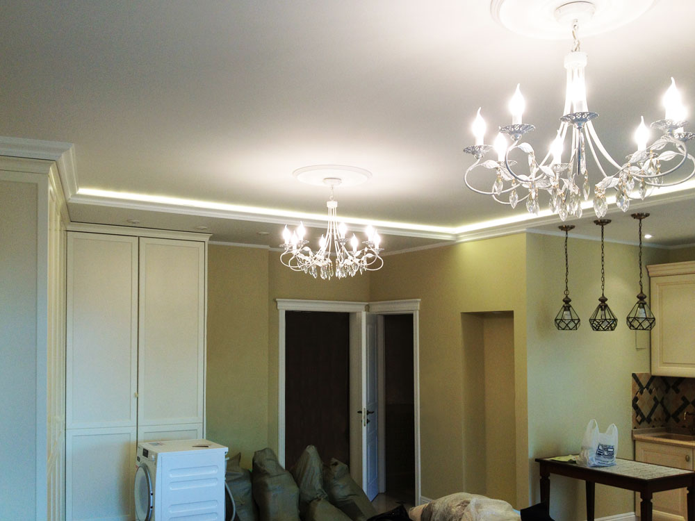 Неоновая подсветка потолка, установленная в этой квартире ранее, уже устарела, потребляла большое количество электроэнергии и потеряла яркость. Поэтому было решено демонтировать старый неон, а на его место установить светодиодную ленту.