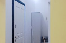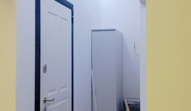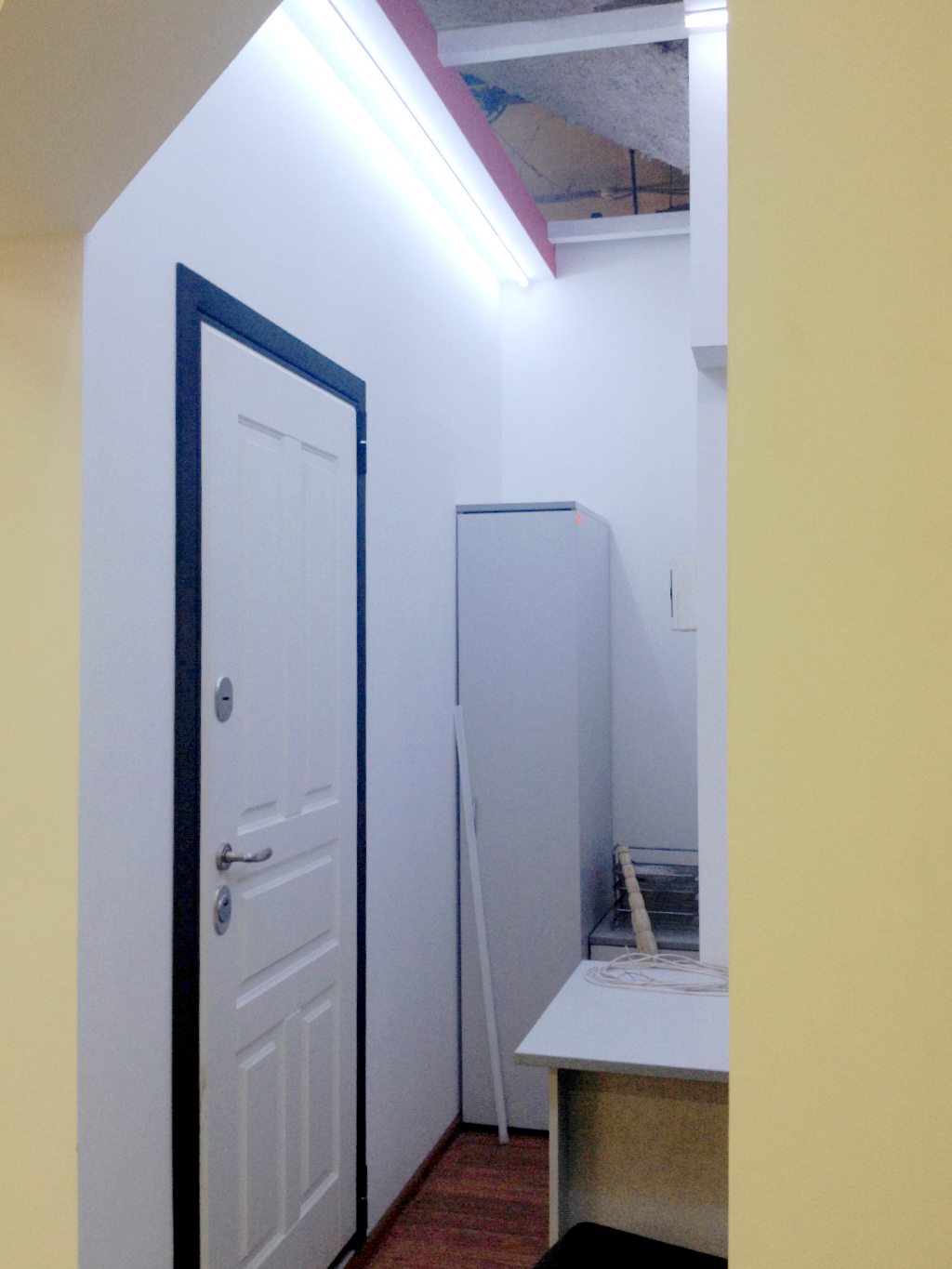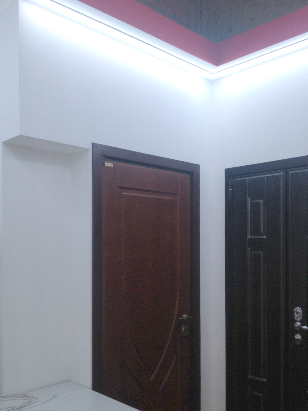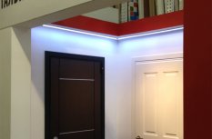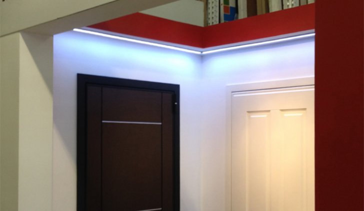 Для организации подсветки над стендами с дверями был установлен короб, на нижнюю часть которого установили плоский алюминиевый профиль со светодиодной лентой. Конструкция закрыта матовым экраном, рассеивающим яркий свет. В качестве источника освещения использовалась двухрядная многоцветная светодиодная лента RGB. Светодиодная лента большой мощности для стабильной и надёжной работы нуждается в теплоотводе, который и обеспечивает алюминиевый профиль.