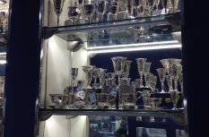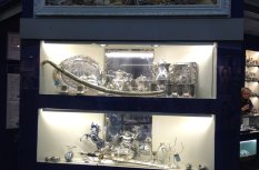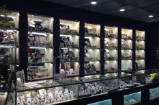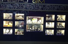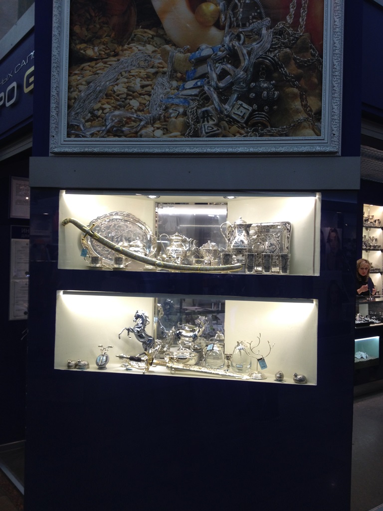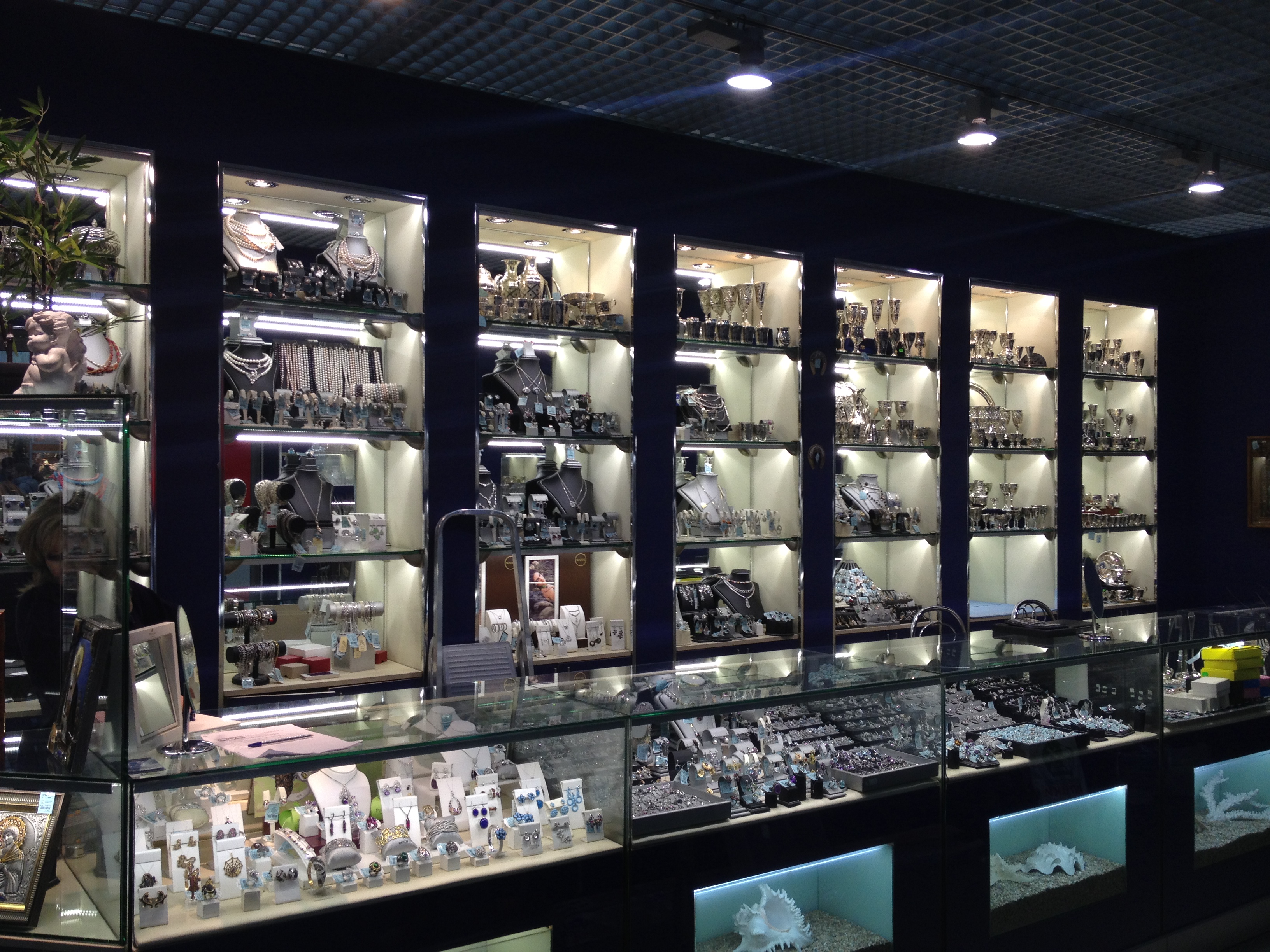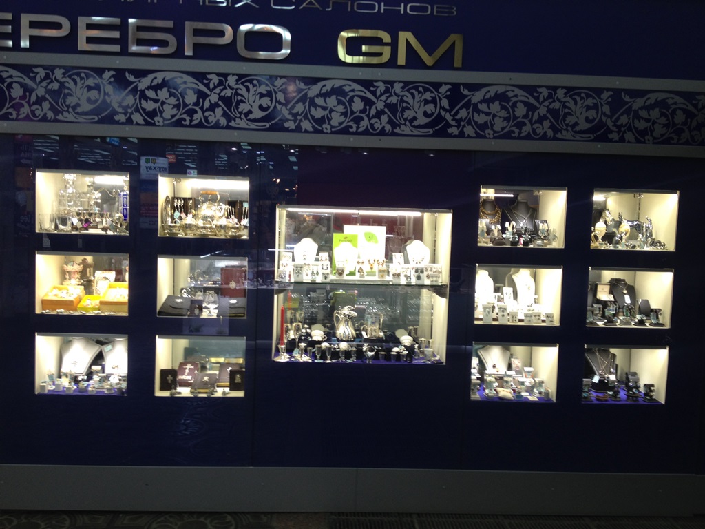 Витрины ювелирного магазина в торговом центре оформлены в виде стендов с многочисленными нишами, в которых располагается товар. Для привлечения внимания посетителей сами стенды выполнены в корпоративном синем цвете, а внутренняя часть ниш контрастного белого цвета. Этот эффект усиливает светодиодная подсветка, установленная в каждой витрине, нише или полке.