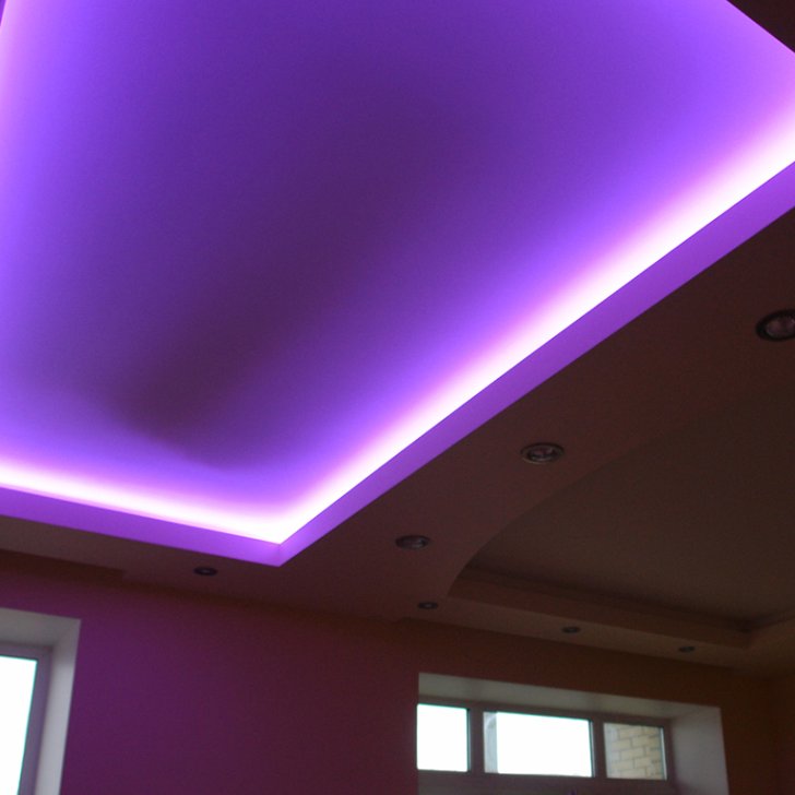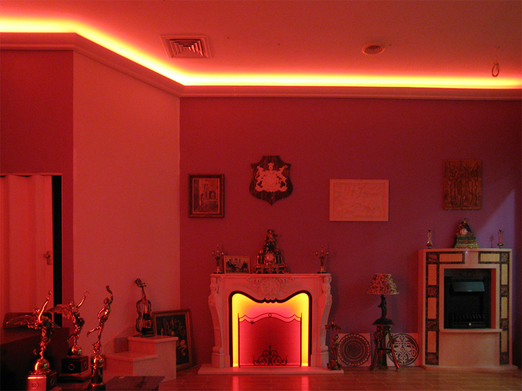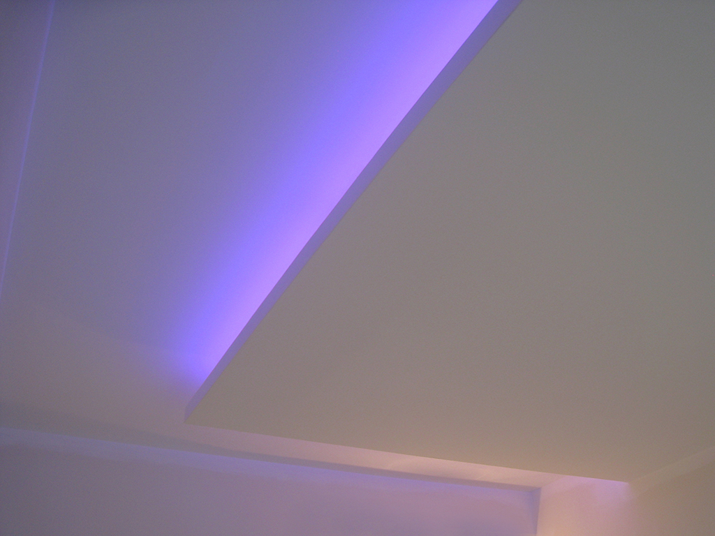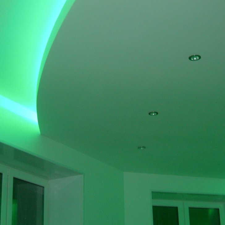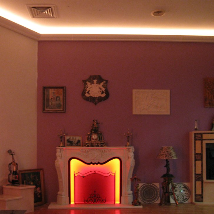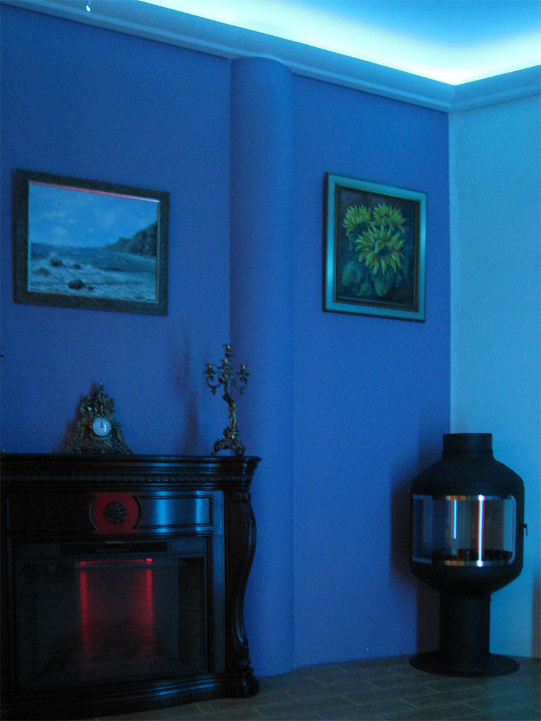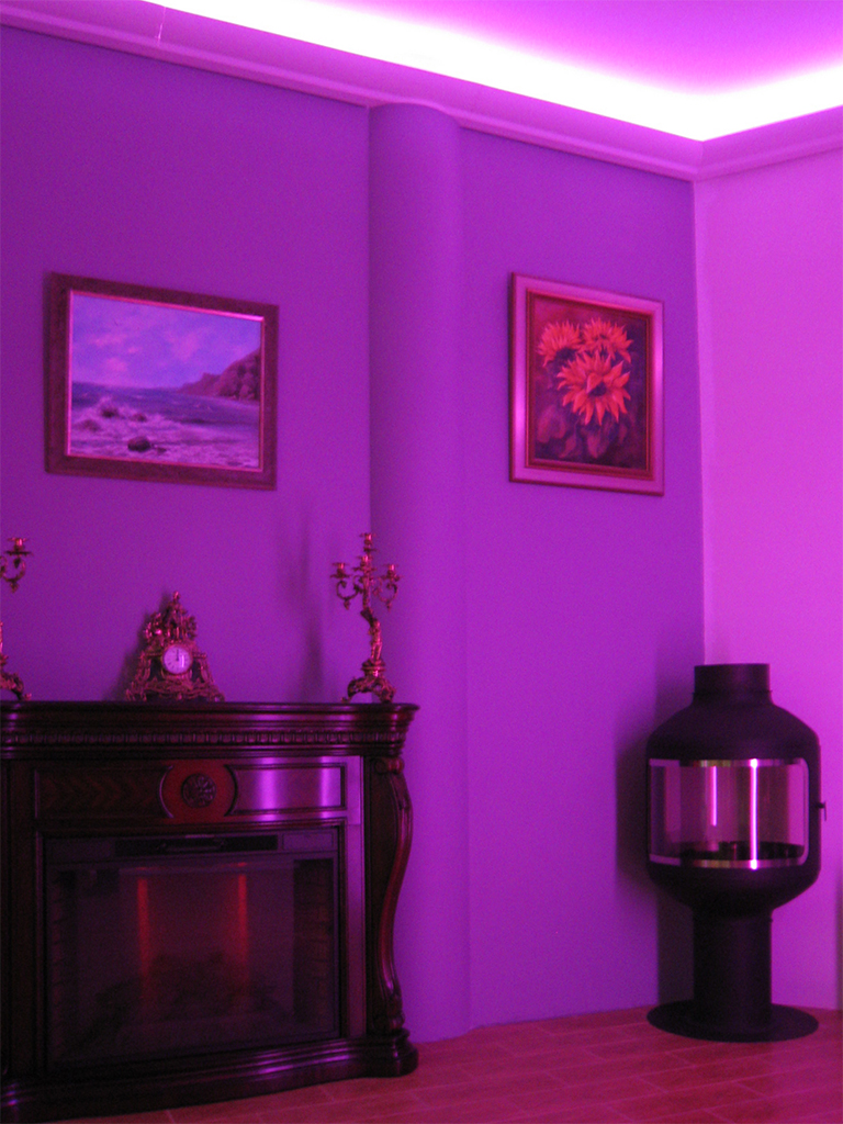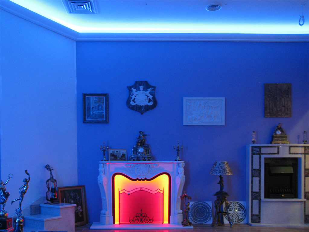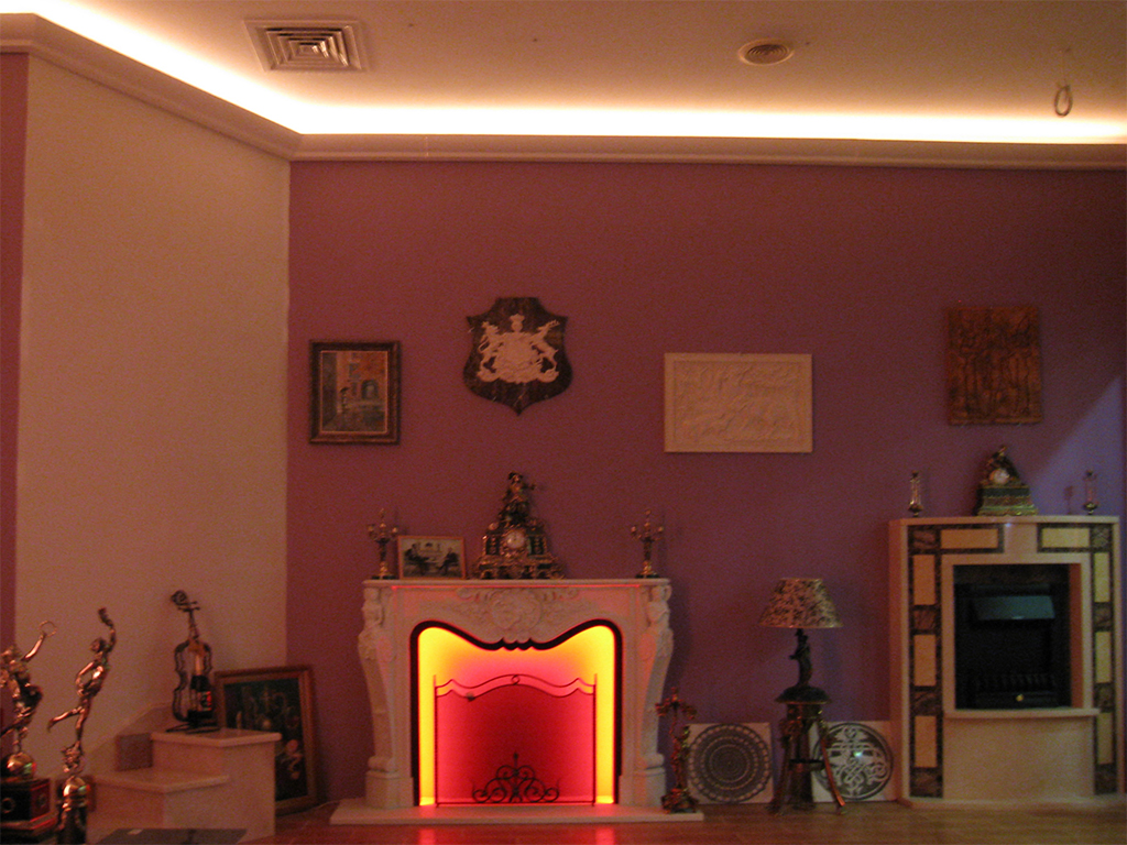 На фотографиях выполненных нами проектов Вы можете увидеть различные типы многоцветной подсветки. Светодиодная RGB лента Arlight устанавливается в многоуровневые потолки и ниши, карнизы, а также декоративные элементы, например, камин. На одном из примеров показан необычный светодиодный светильник.
