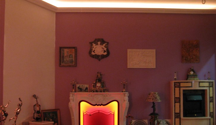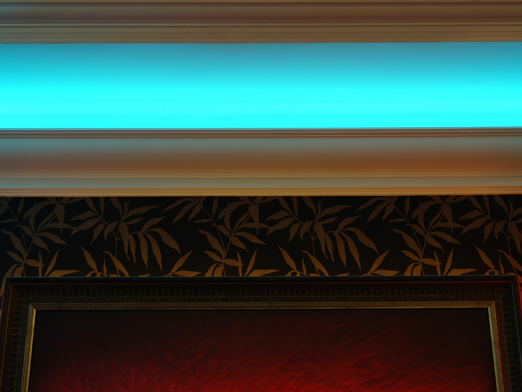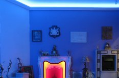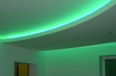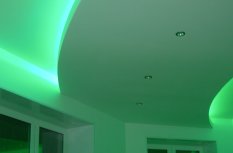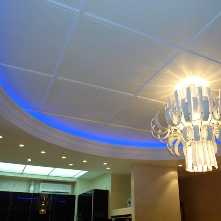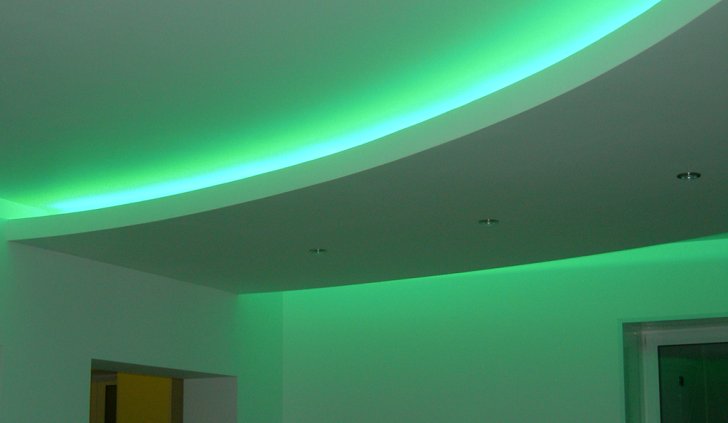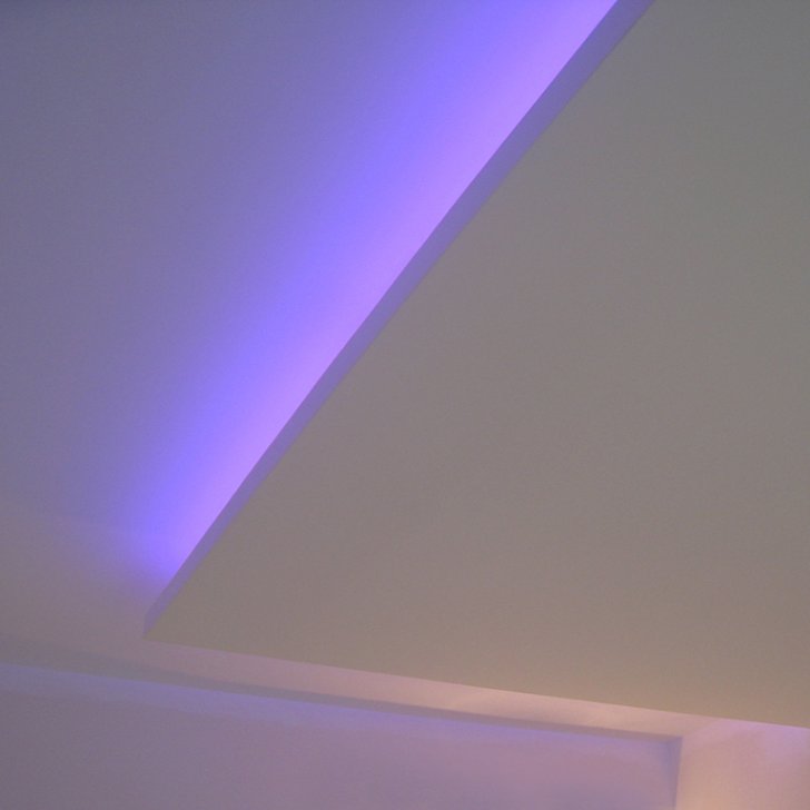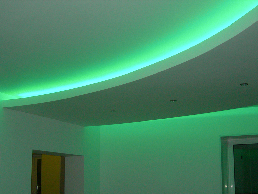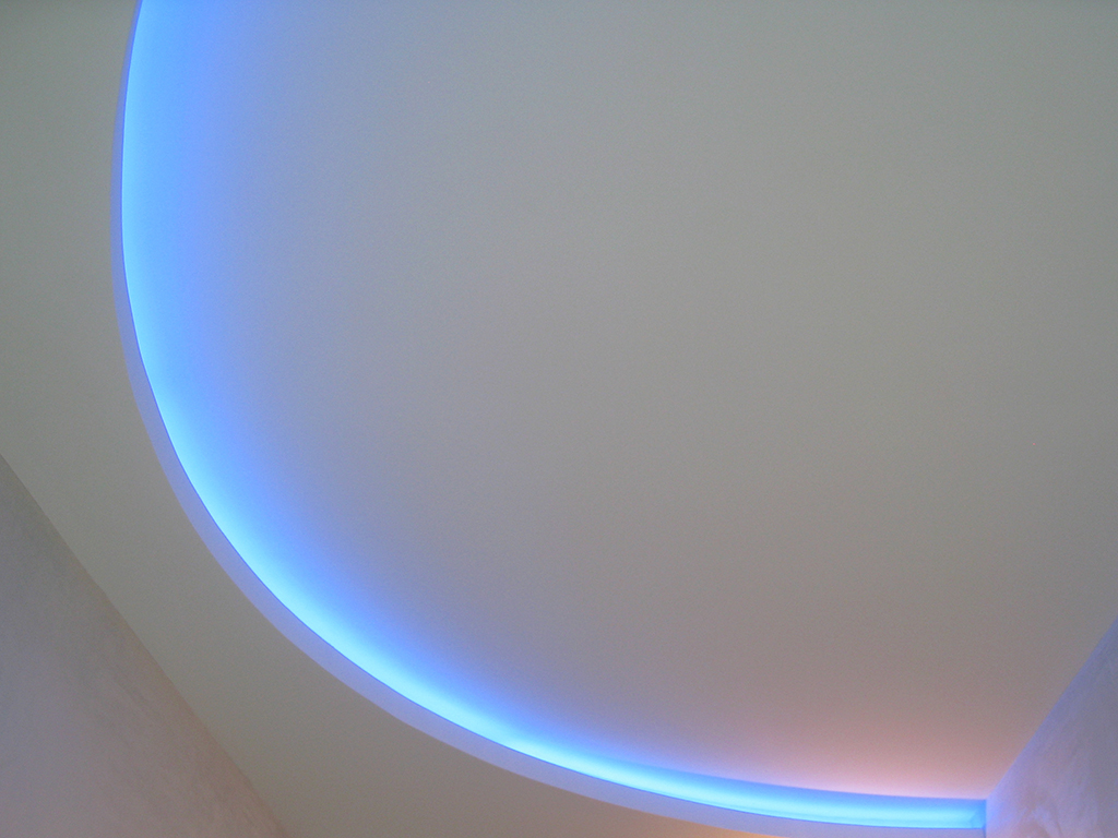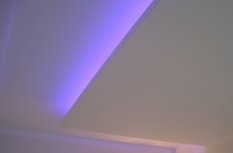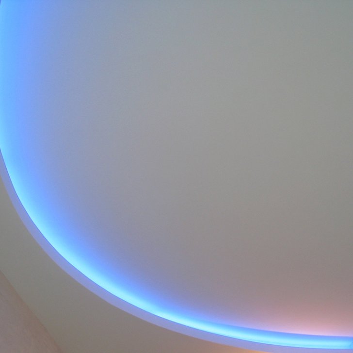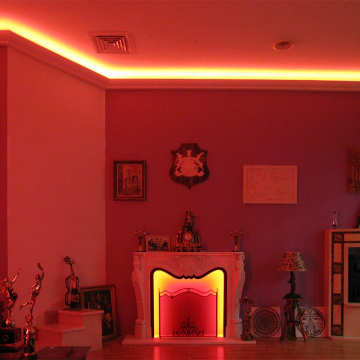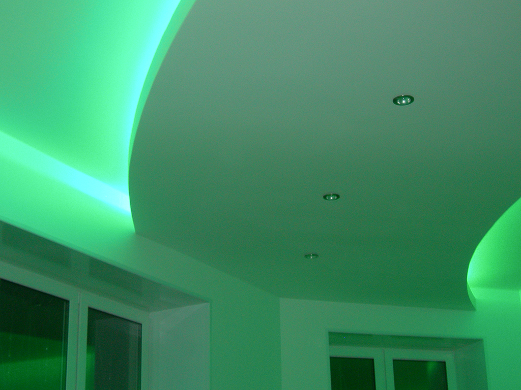 На фотографиях выполненных нами проектов Вы можете увидеть различные типы многоцветной подсветки. Светодиодная RGB лента Arlight устанавливается в многоуровневые потолки и ниши, карнизы, а также декоративные элементы, например, камин. На одном из примеров показан необычный светодиодный светильник.