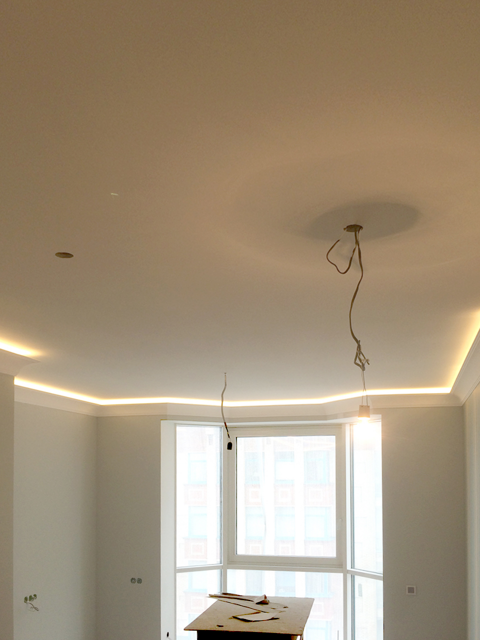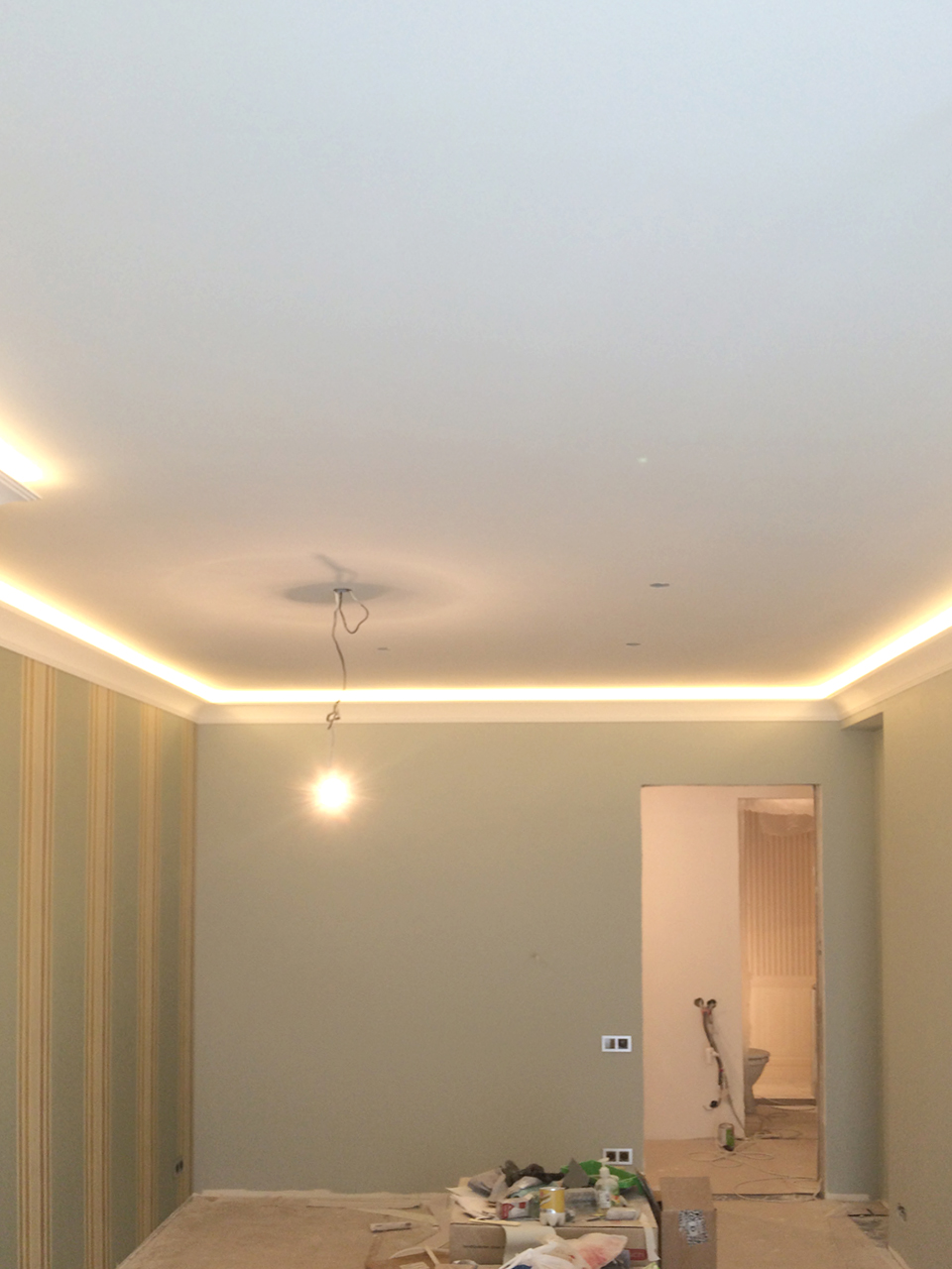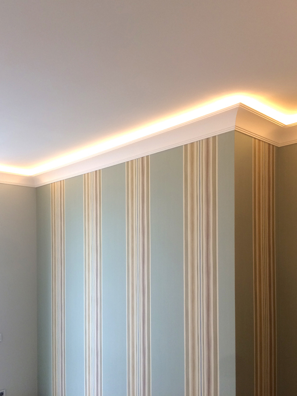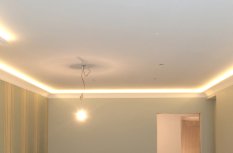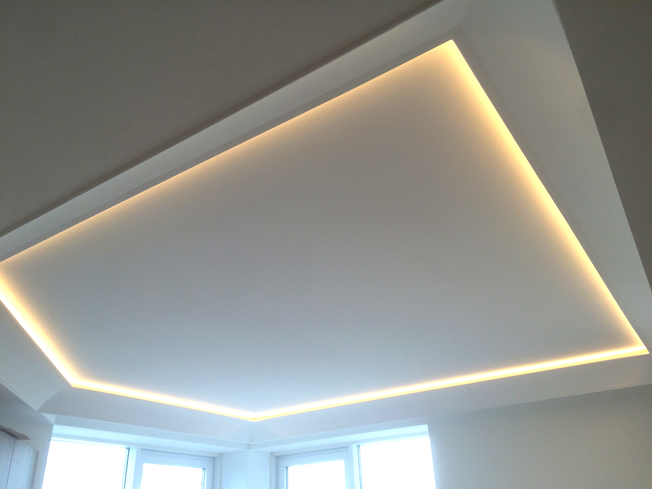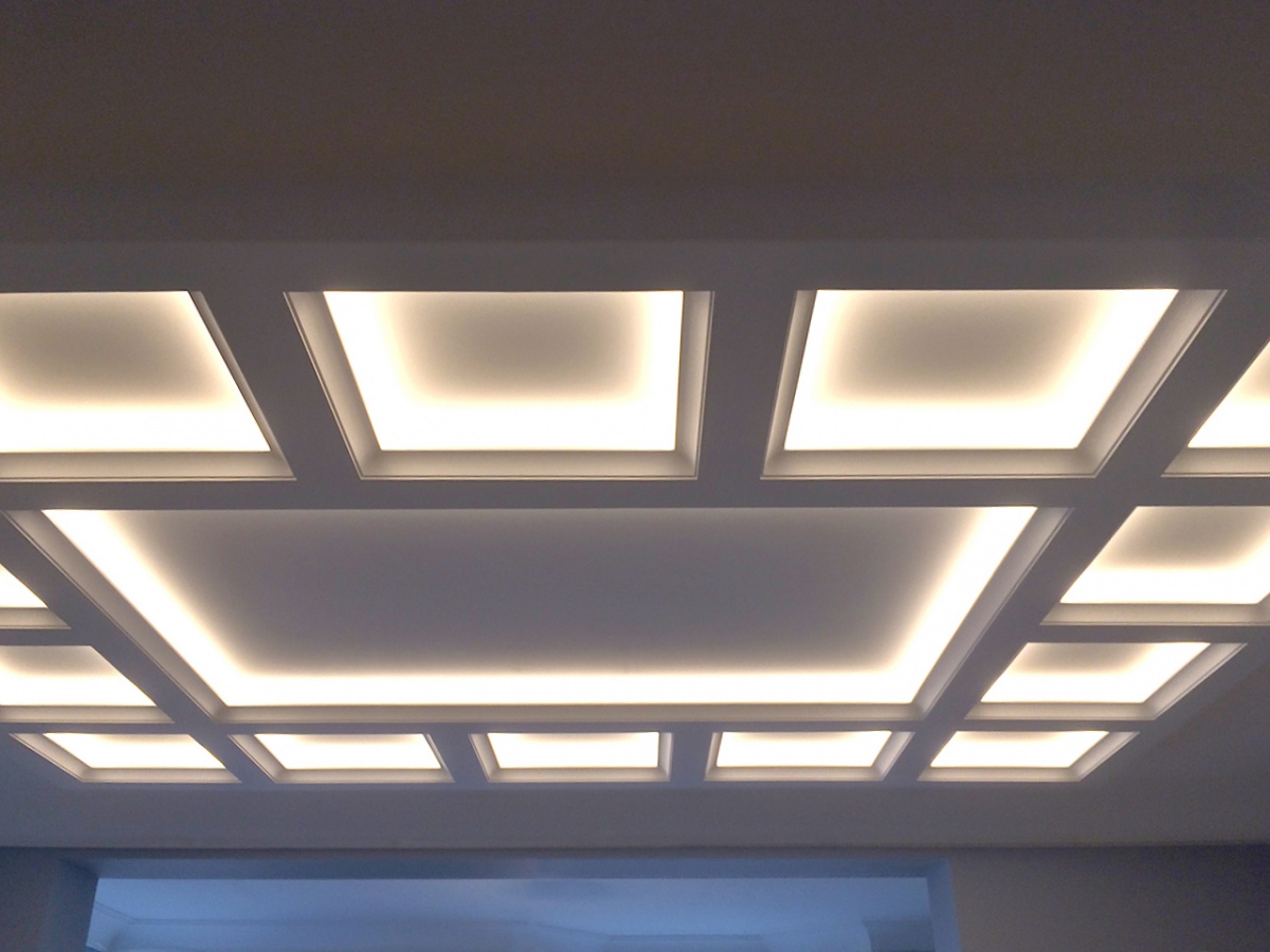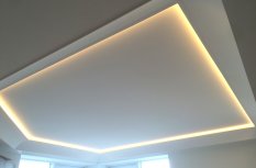 Все светодиодные ленты установлены таким образом, что свет направлен к центру потолка, а не вверх. Это увеличивает освещённость и позволяет использовать светодиодную подсветку как мягкое фоновое освещение вместо интенсивного основного, когда есть такая потребность.