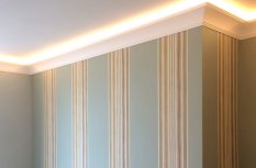 В одной из московских квартир была выполнена светодиодная подсветка на базе оборудования Arlight. Практически каждое помещение оформлено лаконичными классическими карнизами, которые подсвечены светодиодными лентами тёплого оттенка. Более сложные потолочные конструкции в форме кессонов также оформлены подсветкой.