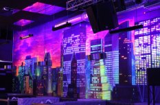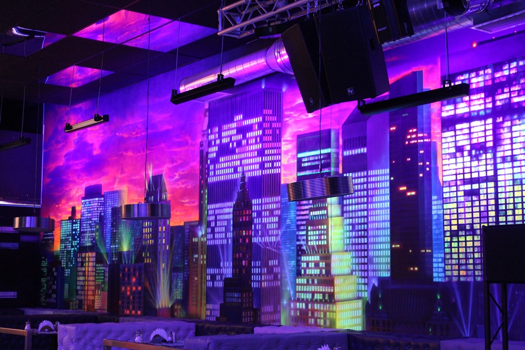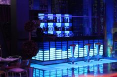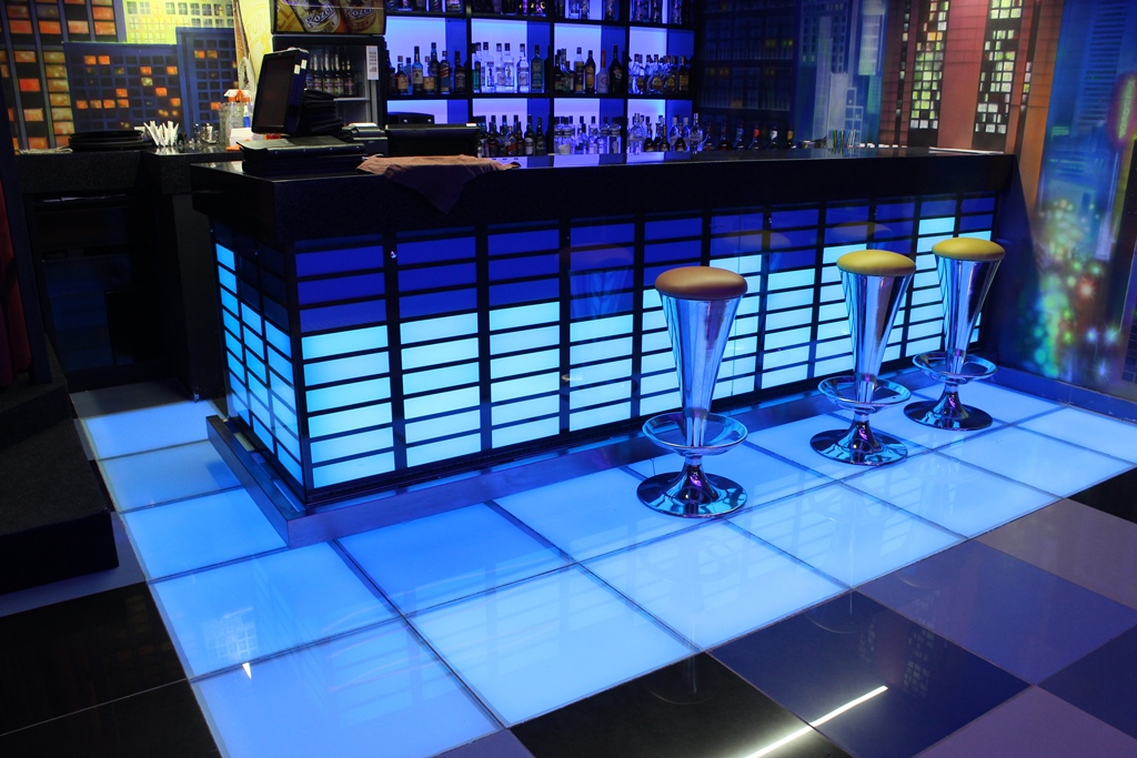 Синие, голубые и фиолетовые насыщенные квадраты, двигающиеся в такт музыке удивляет всё новых и новых посетителей ночного клуба. Также в дизайн входит подсветка полок с алкоголем и верхняя подсветка барной стойки белым светом. Пол по примеру стойки тоже оборудован светодиодными лентами голубого цвета.