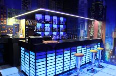 Для оформления центра клубной жизни применялось огромное разнообразие светодиодного оборудования Arlight. Экран с движущимися индикаторами был установлен на барной стойке, чем отлично дополнил и осветил её. Основой идеей послужило использование светопускающего пластика и, непременно, светодиодной ленты Arlight. Рабочая зона (за барной стойкой) была оснащена светодиодным светильником, изготовленным на заказ. Он был сделан на основе подвесного алюминиевого профиля для светодиодной ленты и самой LED ленты внутри него. Освещение ночного клуба получилось довольно ярким, но, в то же время, необычным и завораживающим взгляд.