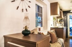 При оформлении кухни были выбраны энергосберегающие технологии: светодиодные светильники Arlight, закрепленные на треке. За счет особой конструкции пучок лучей света можно направлять в разные стороны, передвигая осветительные элементы. На открытых полках шкафа монтированы светодиодные ленты, отличающиеся теплым мягким свечением. Если учесть, что эти ленты Arlight монтированы в нишах полок, то дизайнеры предусмотрели не только декоративную функцию освещения, но и практическую.
