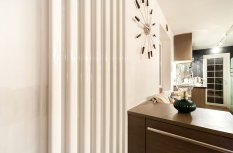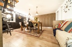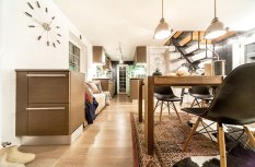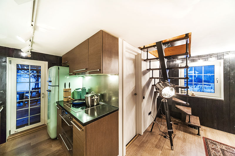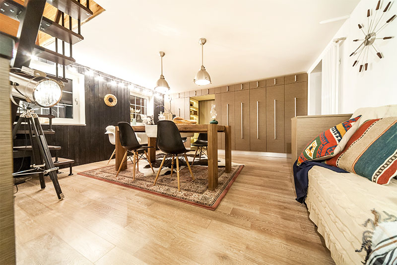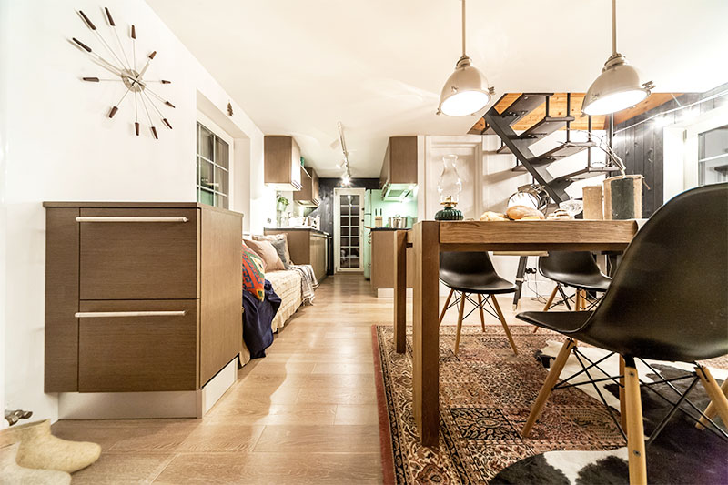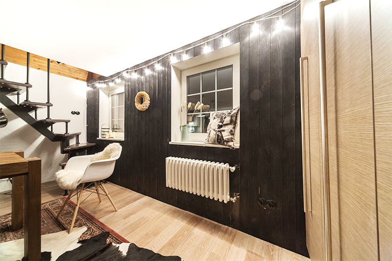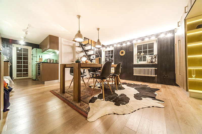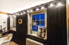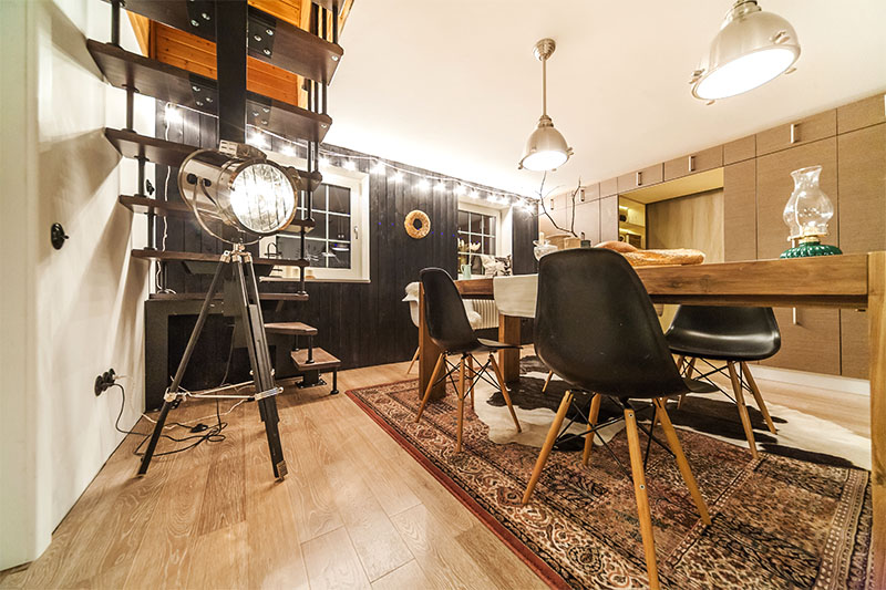 Старинная гирлянда – это хороший повод не забывать свою историю. При этом авторы, желающие не забывать прошлое, заботятся и о будущем. Для этого установлен кинематографический прожектор, явно намекающий на то, что старший сын хозяев дома учится на кинорежиссера. Современные светодиодные светильники – это новый взгляд на реконструкцию дома.