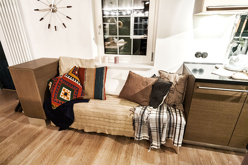 Работа дизайнеров заключалась в объединении четырех маленьких помещений в одно целое с последующим разделением их на зоны с помощью осветительного оборудования. Гостиная после переделки стала включать в себя библиотеку, кинопрожектор и стул для маленького принца. Освещение помещения было осуществлено с помощью особенного способа. Для оформления главного источника света дизайнеры изготовили по авторскому эскизу гирлянду из лампочек. Ручная работа, закрепленная на витом проводе, стала настоящим историческим объектом, так как внешне напоминает атрибут деревенской жизни прошедших лет.