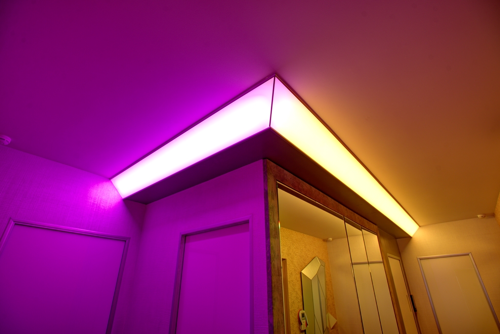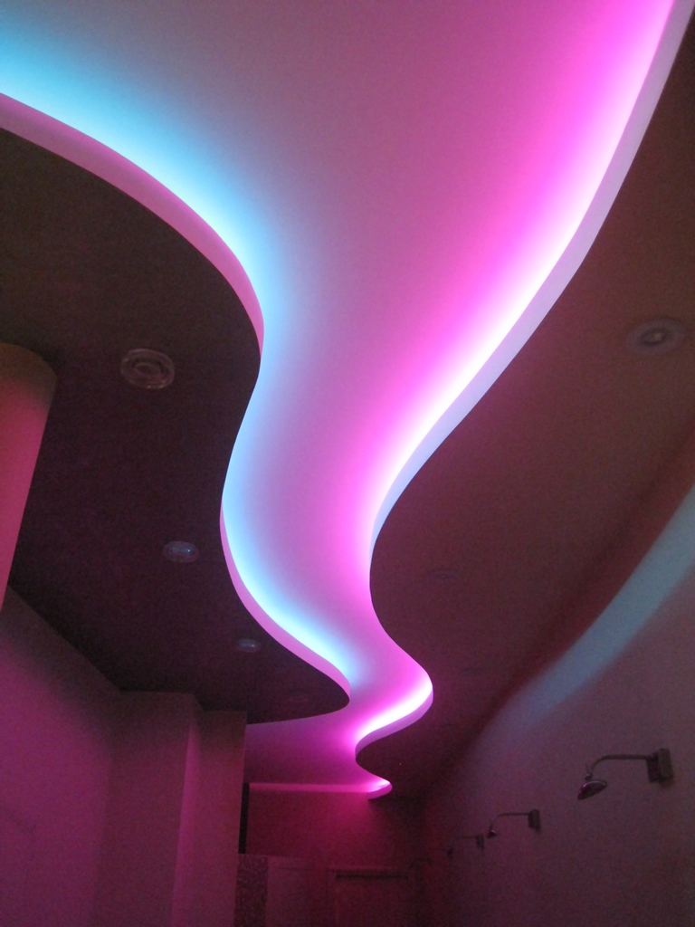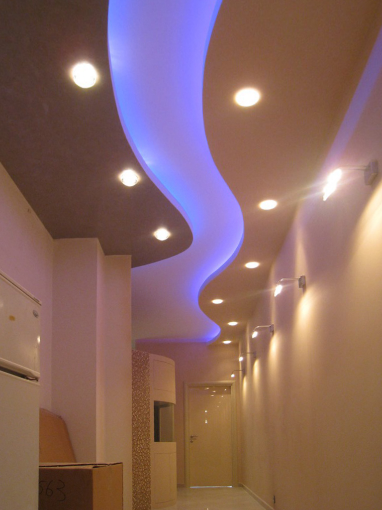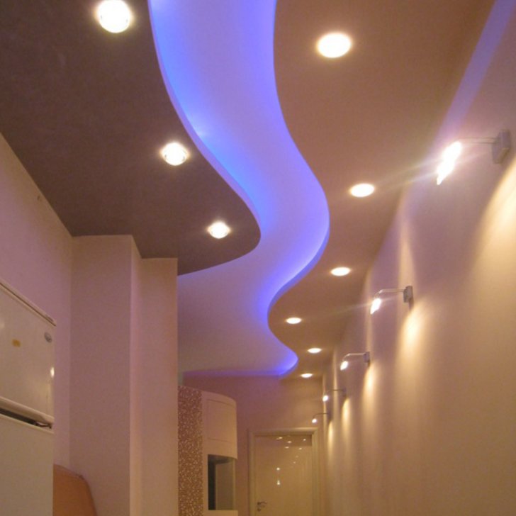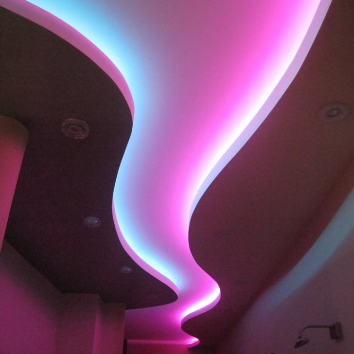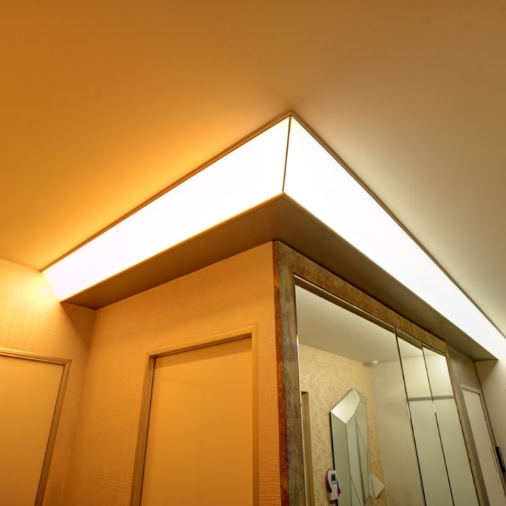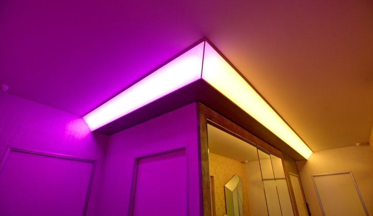 Один из самых распространённых способов реализации светодиодной подсветки - подсветка потолочного карниза из гипсокартона. В зависимости от цвета светодиодной ленты и её яркости, она может служить для основного освещения коридора или декоративной подсветки. Такая подсветка нередко комбинируется с точечными светильниками, в этом случае они служат источником основного света, а светодиодная лента - фонового или декоративного. Для такой подсветки нередко используется многоцветная светодиодная лента RGB, которая, при использовании вместе с RGB контроллером, позволяет получить тысячи разных цветов и оттенков.